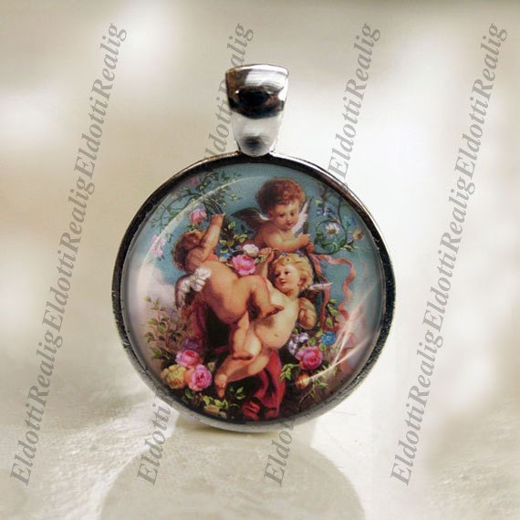 Angel And Cherubs Silvertone Medal Pendant Cabochon Religious Jewelry