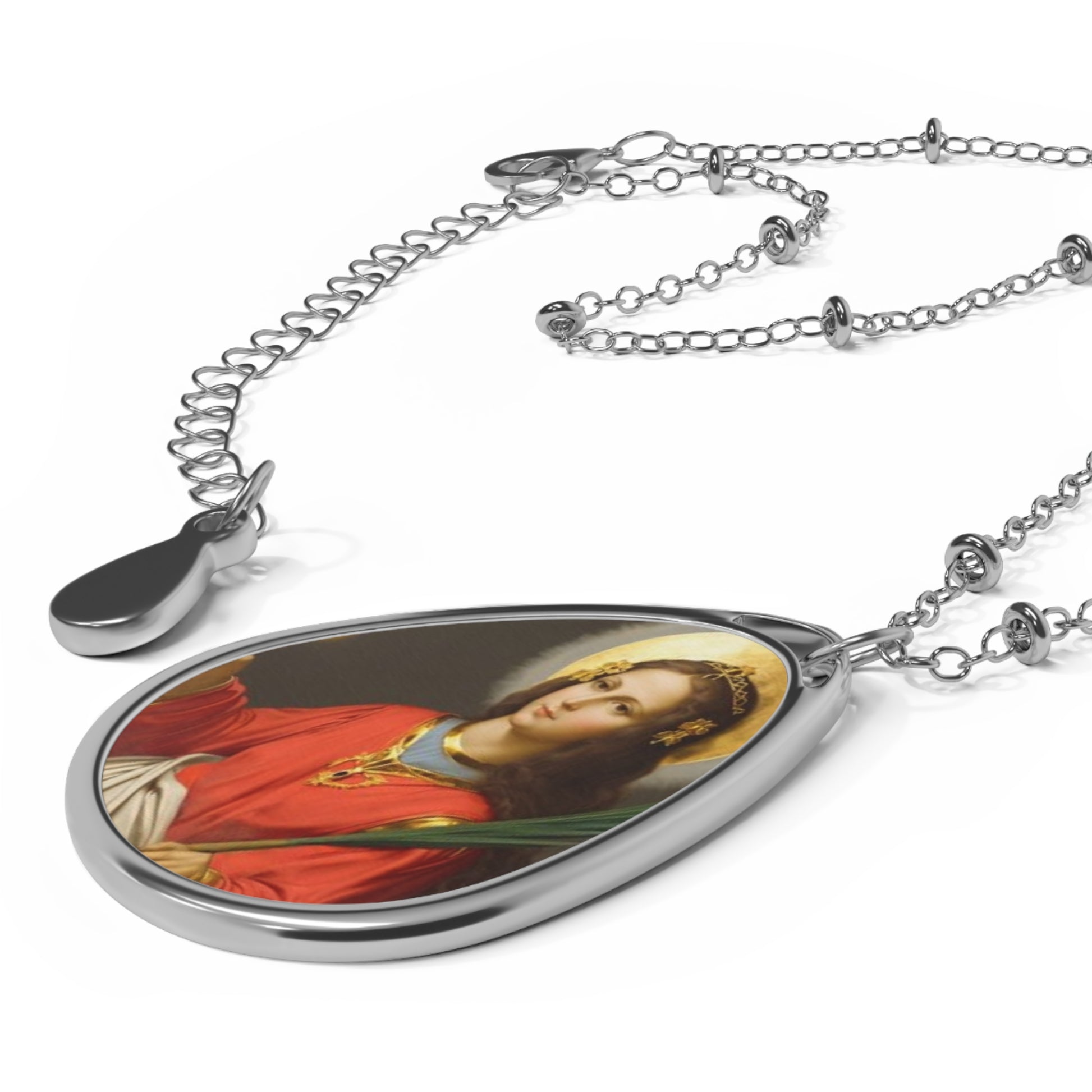 The pendant and chain are crafted from durable brass, offering a long-lasting, eye-catching shine. The image is printed on an aluminum panel and set in a uniquely shaped elliptical pendant.