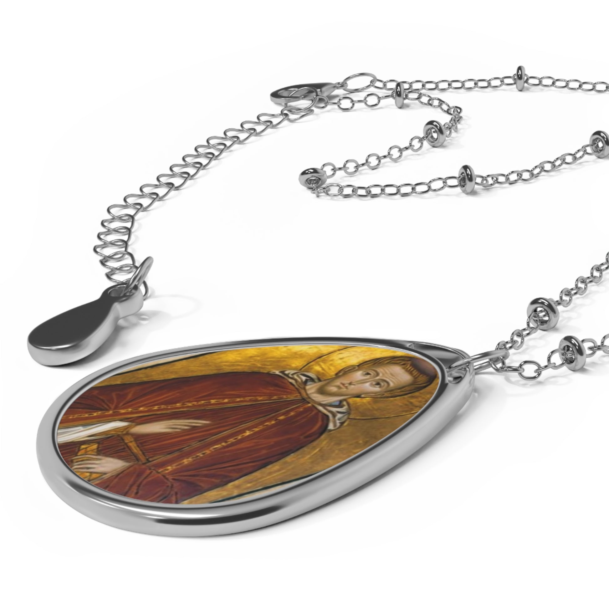 The pendant and chain are crafted from durable brass, offering a long-lasting, eye-catching shine. The image is printed on an aluminum panel and set in a uniquely shaped elliptical pendant.