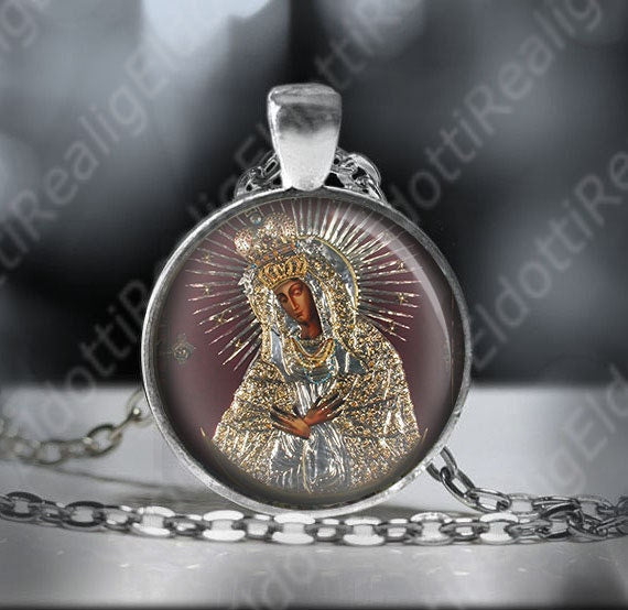 Black Madonna Our Lady of the Gate of Dawn Vilnius Catholic Necklace. Virgin Mary Religious Pendant Medal. Catholic Silvertone Necklace