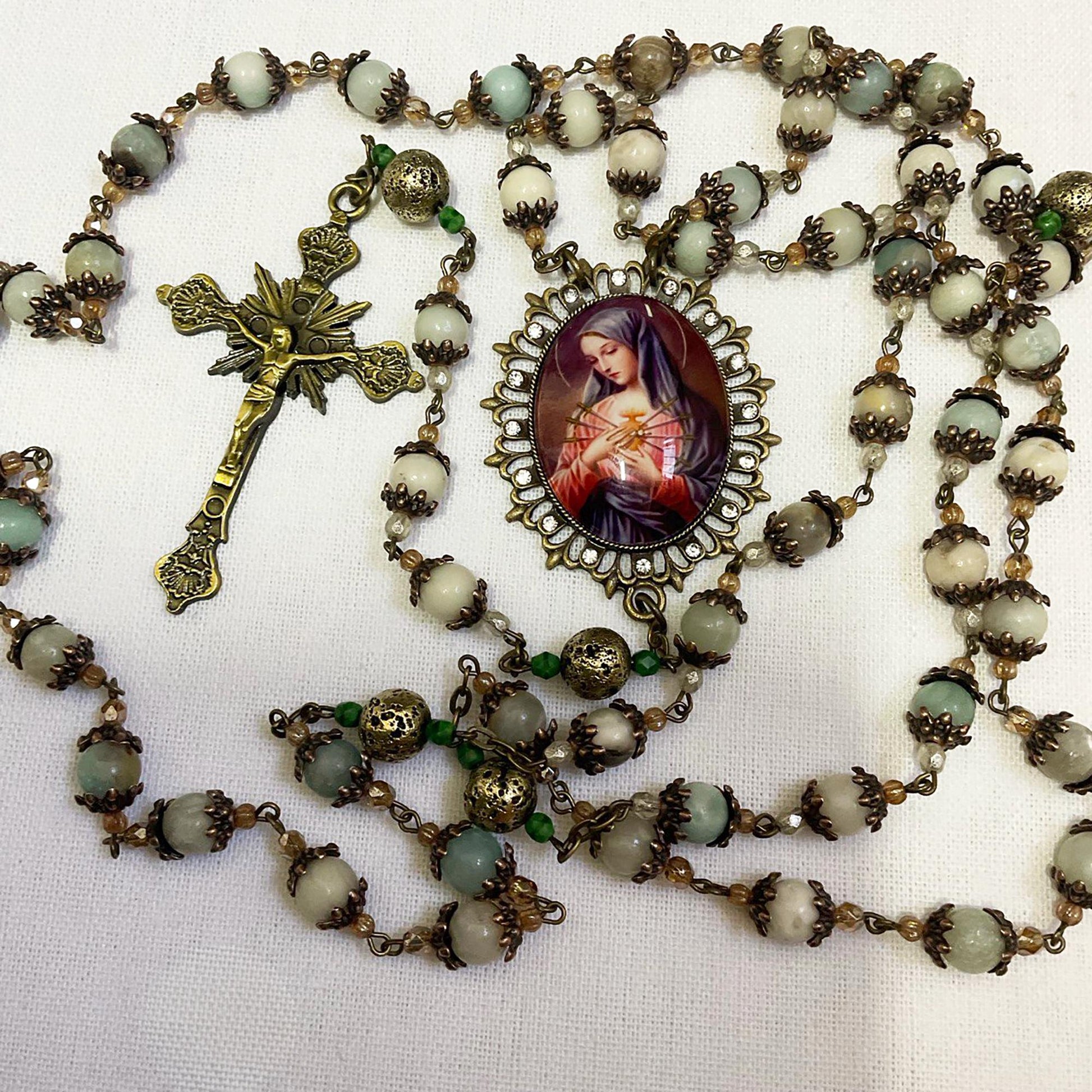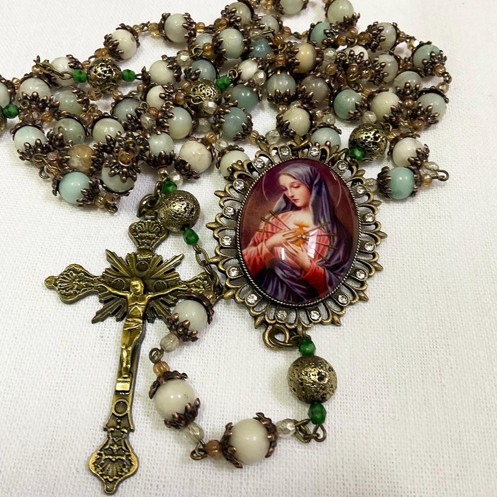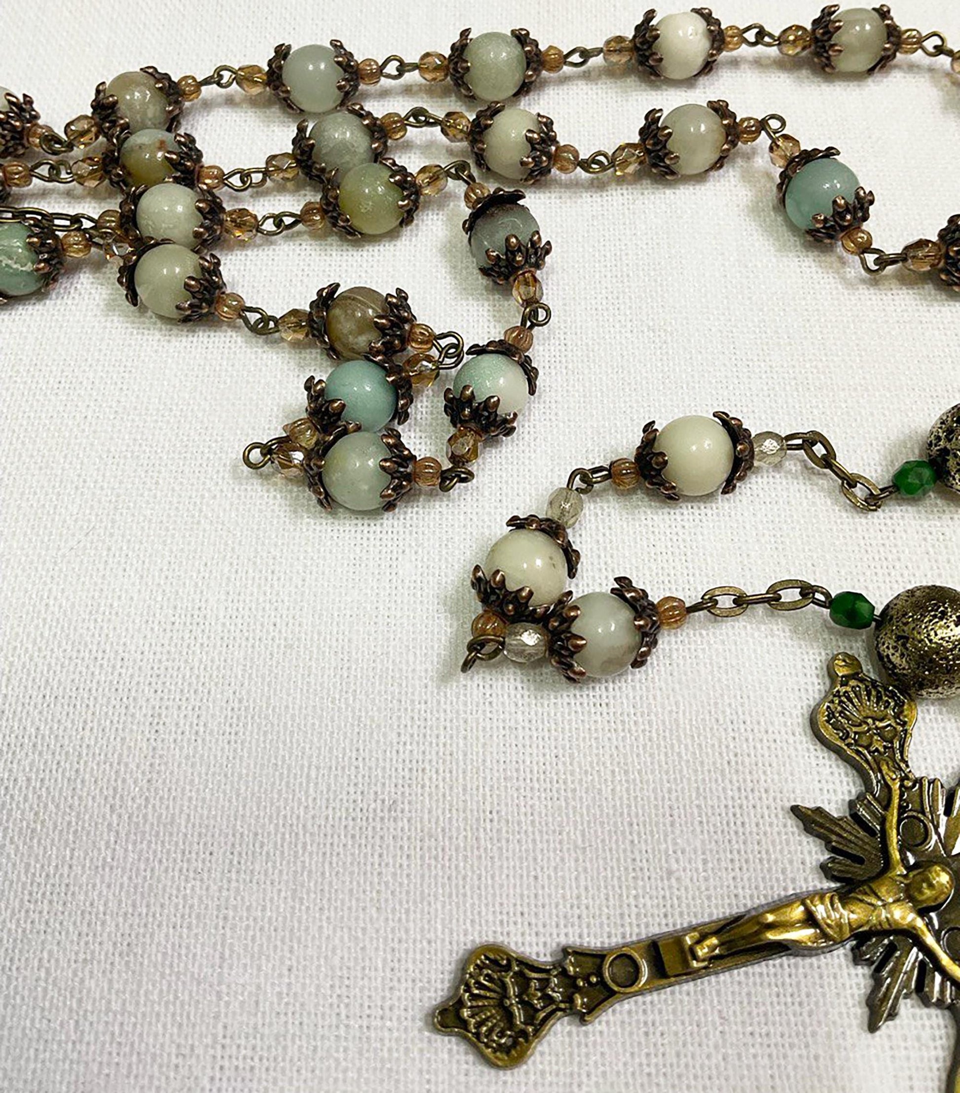 Catholic Heirloom Bronze Rosary Our Lady of Sorrows | Handmade with Amazonite Gemstones + Czech Glass Beads