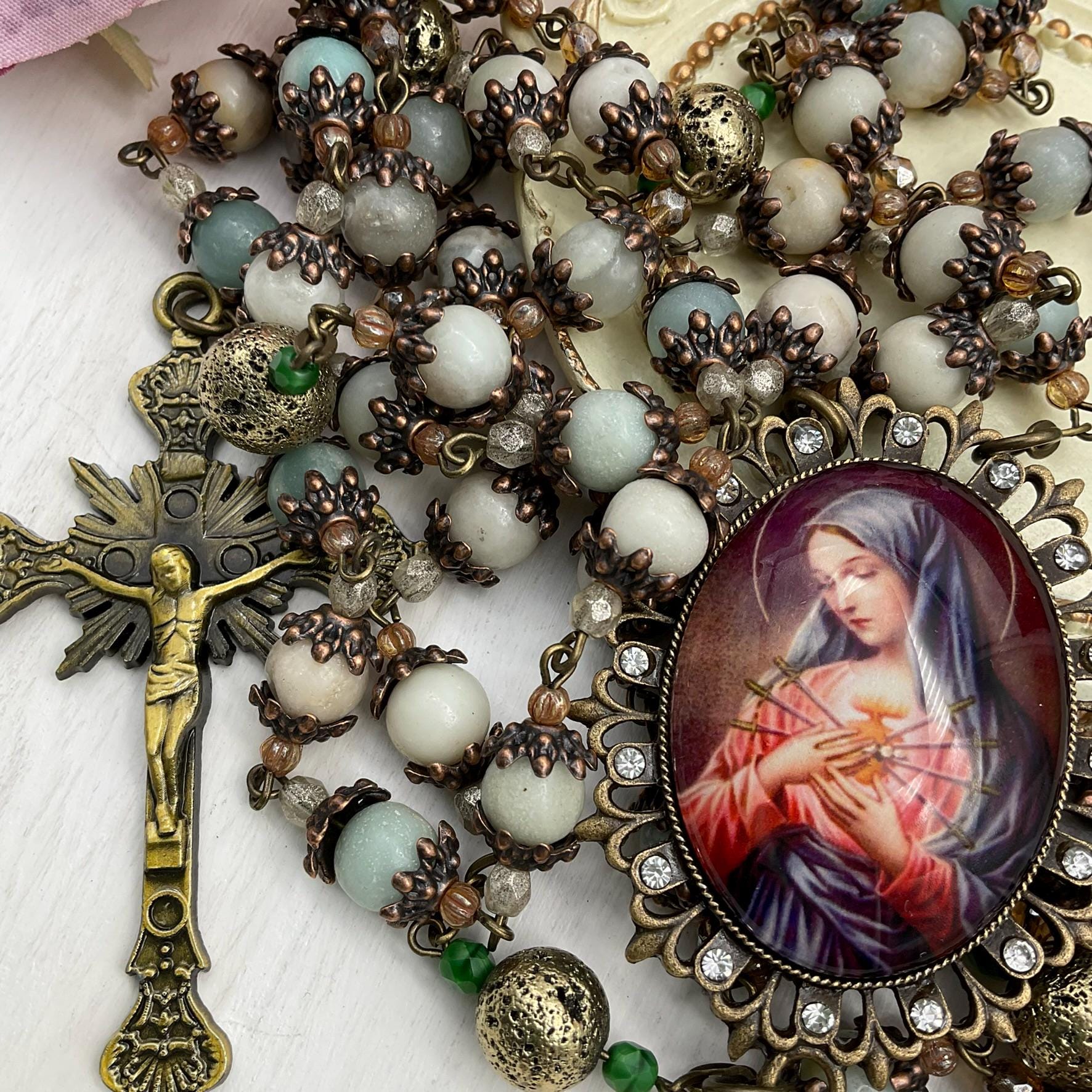 Catholic Heirloom Bronze Rosary Our Lady of Sorrows | Seven Sorrows of Mary | Handmade with Amazonite Gemstones + Czech Glass Beads