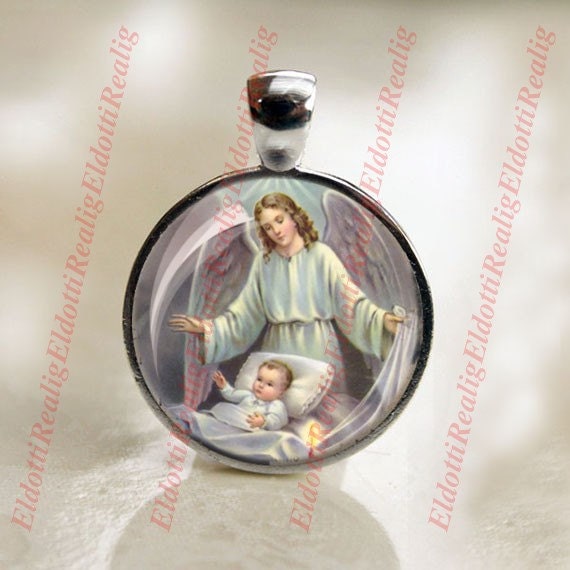 Guardian Angel - Catholic SIlvertone Medal Pendant /Charm Cabochon Religious Jewelry
