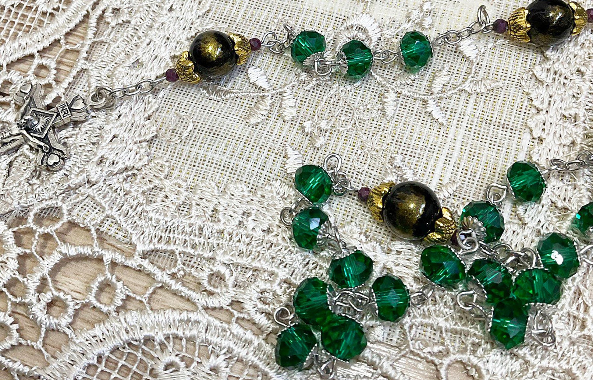 Handmade Rosary Our Lady of Czestochowa Green Glass Beads and Black Lapis Lazuli Jades Gemstones