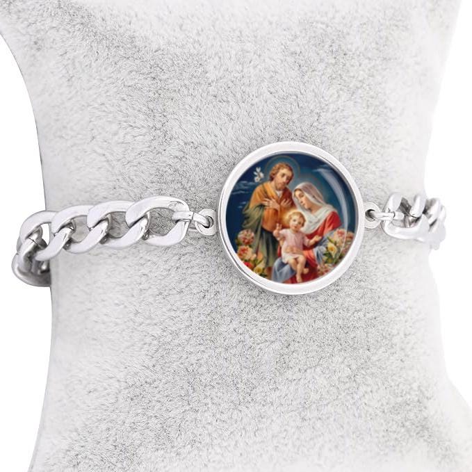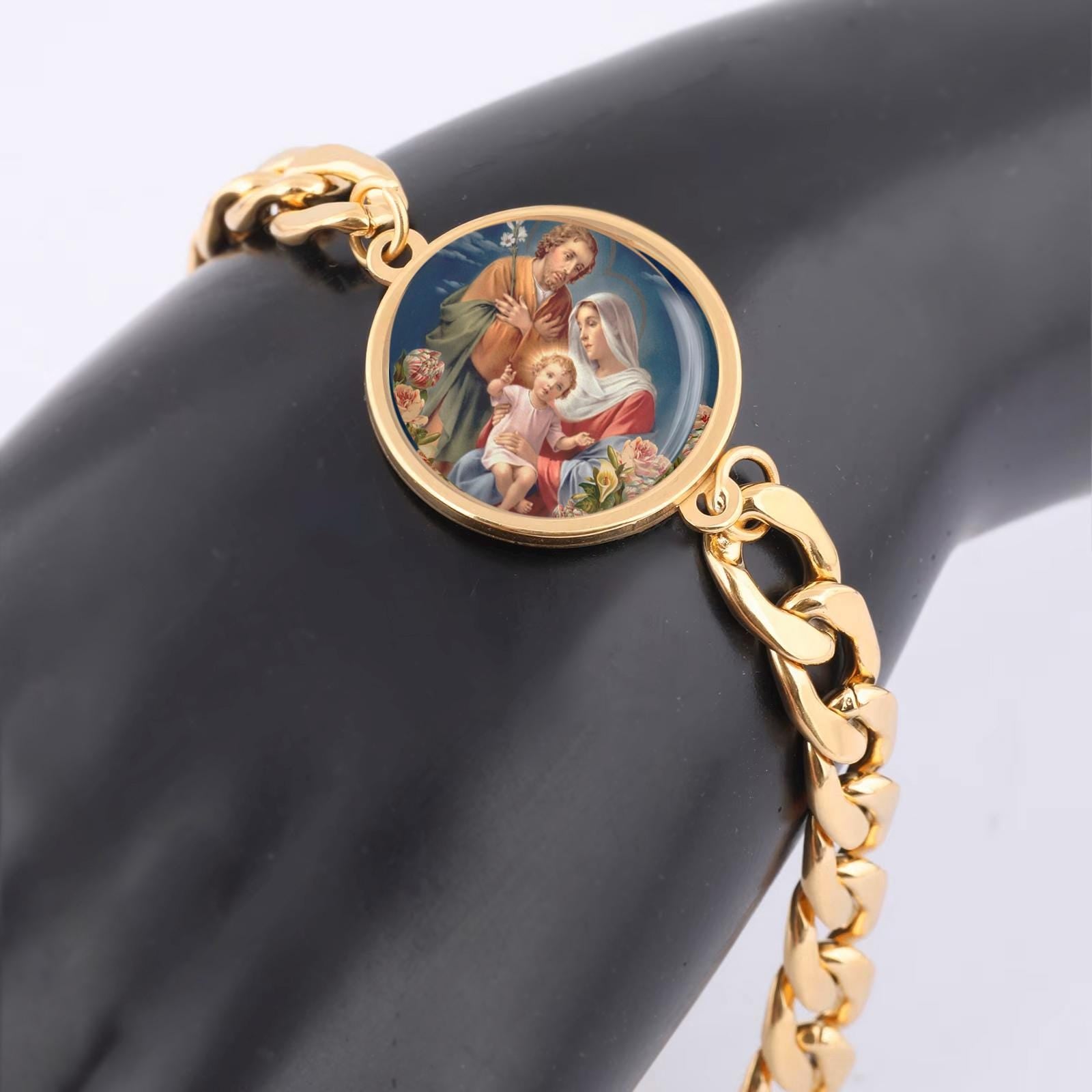 Holy Family Curb Bracelet Gold or Silver tone Religious Jewelry Simple Chain