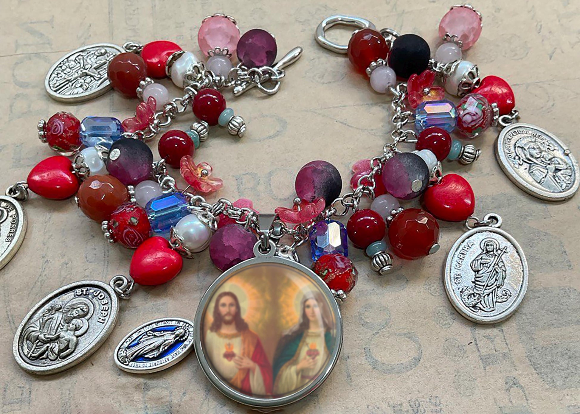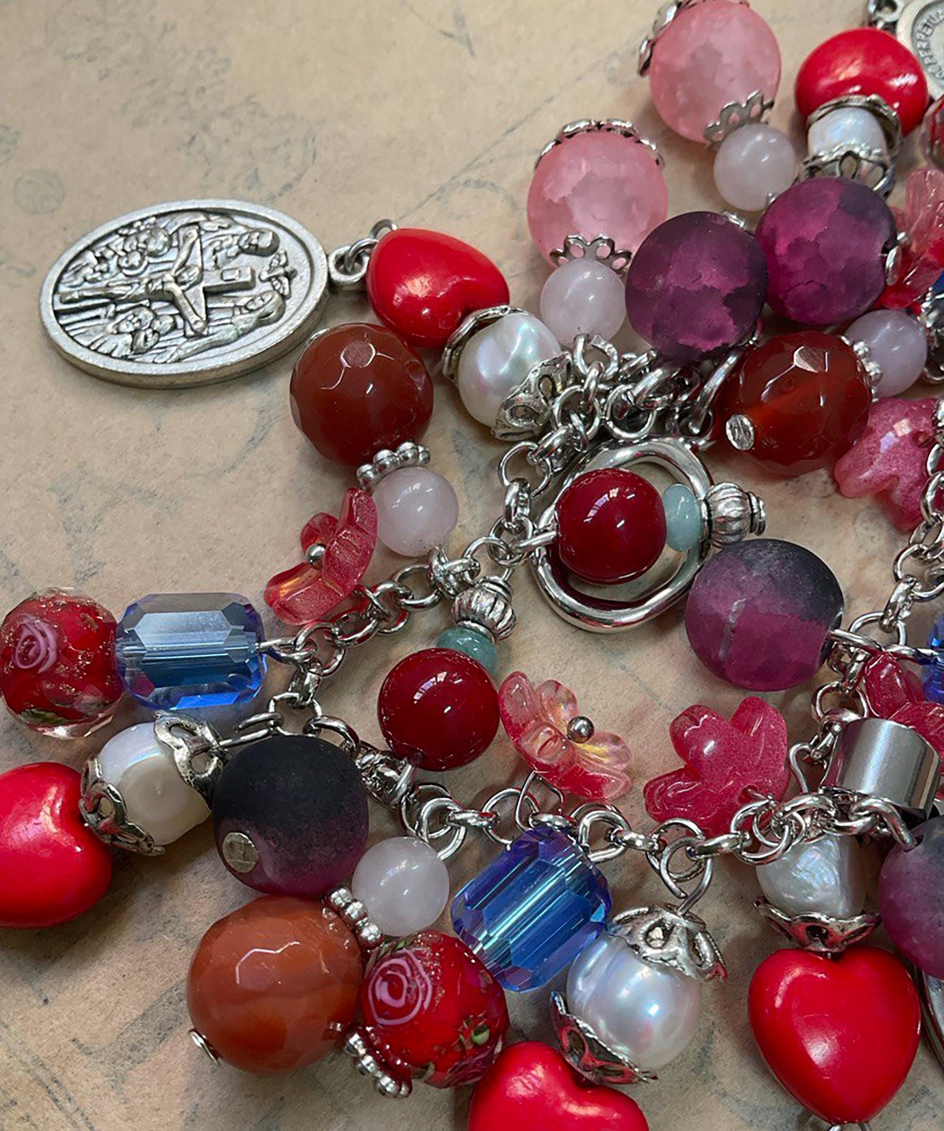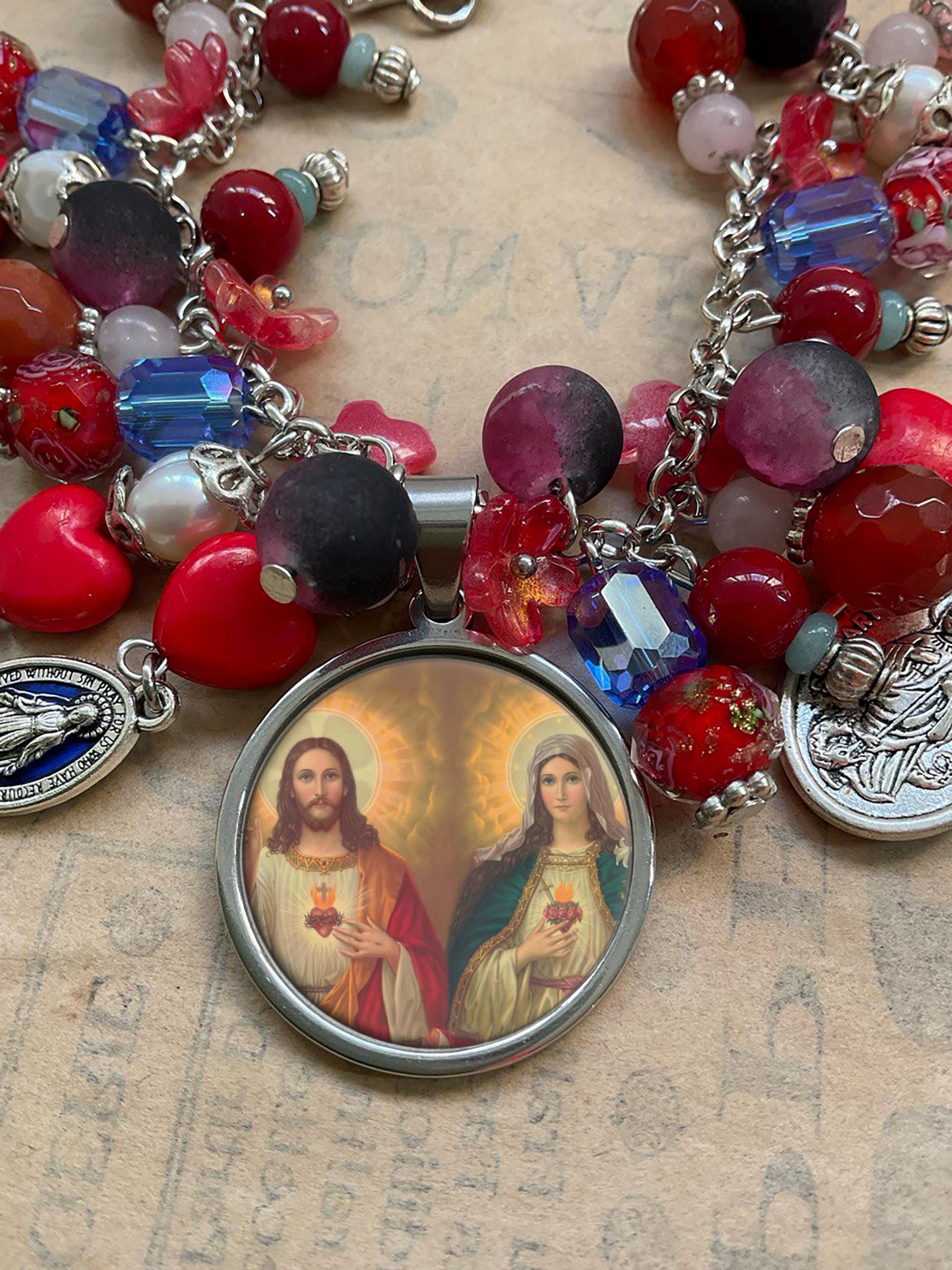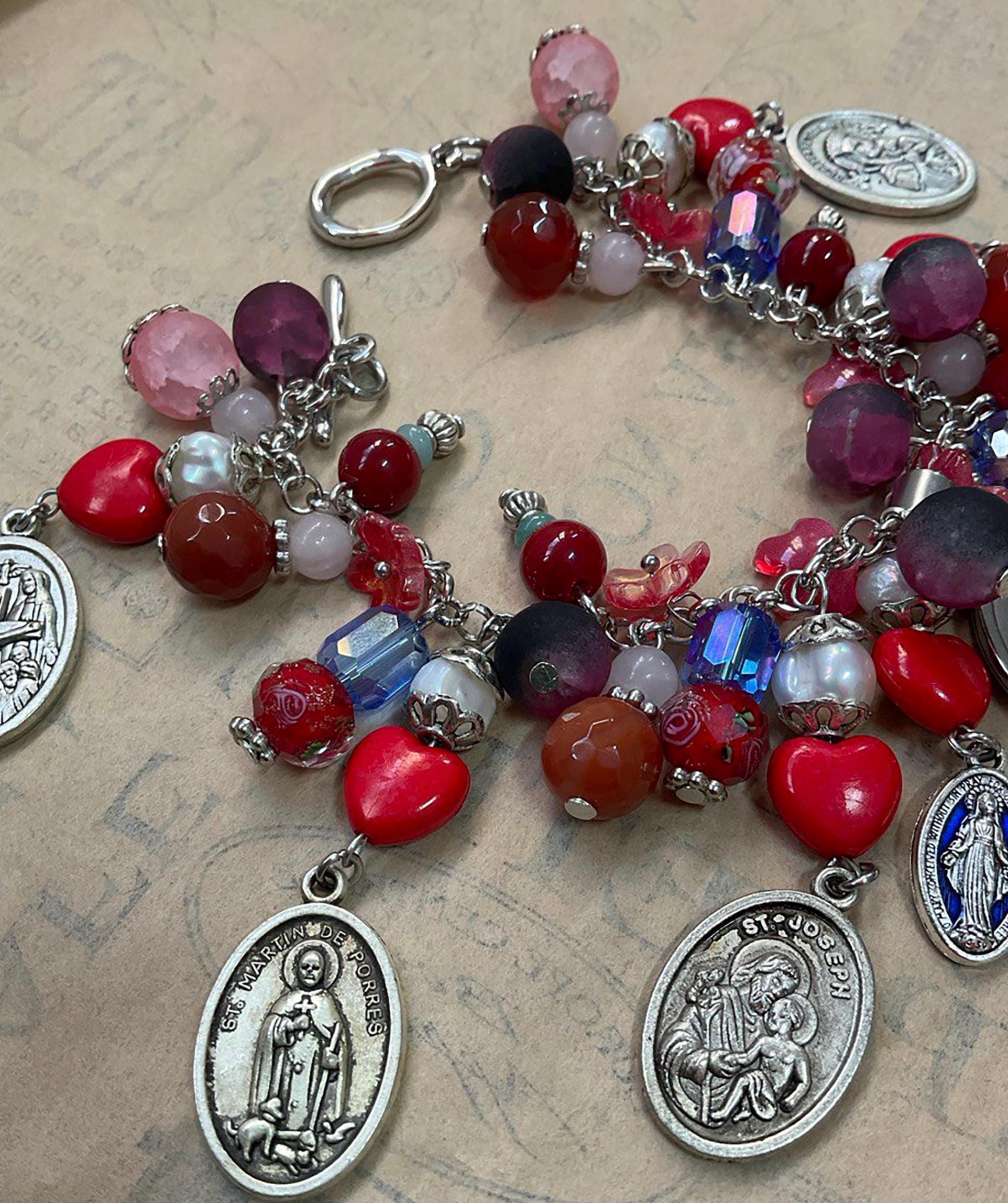 This lovingly handmade Catholic bracelet is dedicated to honoring the Immaculate Heart of Mary and the Sacred Heart of Jesus. The bracelet is available in various sizes — please choose the length that best fits your wrist. *6mm natural freshwater pearls *10x12mm red heart-shaped beads, *10mm Lampwork beads, *10mm flower glass beads, *12mm faceted red Carnelian, *12mm rectangle glass beads, and various Saint medals, making it a truly special and meaningful piece. This bracelet comes beautifully packaged in a soft velvet jewelry bag, making it perfect for gifting or safekeeping. Explore more pendants, necklaces, rosaries, and bracelets in my store.