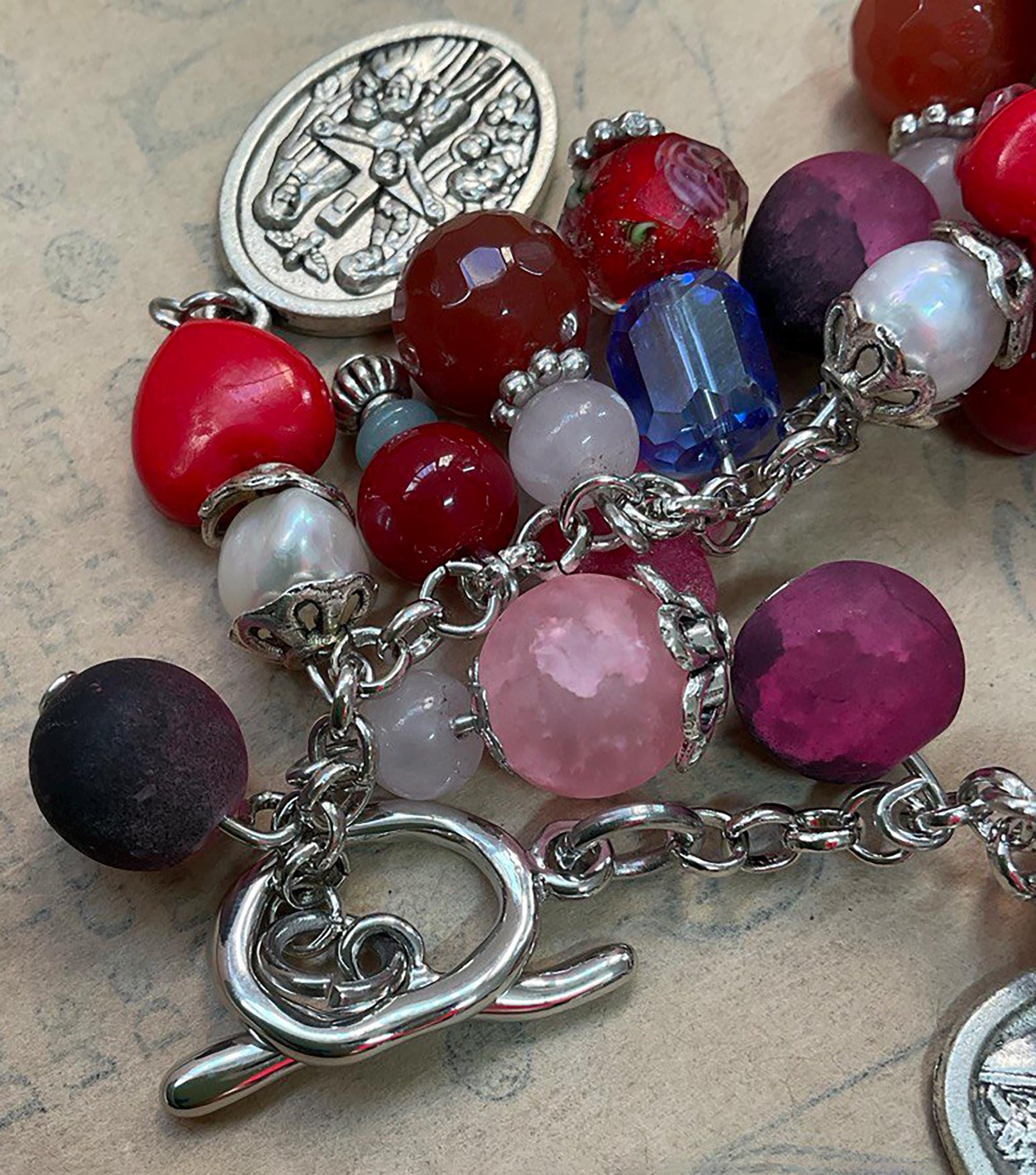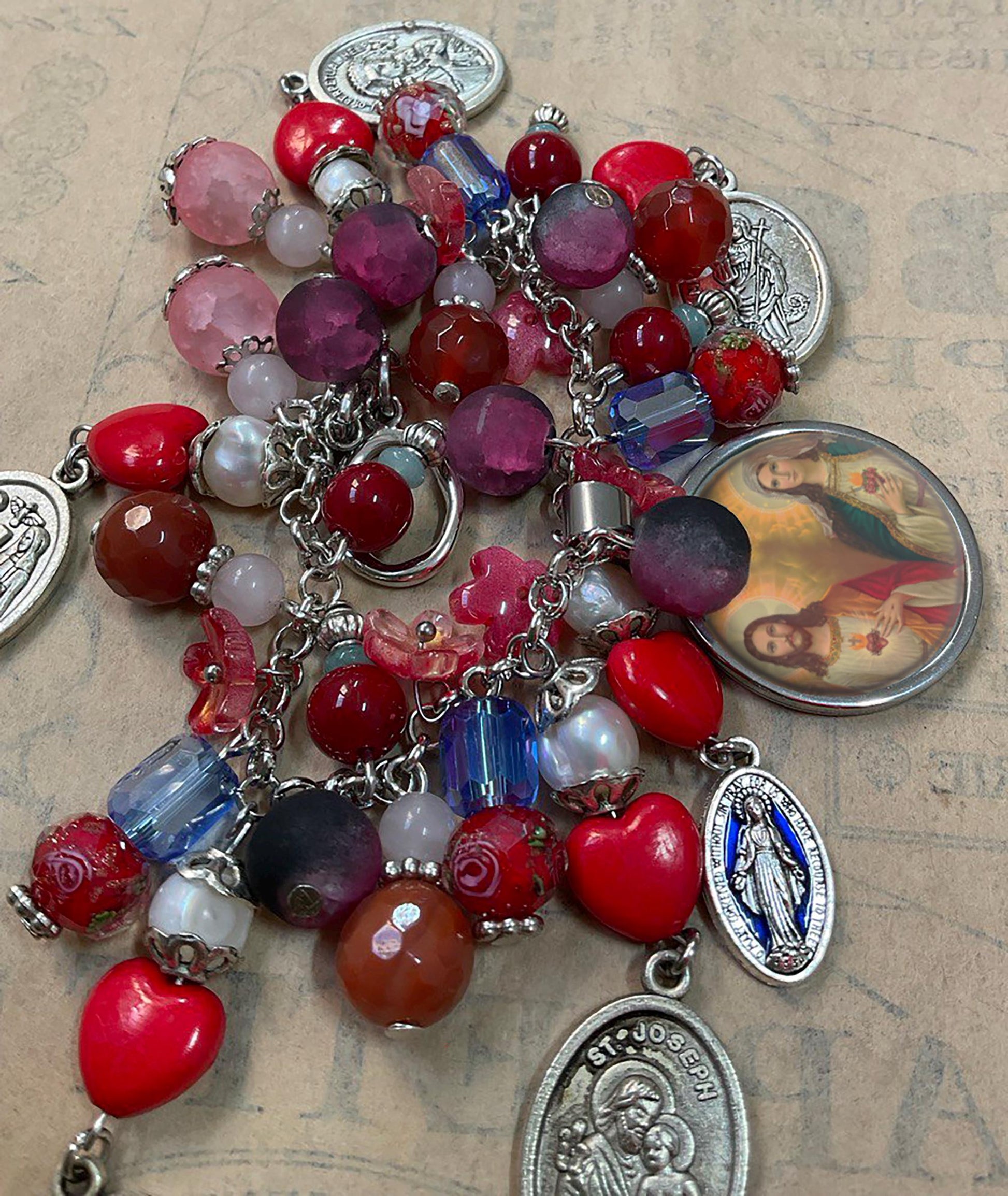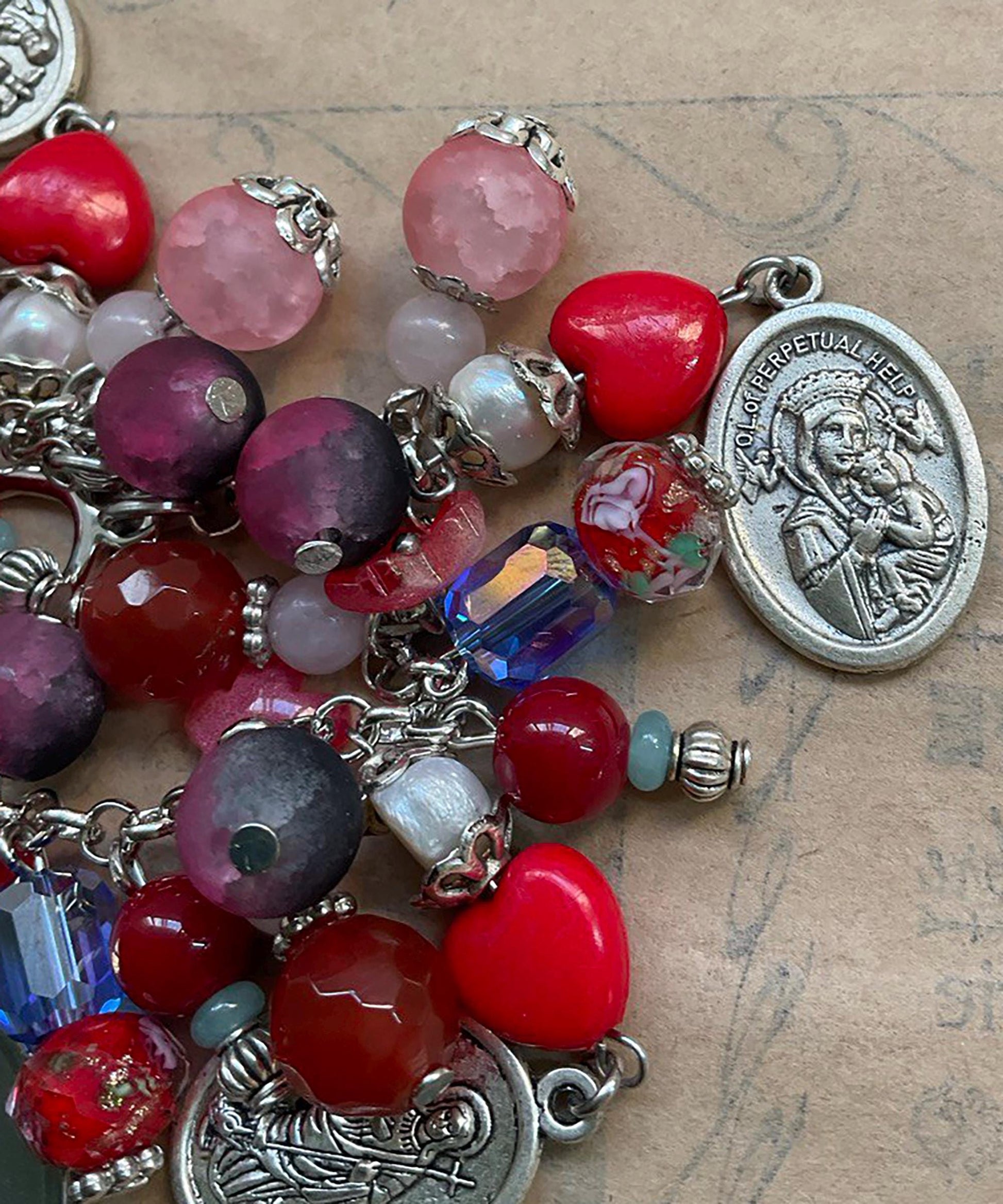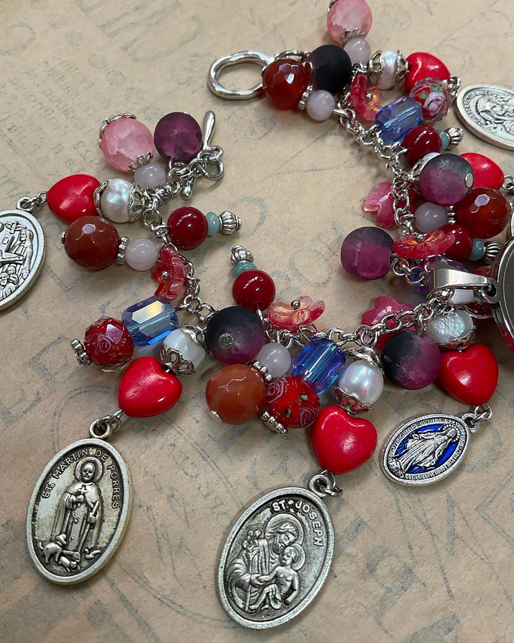 This lovingly handmade Catholic bracelet is dedicated to honoring the Immaculate Heart of Mary and the Sacred Heart of Jesus. The bracelet is available in various sizes — please choose the length that best fits your wrist. *6mm natural freshwater pearls *10x12mm red heart-shaped beads, *10mm Lampwork beads, *10mm flower glass beads, *12mm faceted red Carnelian, *12mm rectangle glass beads, and various Saint medals, making it a truly special and meaningful piece. This bracelet comes beautifully packaged in a soft velvet jewelry bag, making it perfect for gifting or safekeeping. Explore more pendants, necklaces, rosaries, and bracelets in my store.