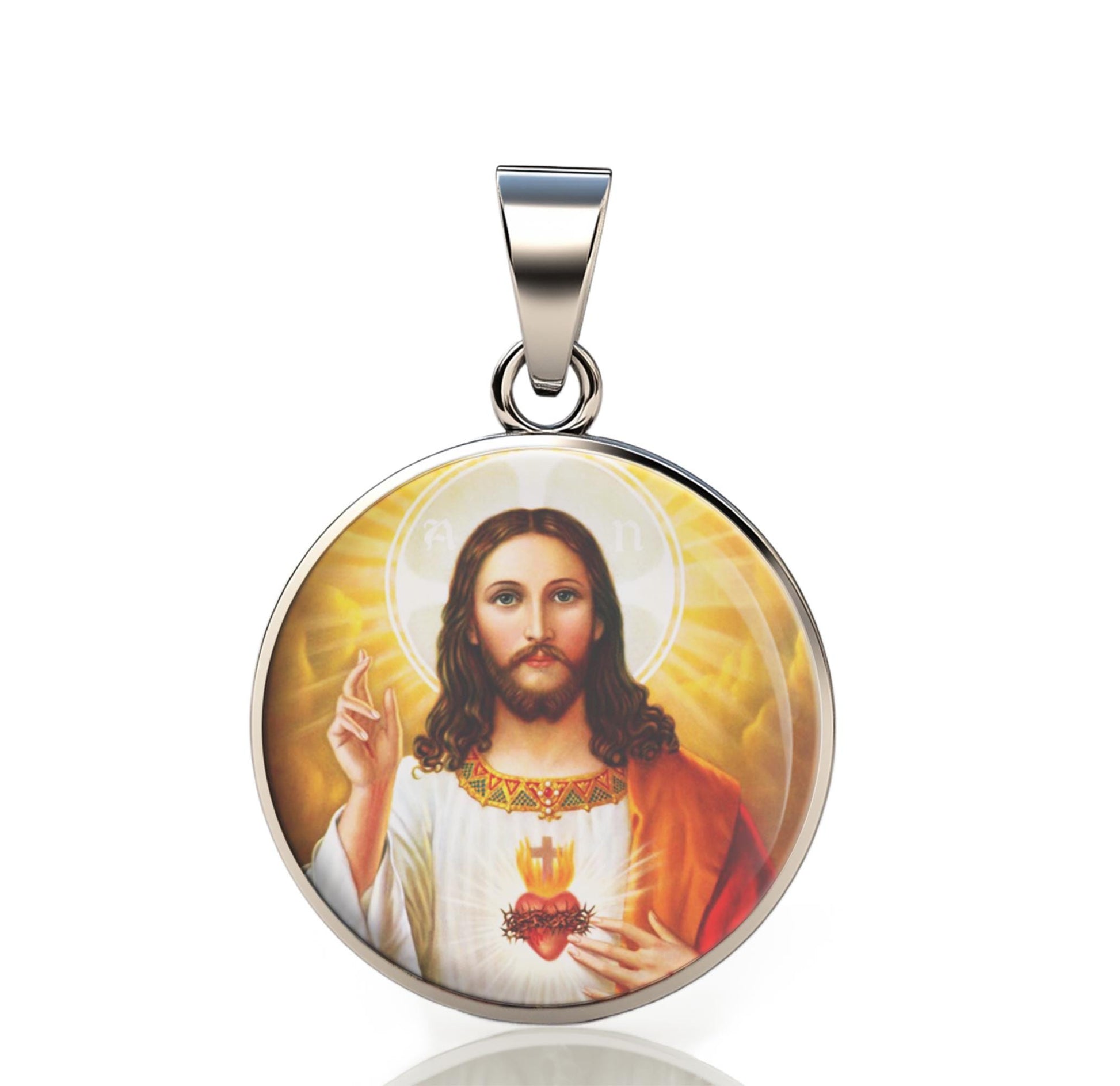 Jesus Our Lord Sacred Heart 925 Sterling Silver Round Pendant Christian Religious Medal Small 20mm