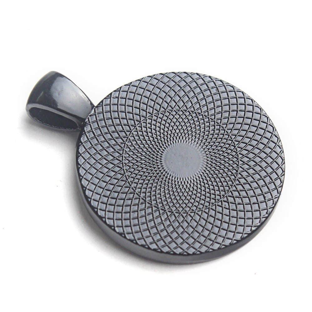 The necklace features an intriguing black setting with center piece that sets inside a glistening black-plated stainless steel frame.
