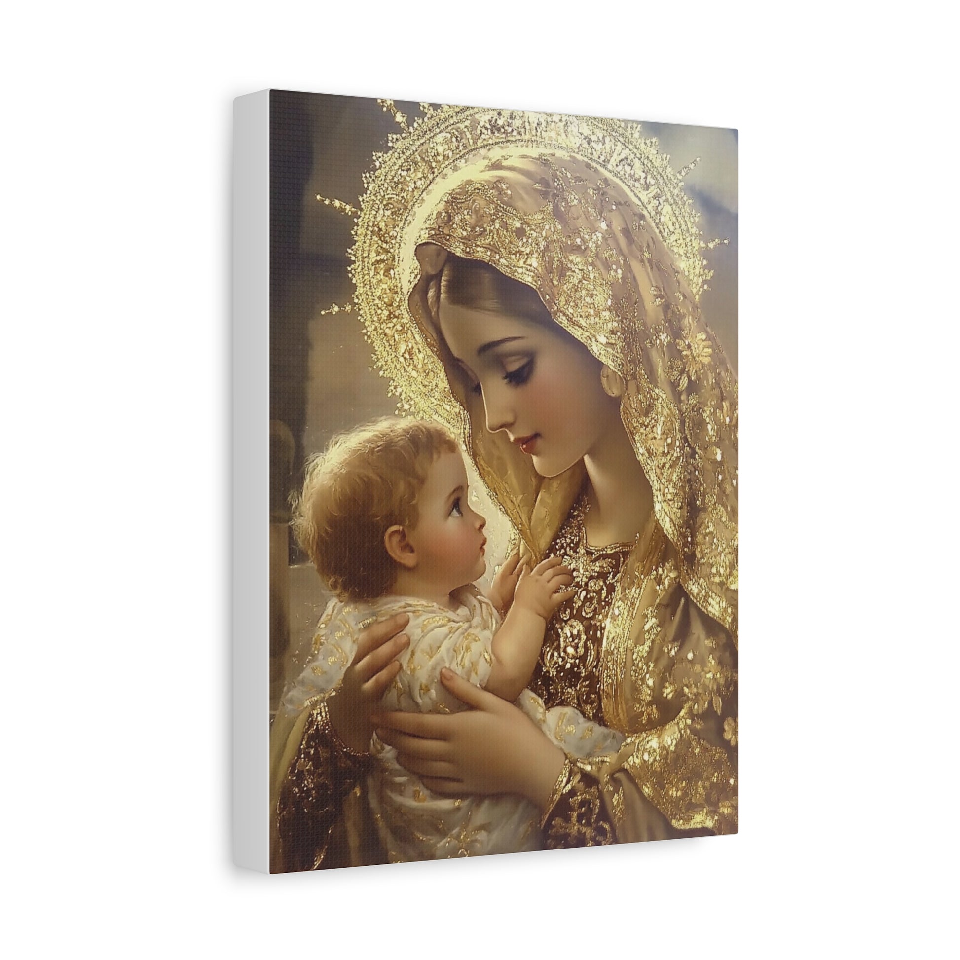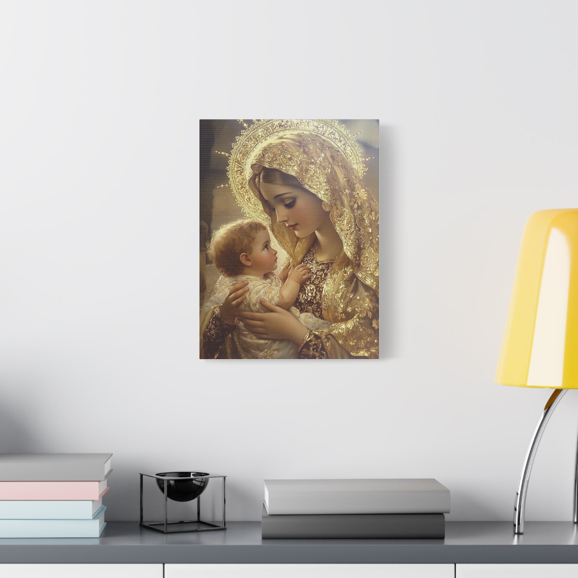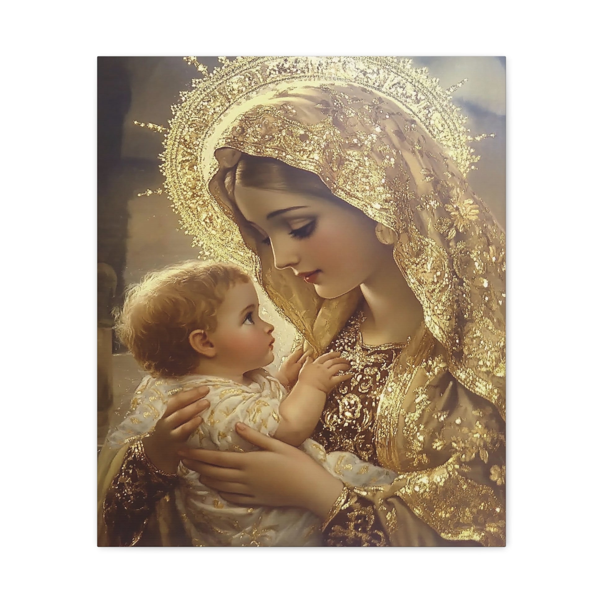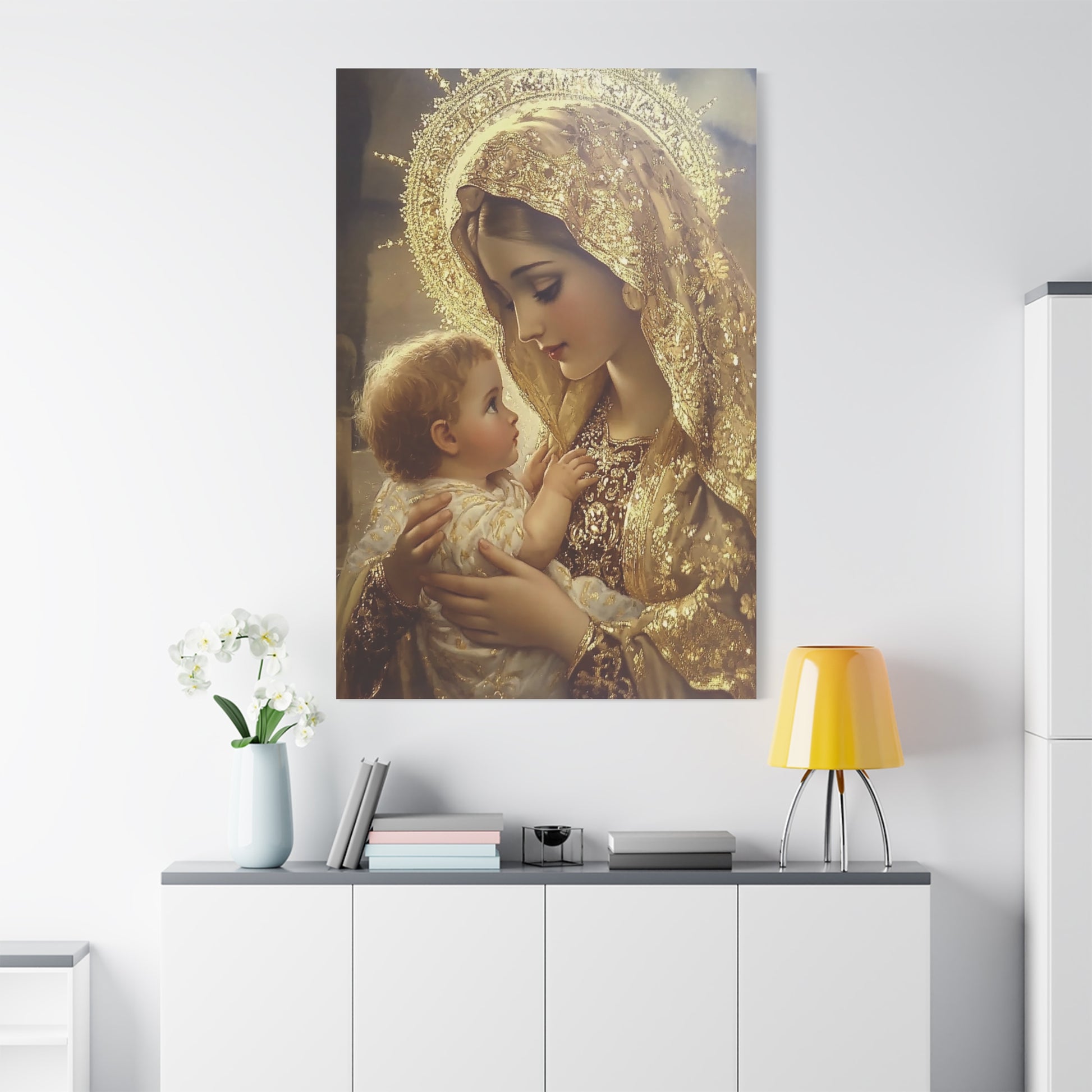 Mary and Baby in Gold Catholic Canvas Wall Art, Christian Decor
