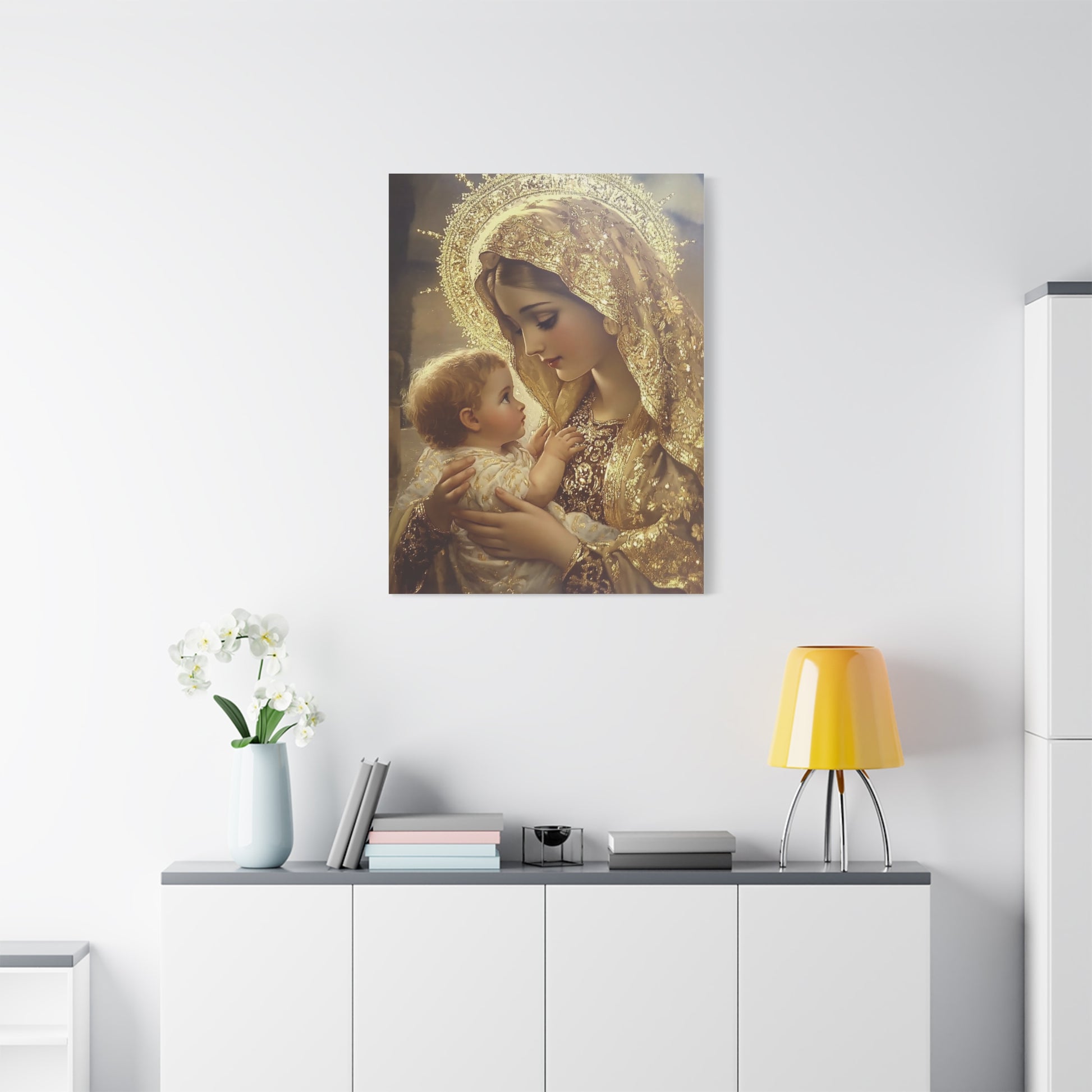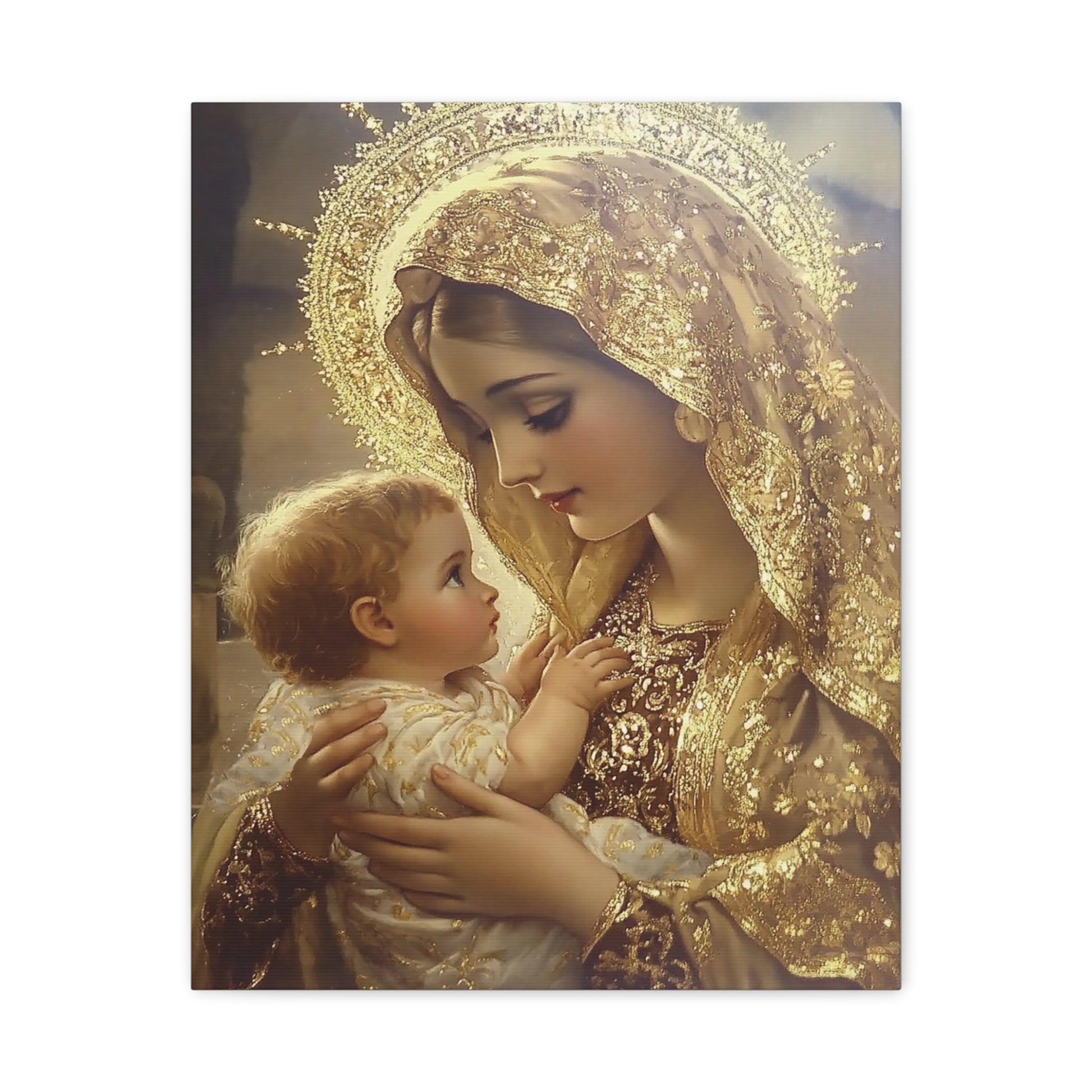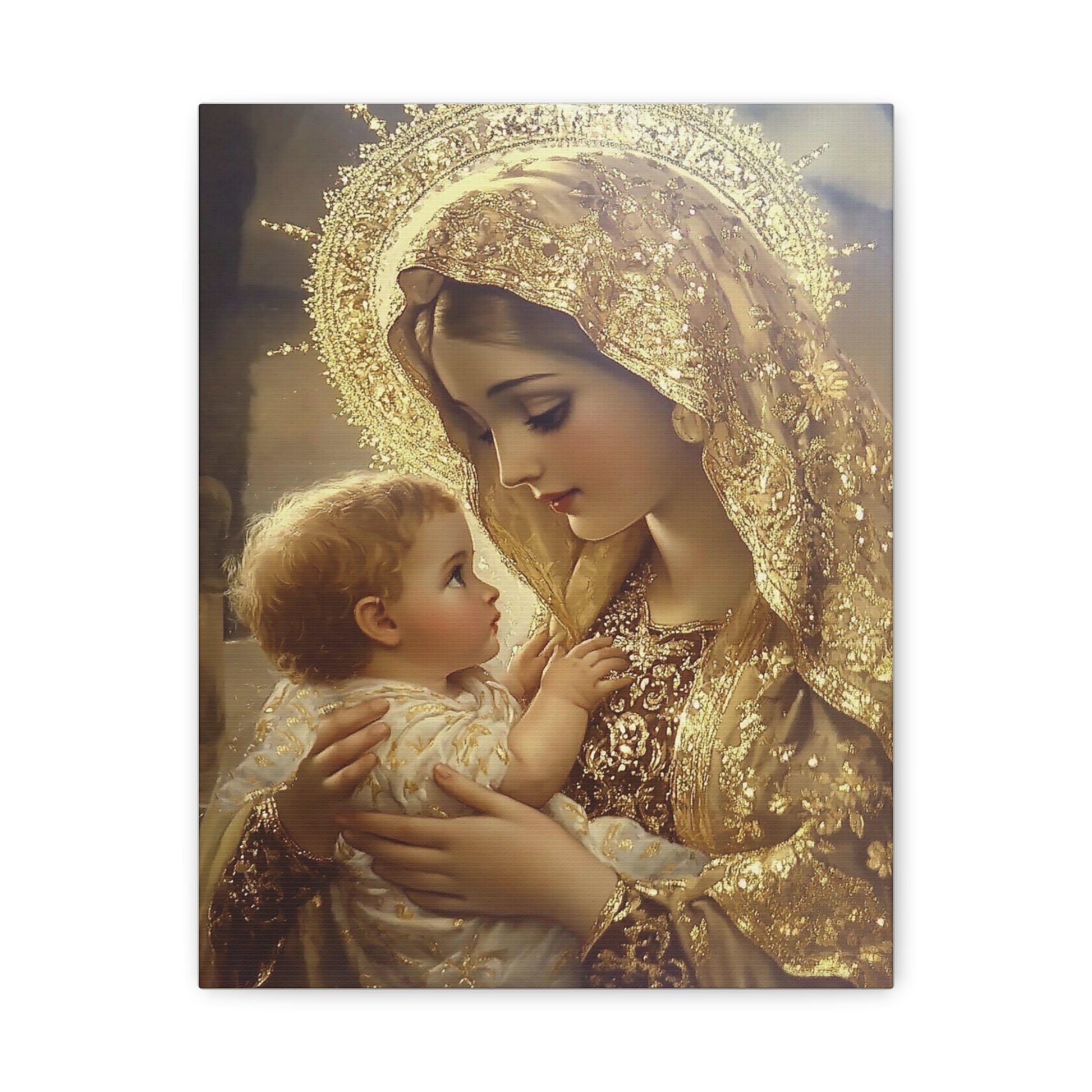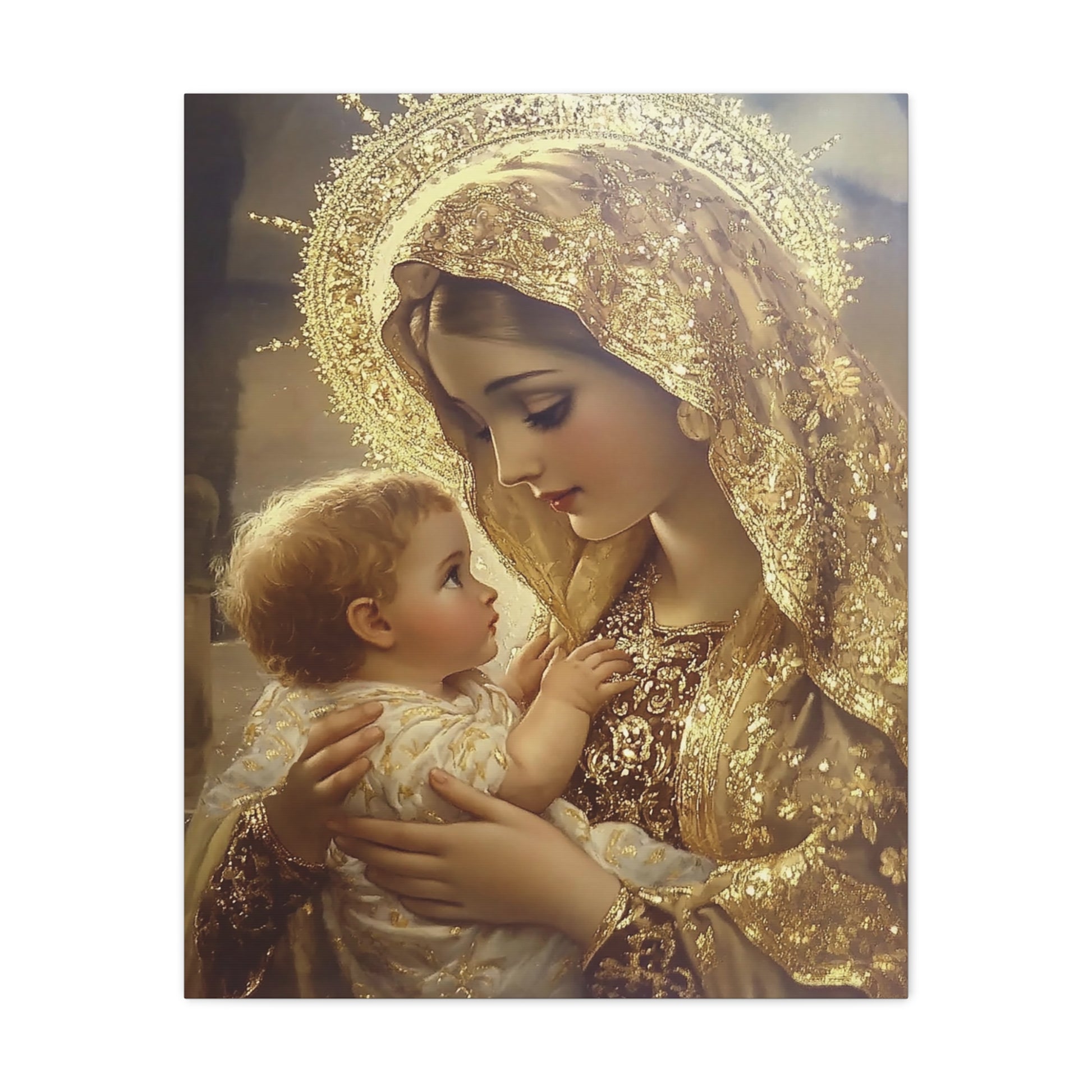 Mary and Baby in Gold Catholic Canvas Wall Art, Christian Decor
