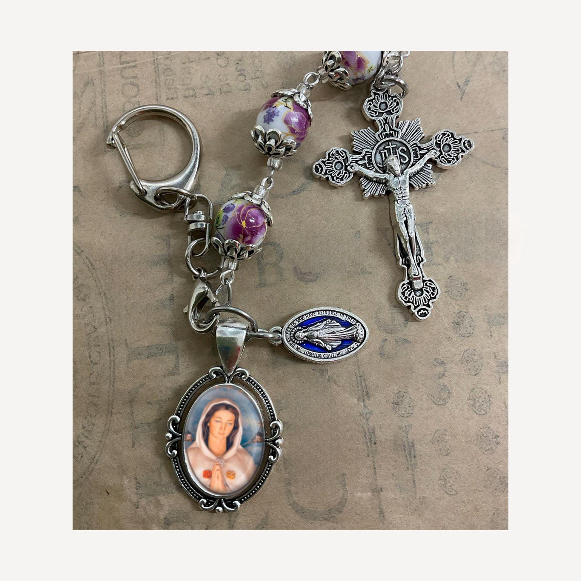 Miraculous Medal Three Hail Mary Chaplet Our Lady Rosa Mystica With Stunning Ceramic Floral beads Devotional Medal Crucifix and Keychain
