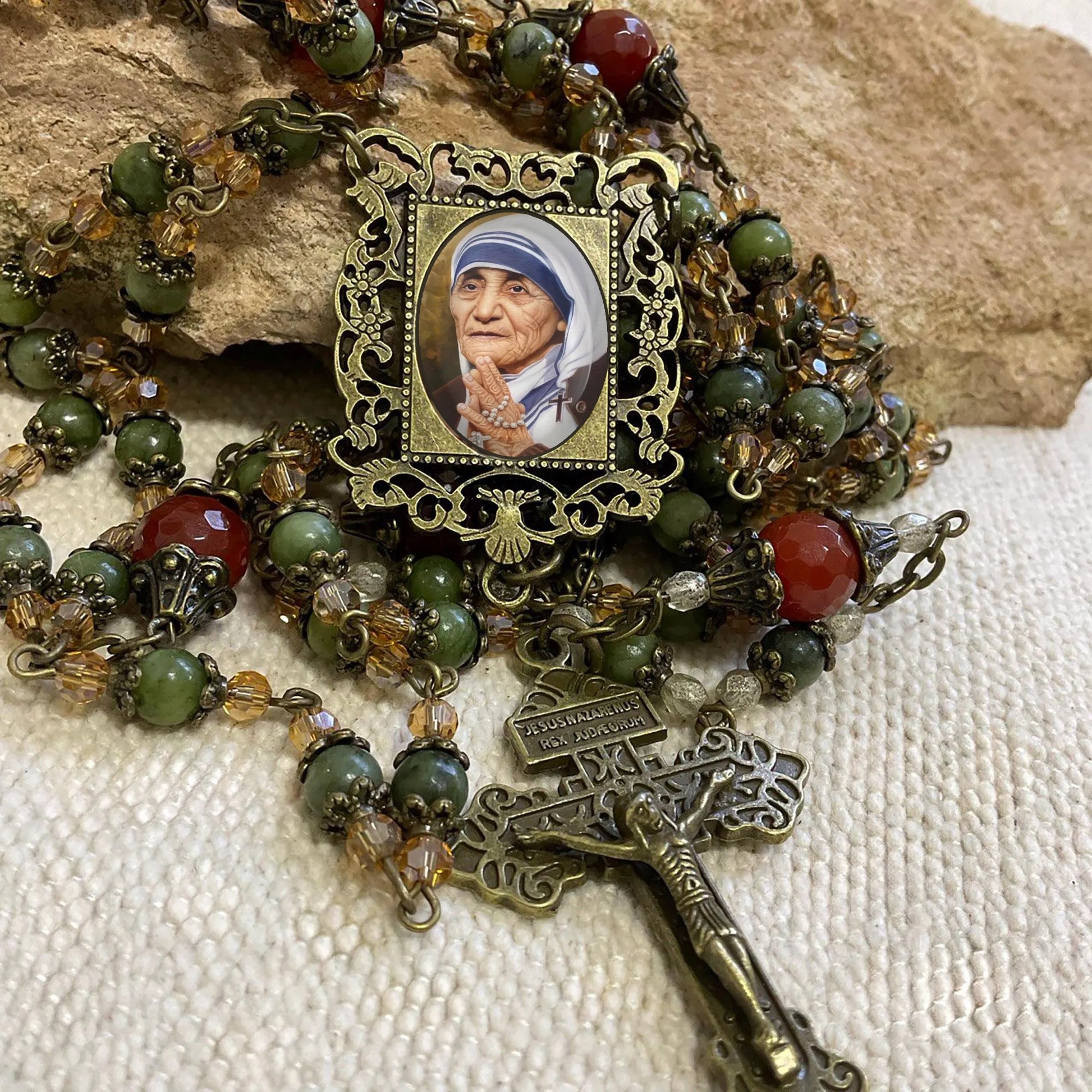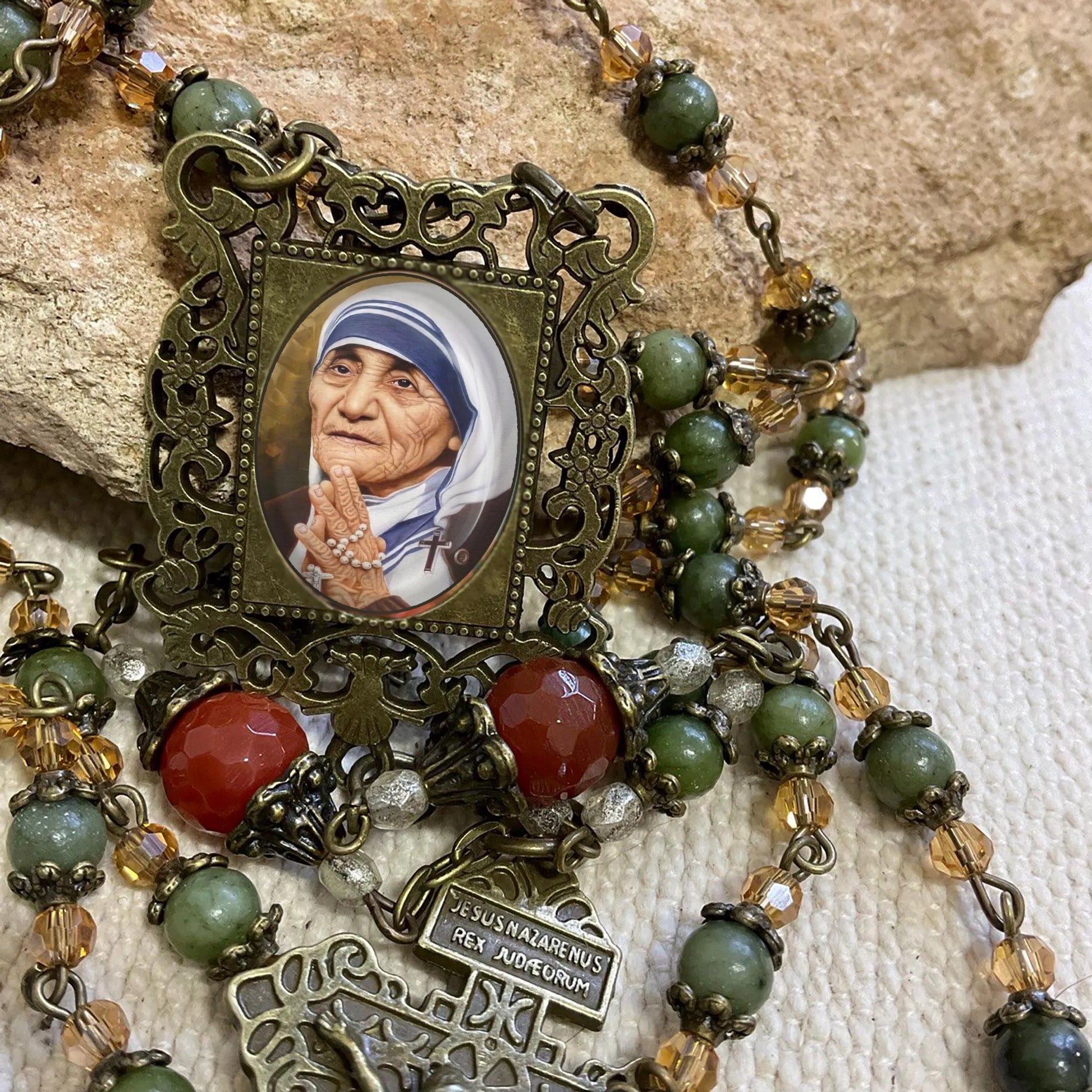 Mother Teresa Rosary - Prayer Beads with Jade Gemstones & Bronze Crucifix