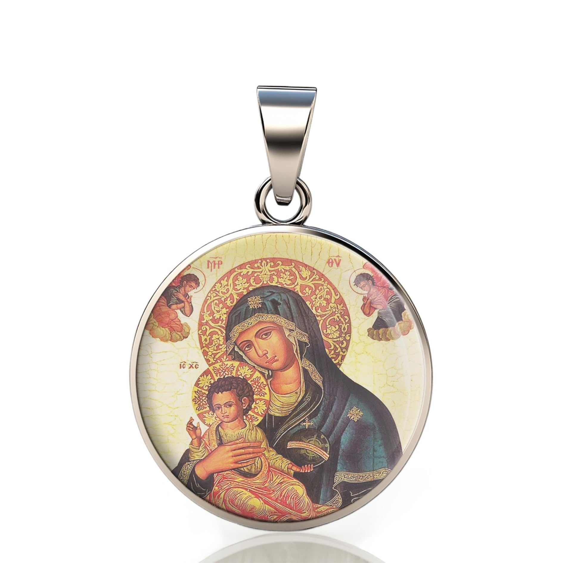 Our Lady Greek Orthodox Virgin Mary Icon 925 Sterling Silver Round Pendant Christian Religious Medal Small 20mm