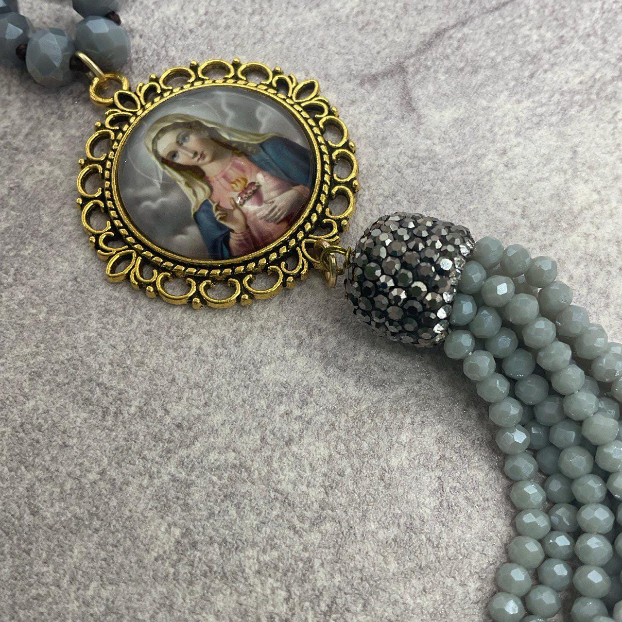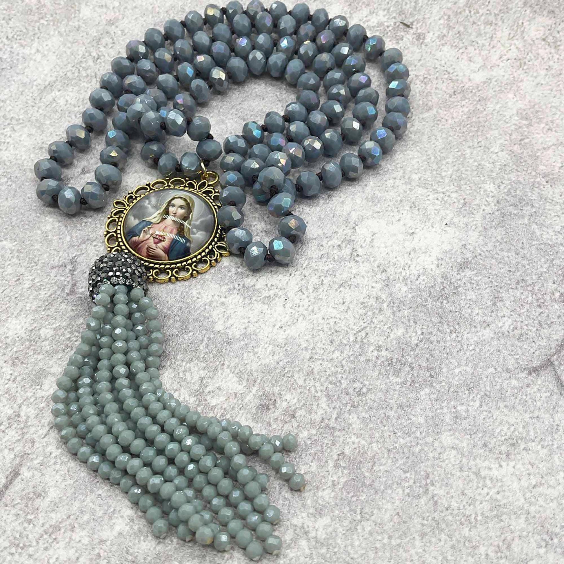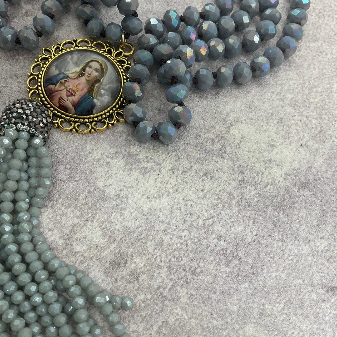 Our Lady Immaculate Heart - Purple Gray Czech Glass Beads - Long Necklace Sautoir - Virgin Mary Pendant and Tassel
