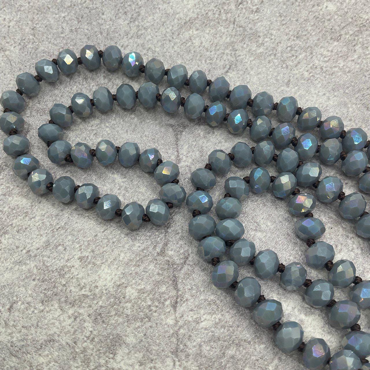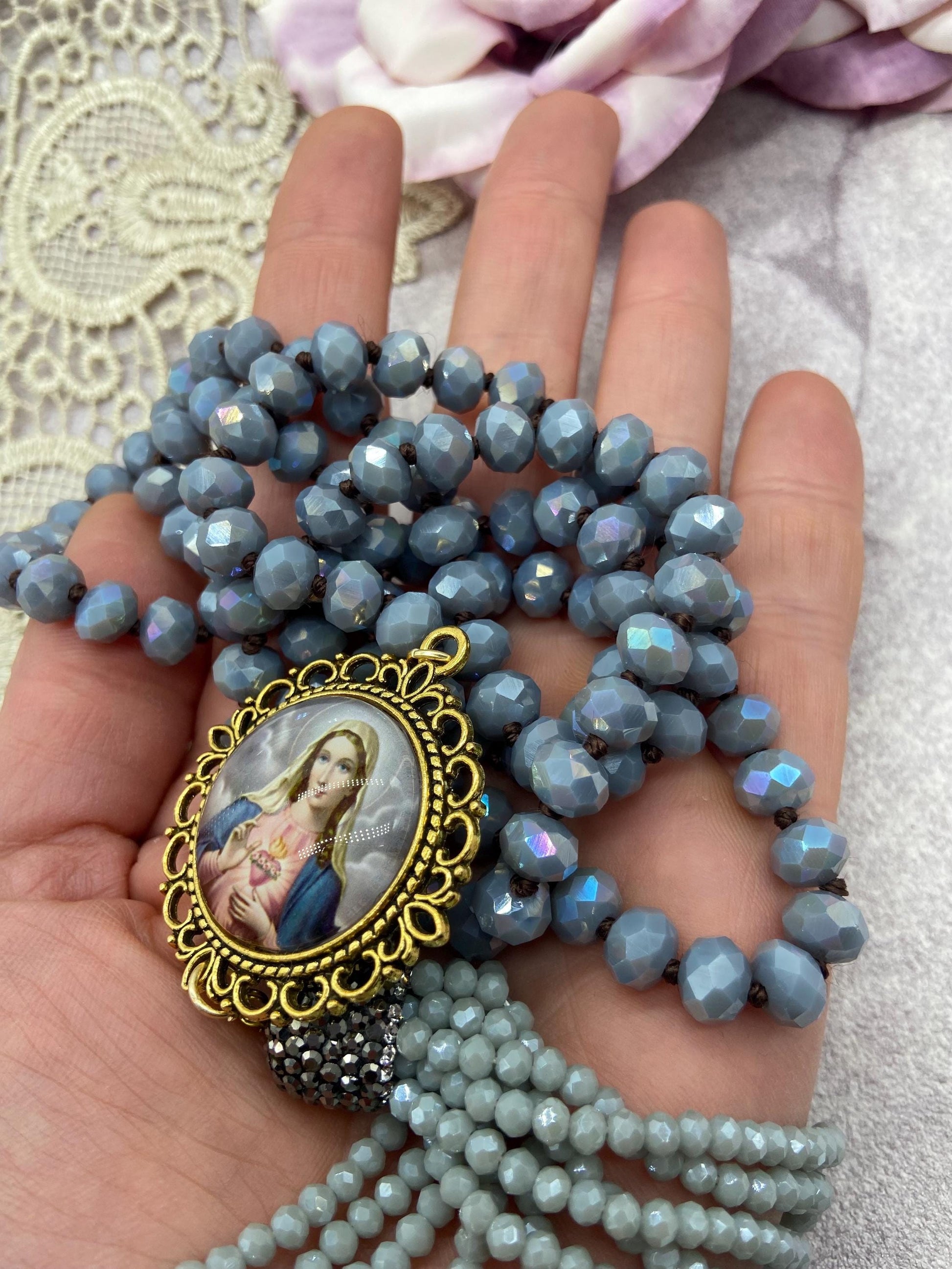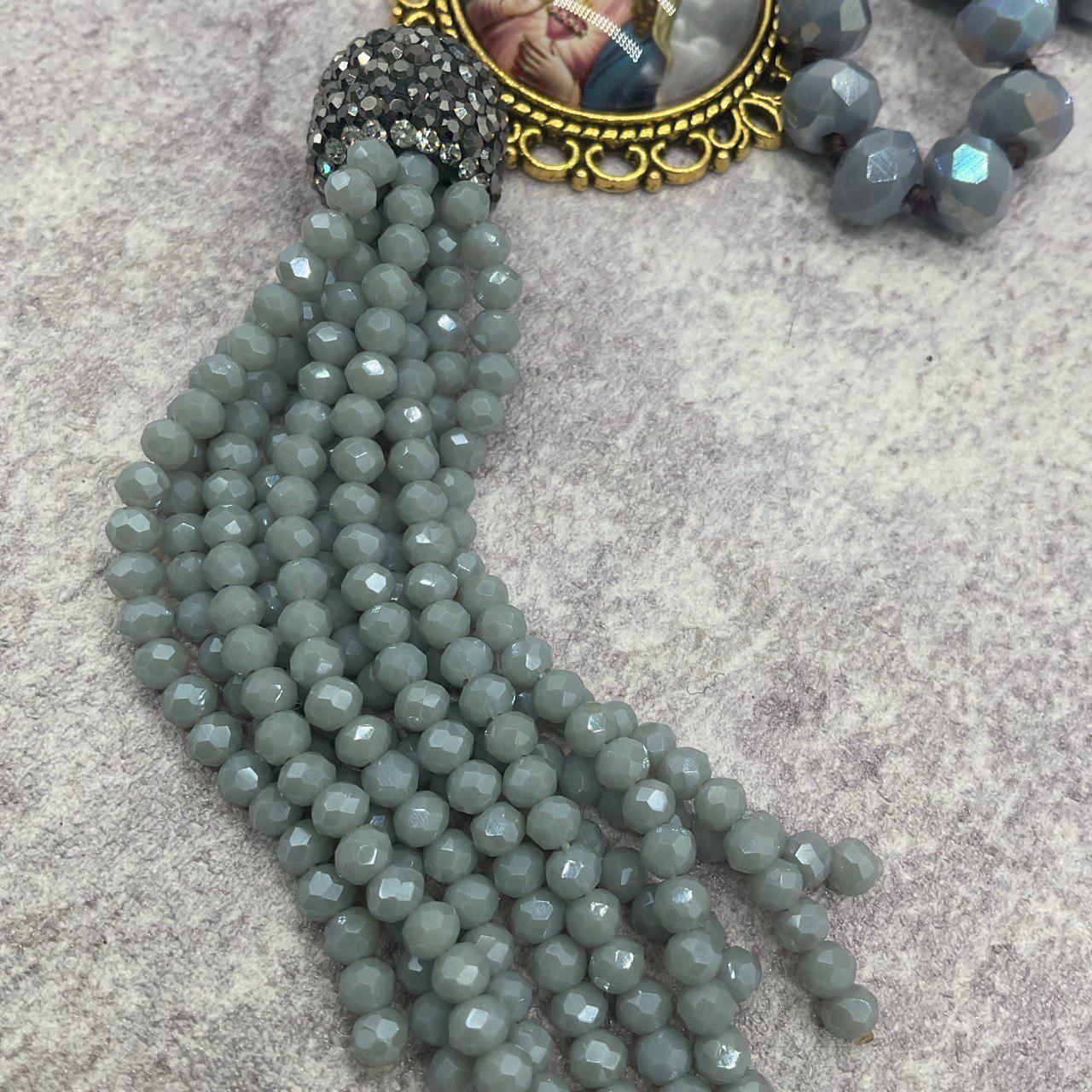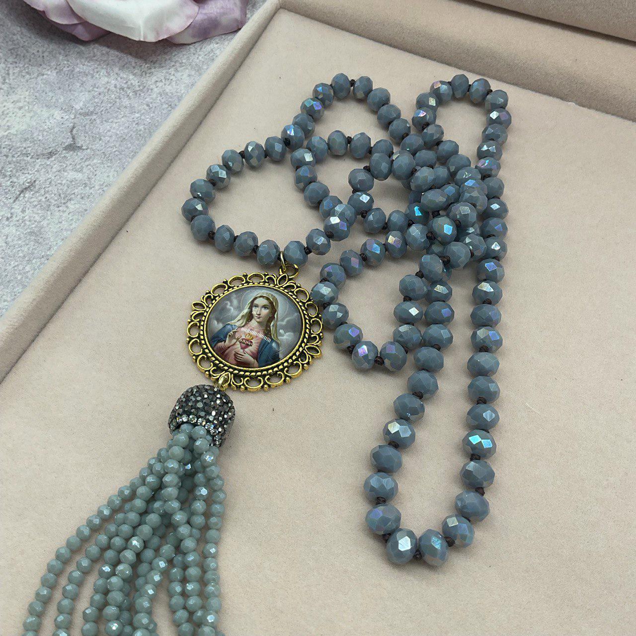 Our Lady Immaculate Heart - Purple Gray Czech Glass Beads - Long Necklace Sautoir - Virgin Mary Pendant and Tassel