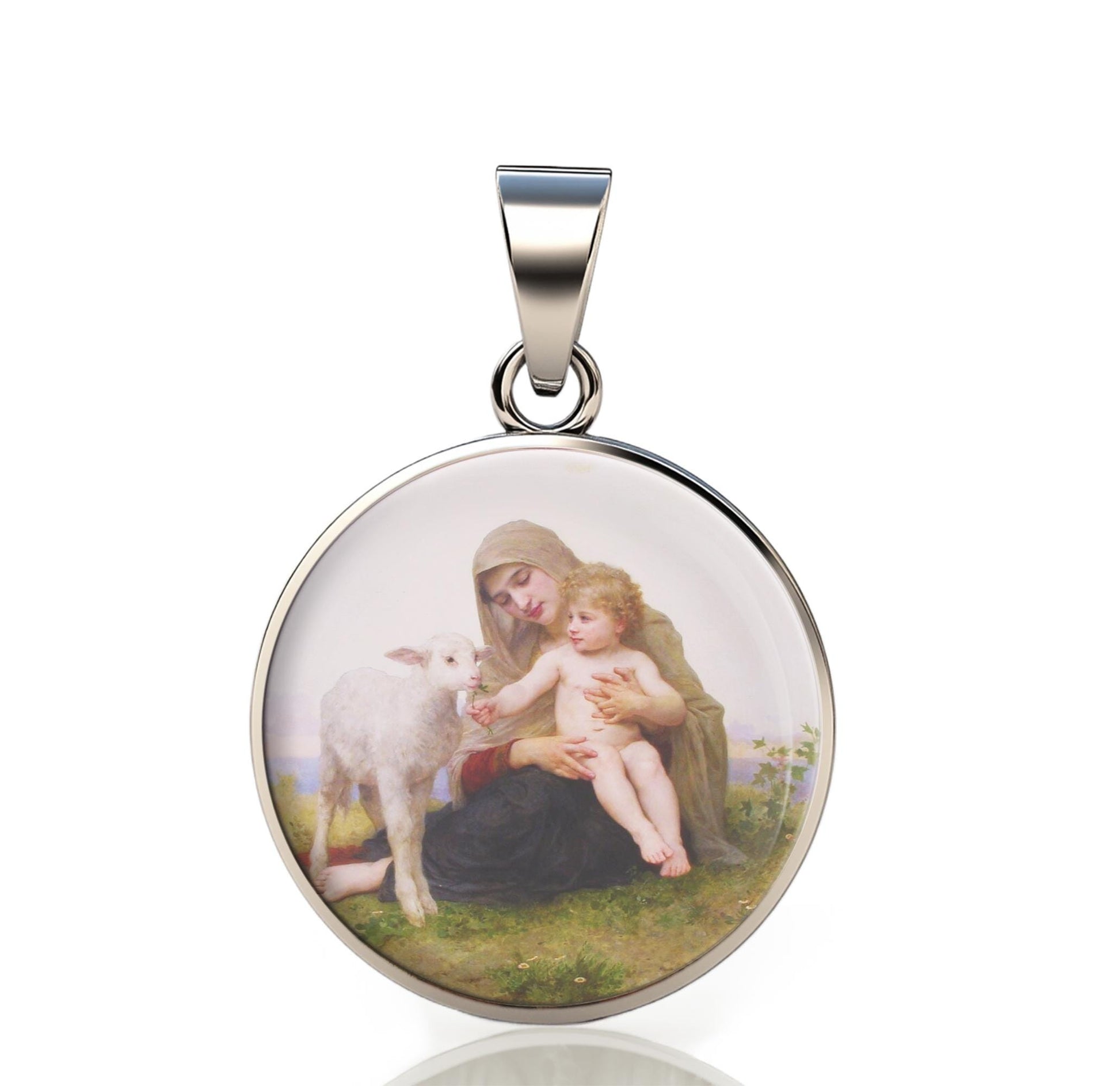 Our Lady Lamb 925 Sterling Silver Round Pendant Christian Religious Medal Small 20mm