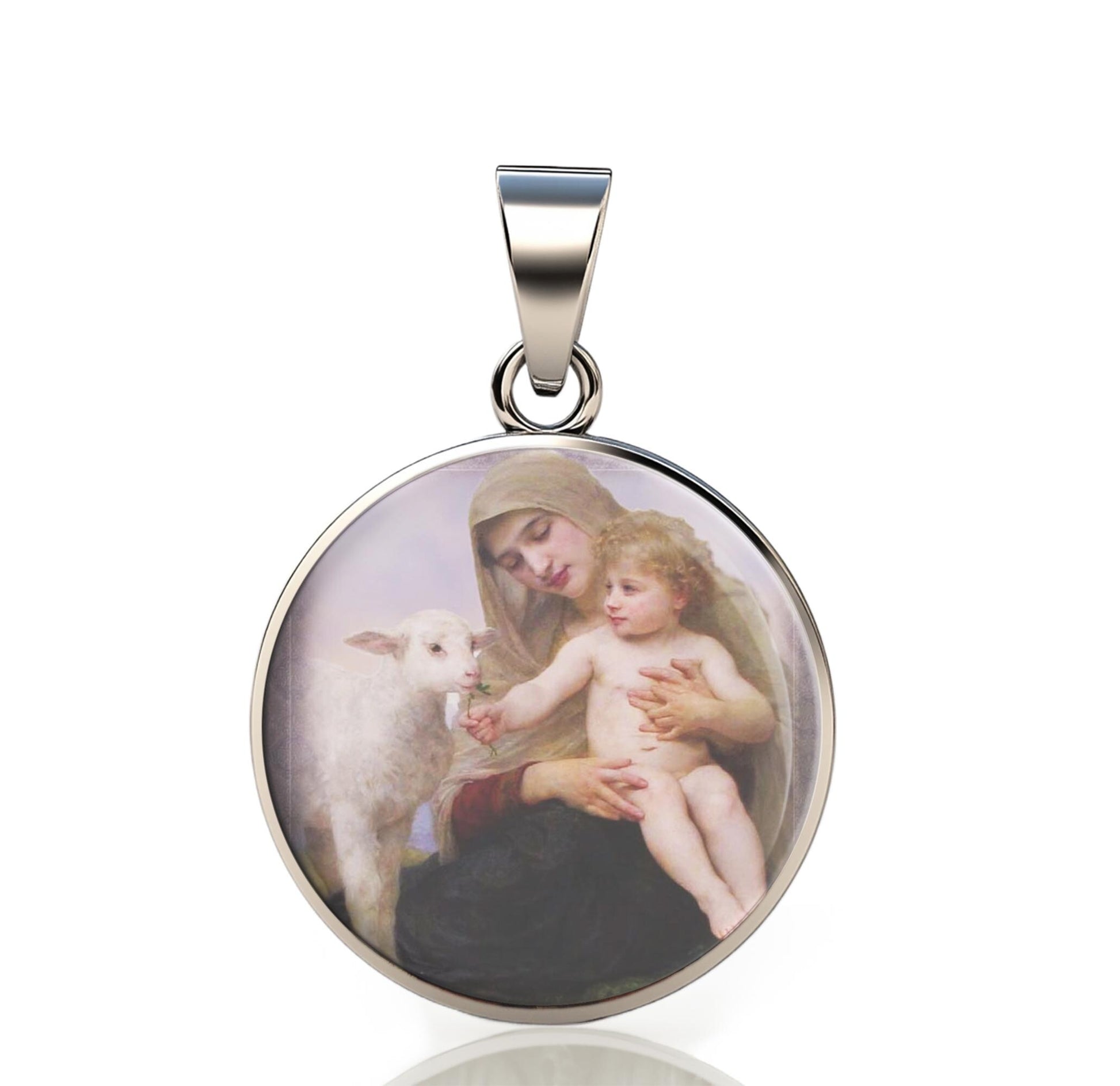 Our Lady Madonna And Child With Lamb 925 Sterling Silver Round Pendant Christian Religious Medal Small 20mm