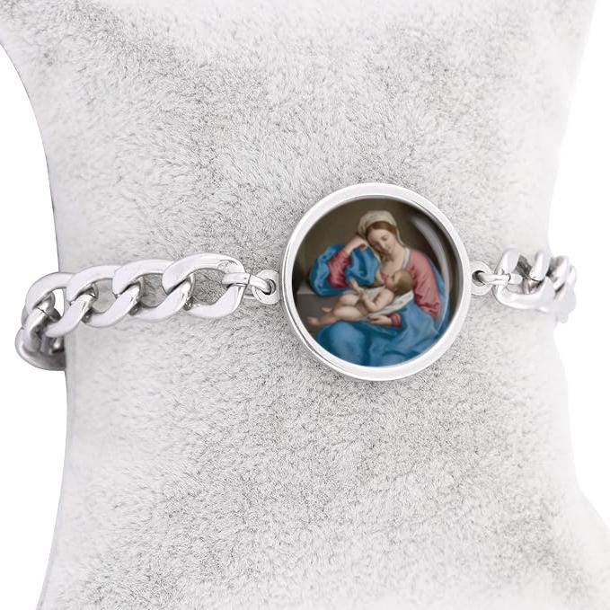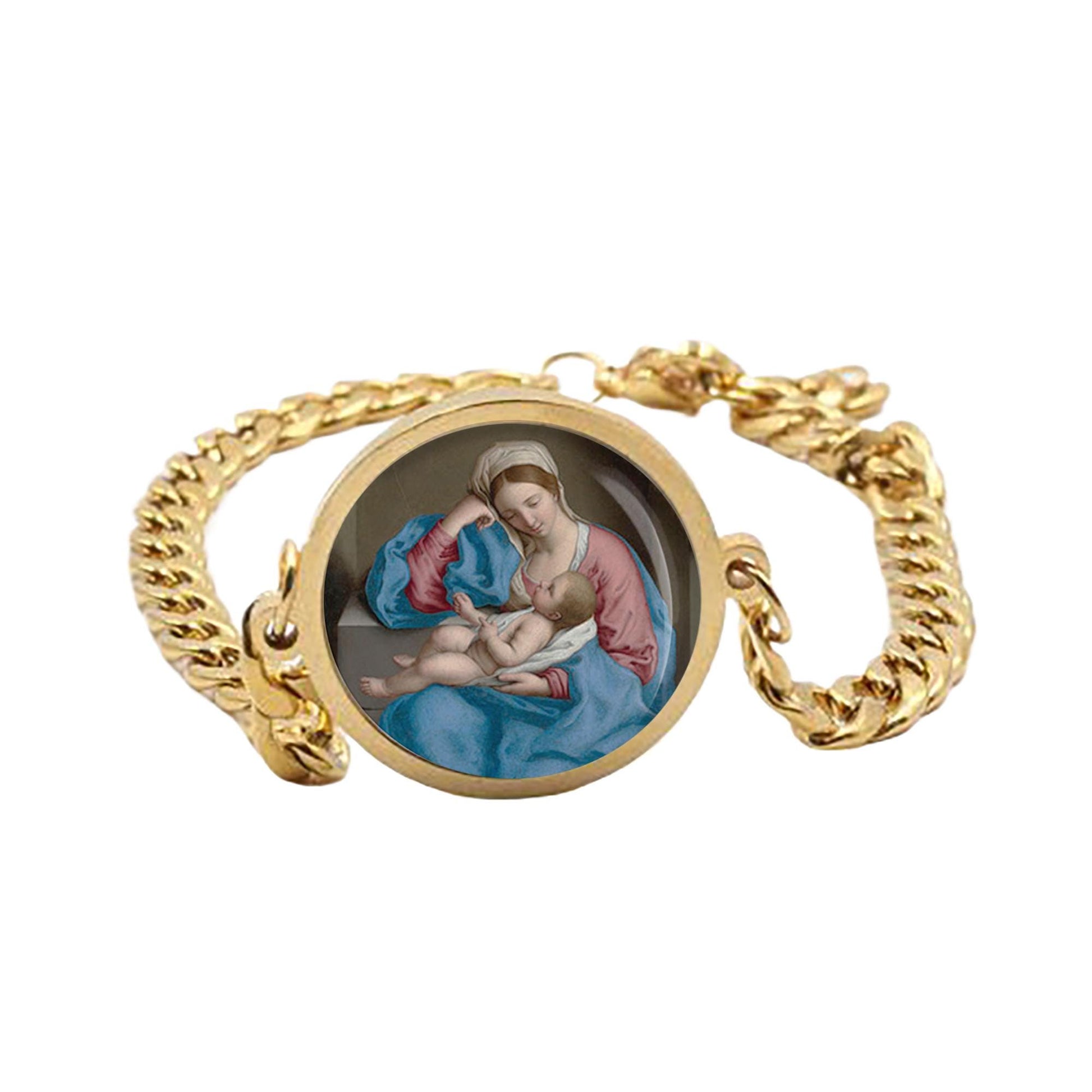 Our Lady Madonna With The Infant Christ Child Curb Bracelet Gold or Silver tone Religious Jewelry Simple Chain