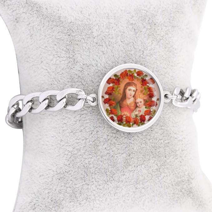 Our Lady Mary And Baby Jesus With Roses Curb Bracelet Gold or Silver tone Religious Jewelry Simple Chain