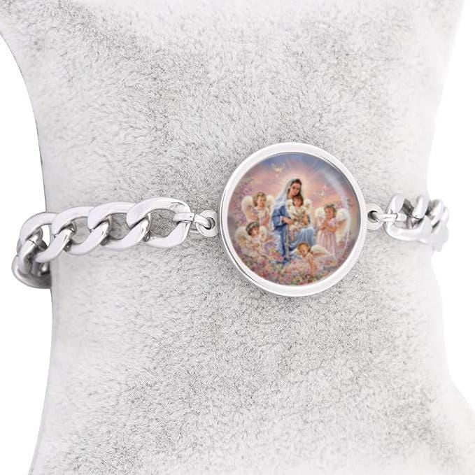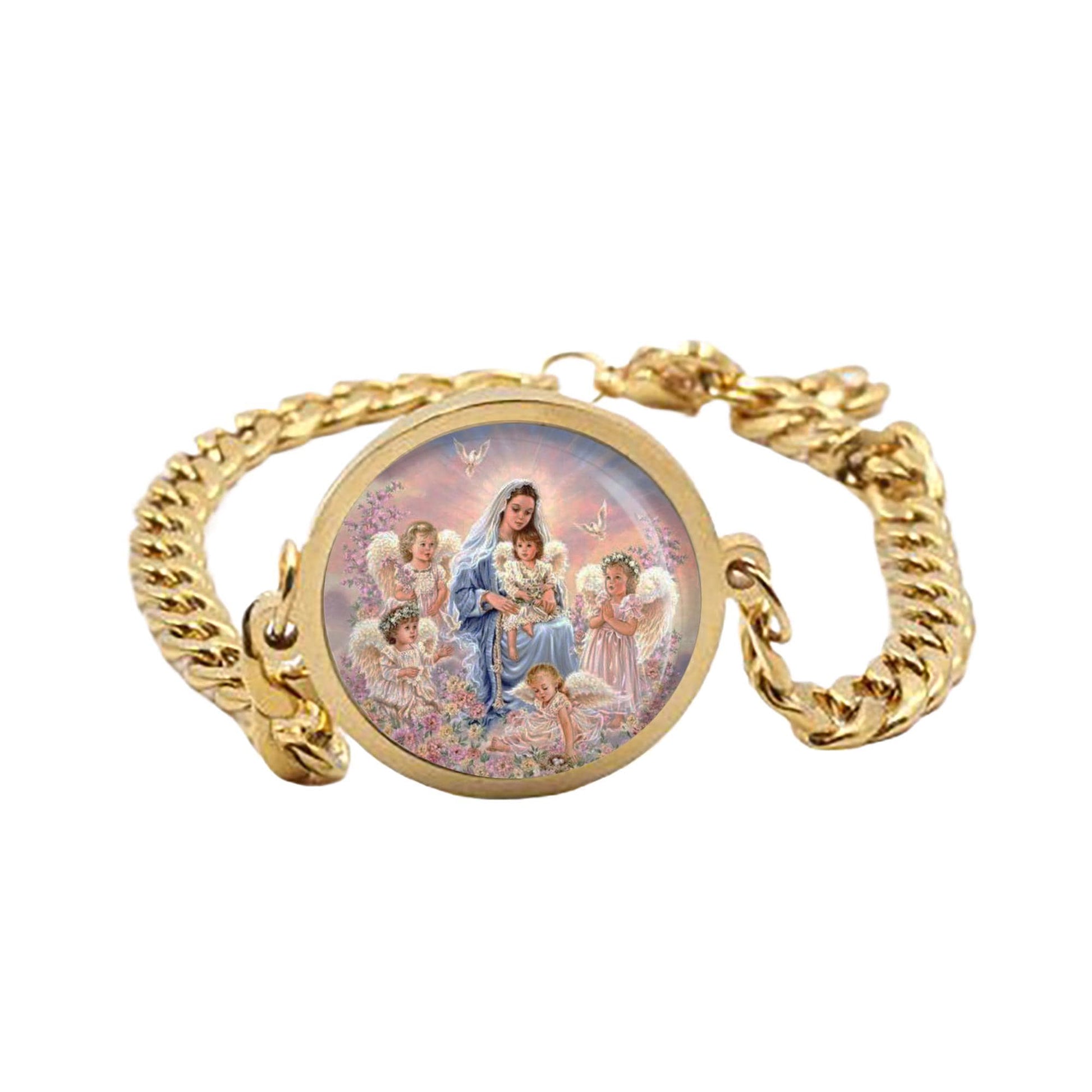 Our Lady Mary, Baby And Cherubs Curb Bracelet Gold or Silver tone Religious Jewelry Simple Chain