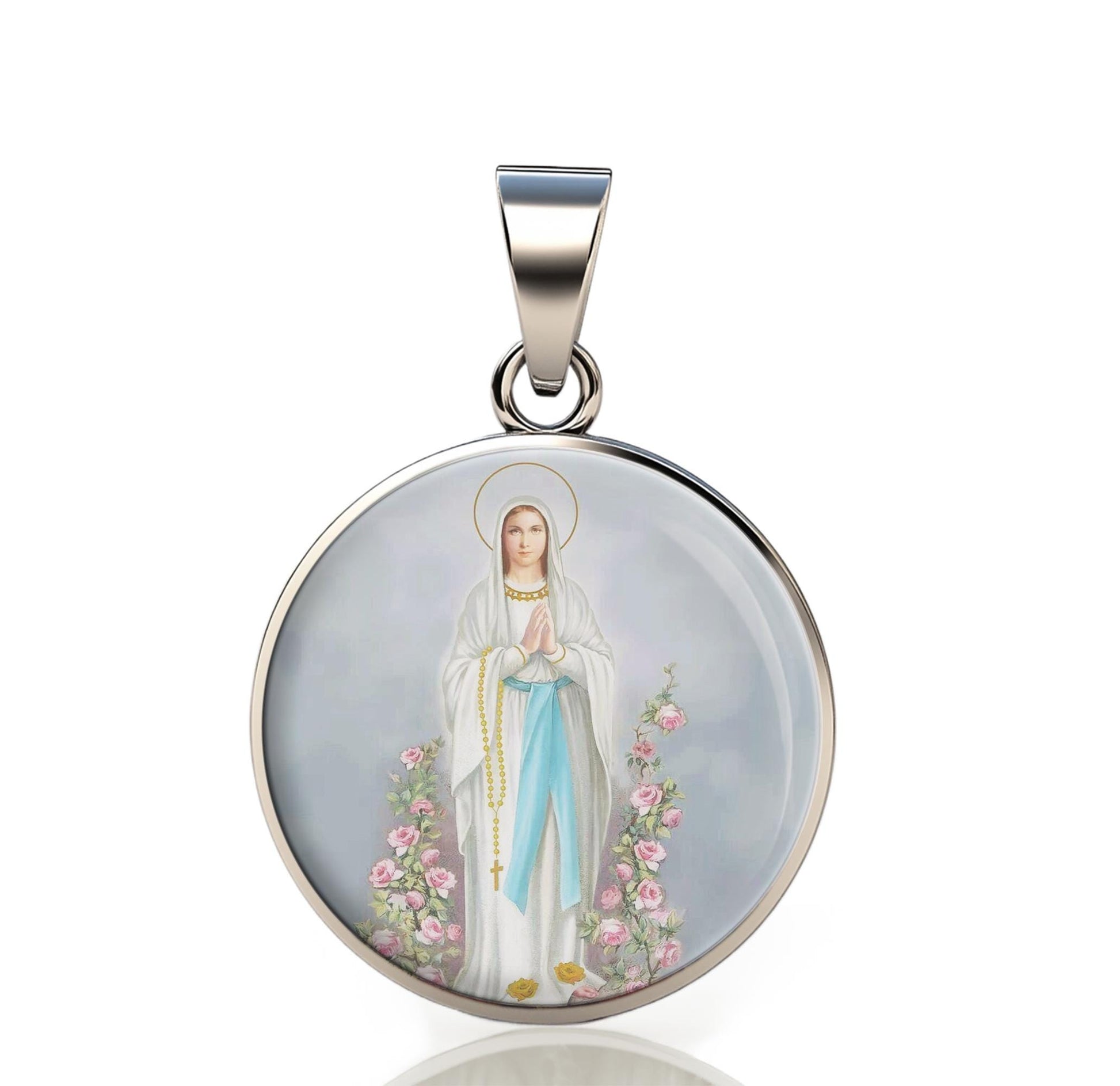 Our Lady Mary W Rosary 925 Sterling Silver Round Pendant Christian Religious Medal Small 20mm
