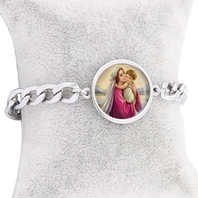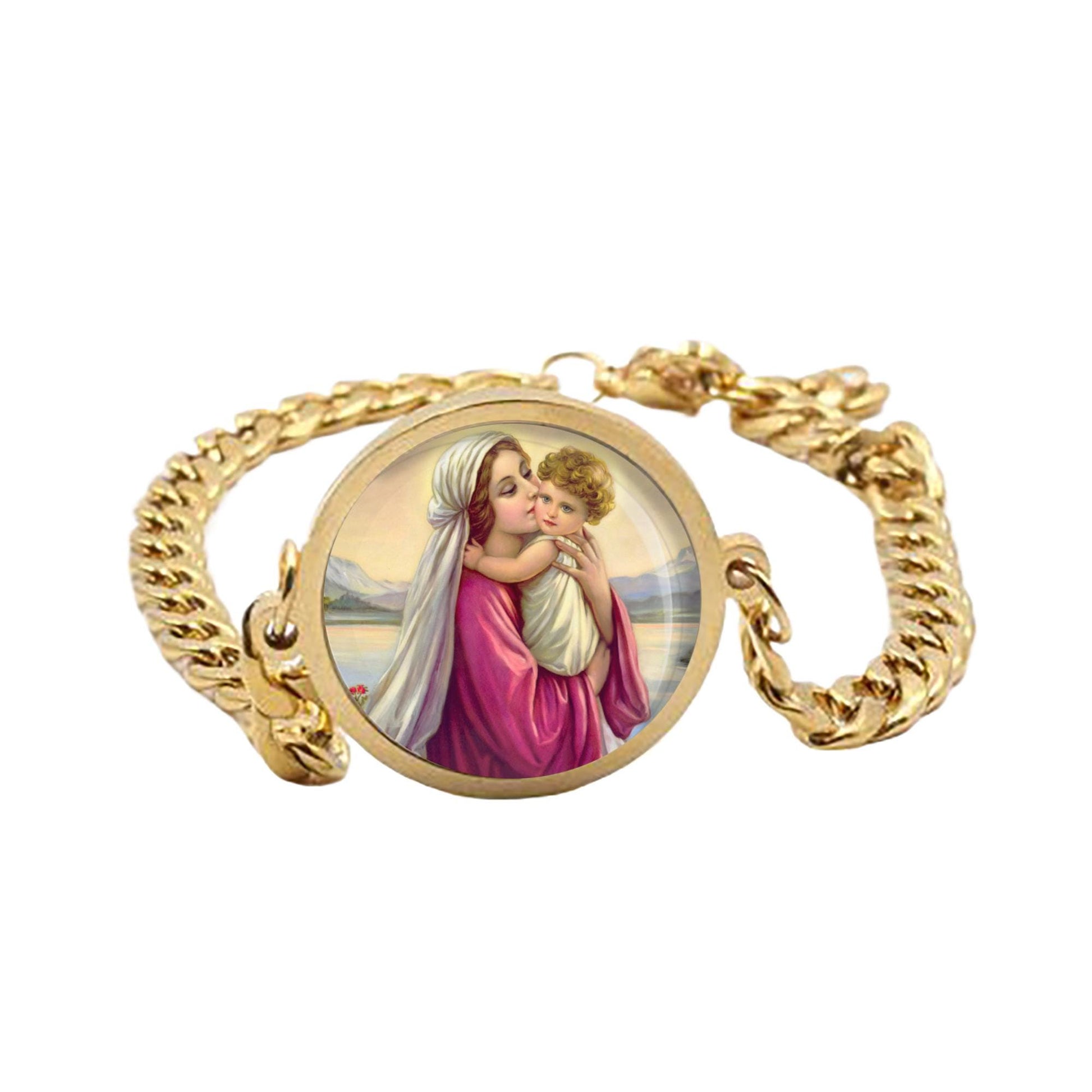 Our Lady Mary with Child Jesus Curb Bracelet Gold or Silver tone Religious Jewelry Simple Chain