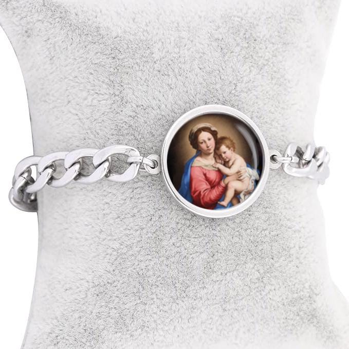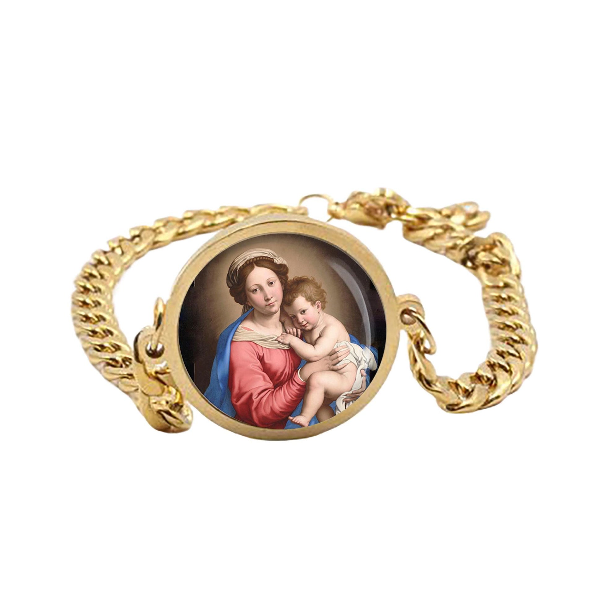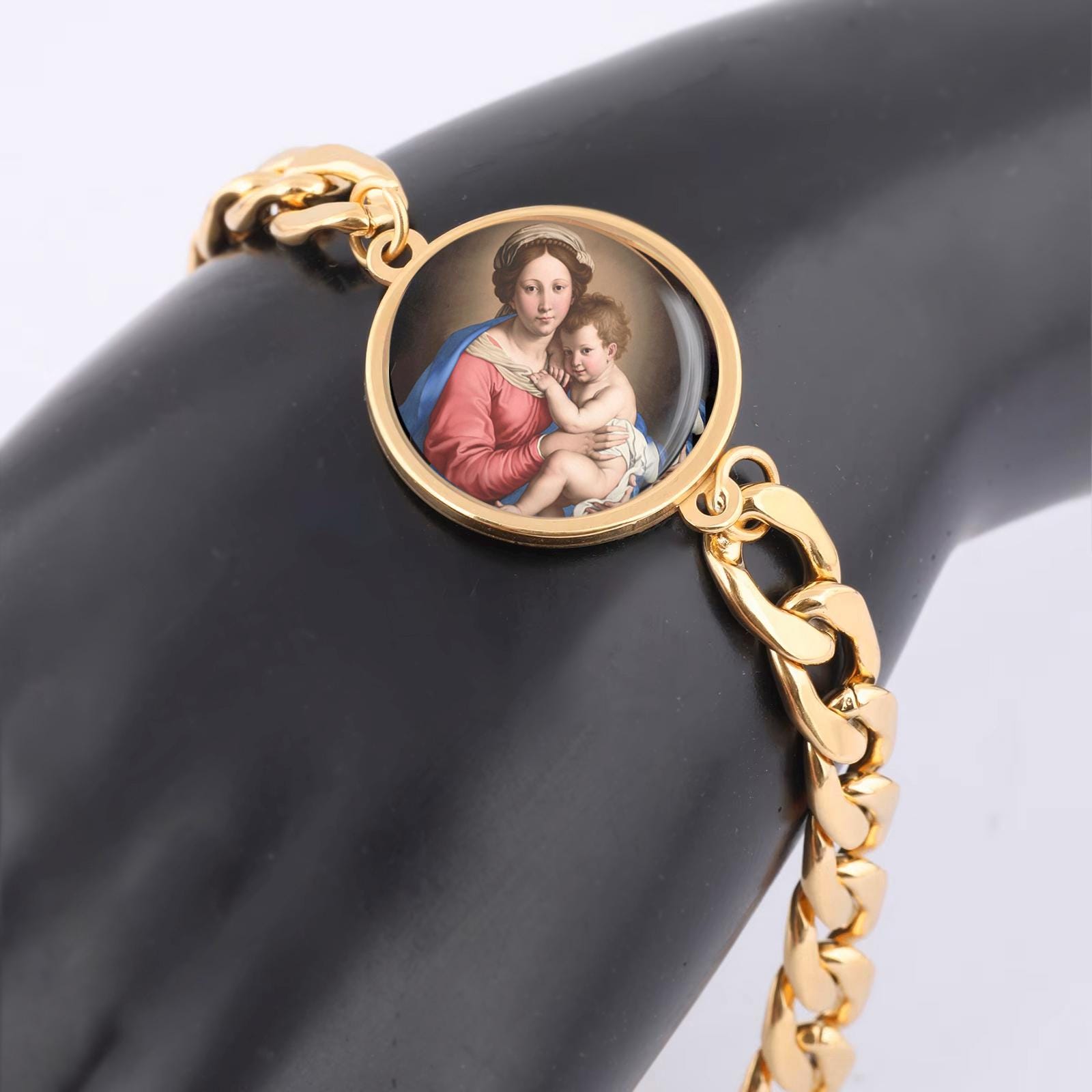 Our Lady Mother Mary And Baby Curb Bracelet Gold or Silver tone Religious Jewelry Simple Chain