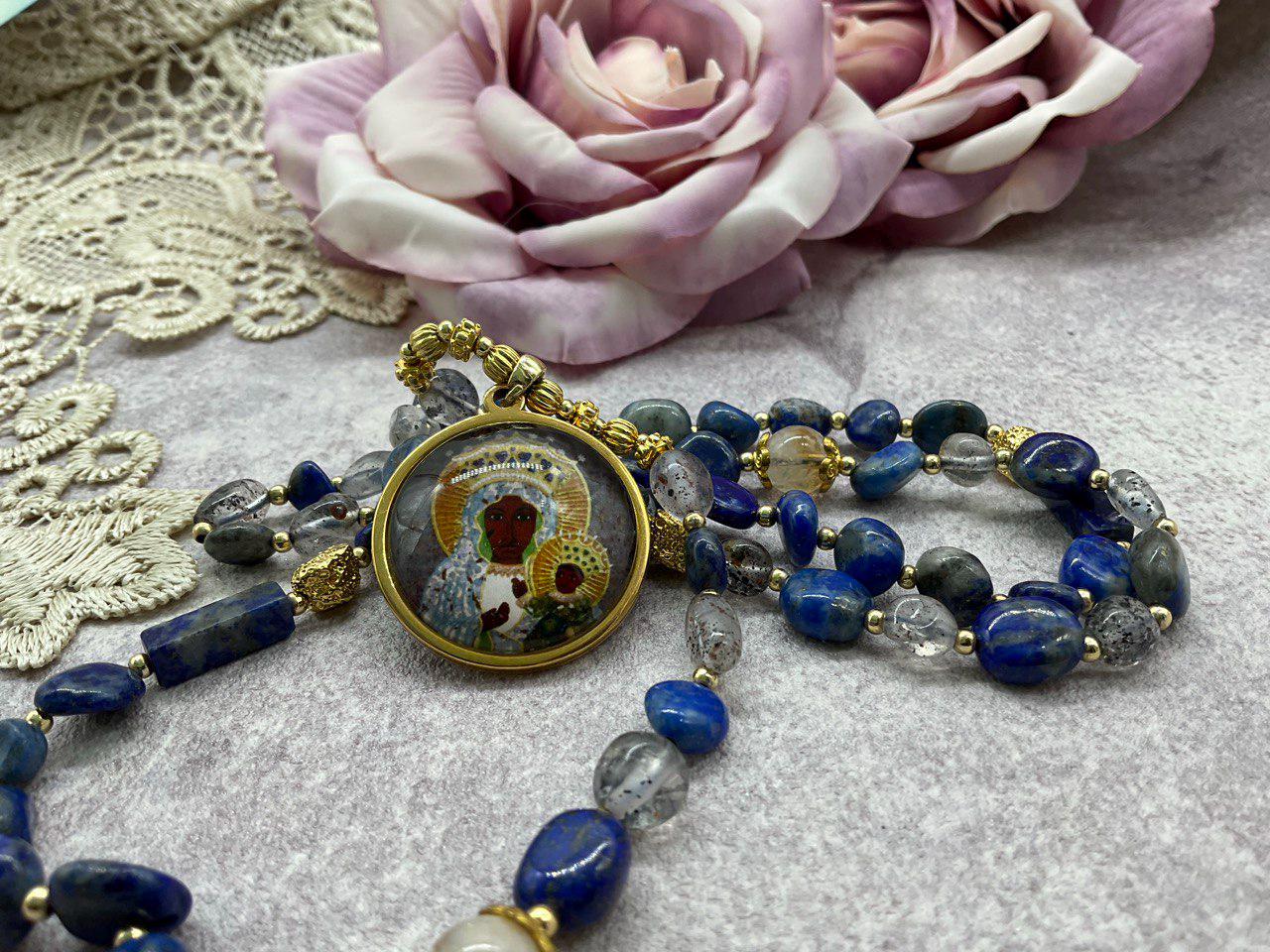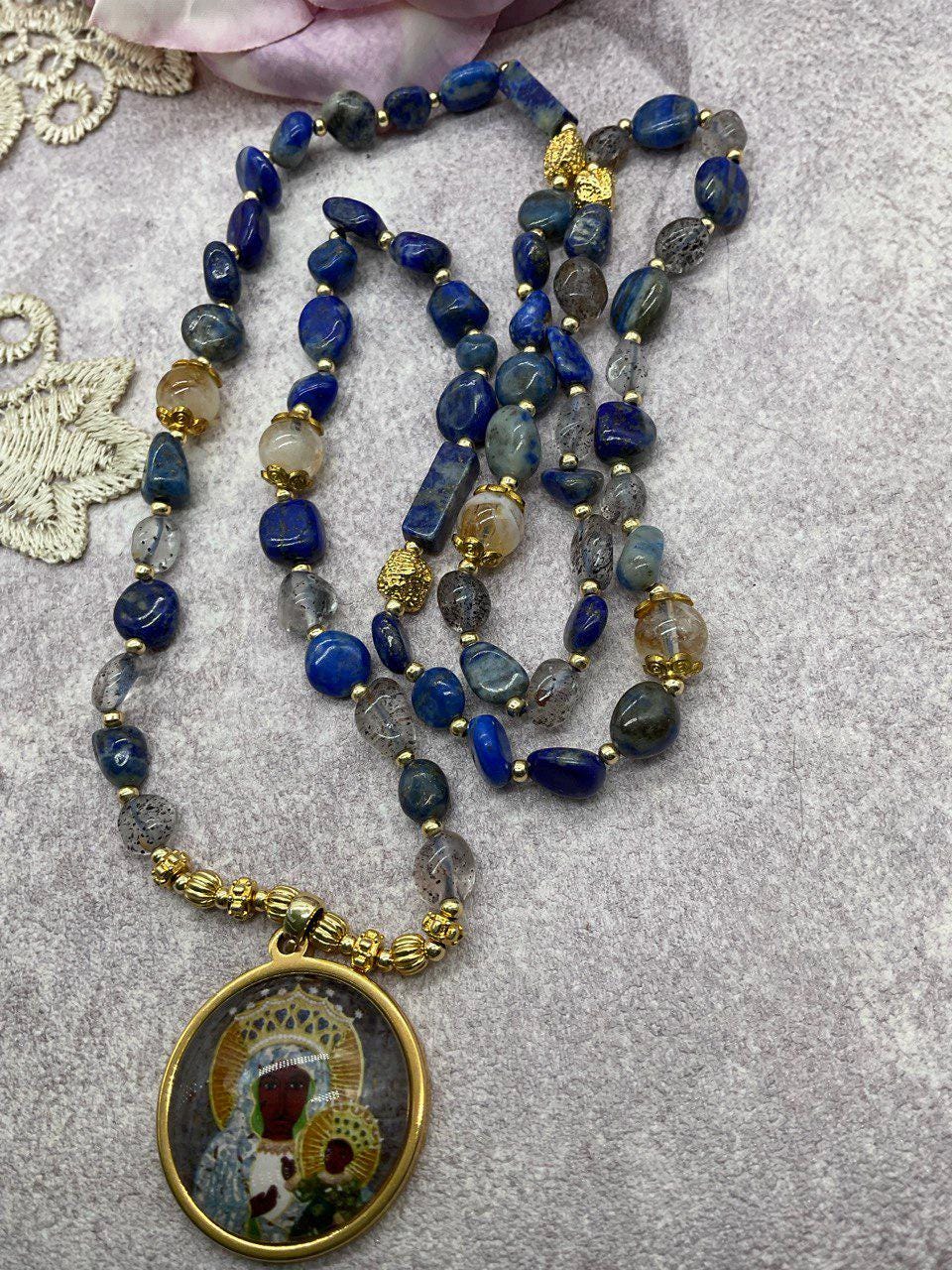A beautifully handcrafted necklace honoring Our Lady of Czestochowa, featuring a combination of Lapis Lazuli beads in various shapes and sizes, complemented by elegant gray glass beads.