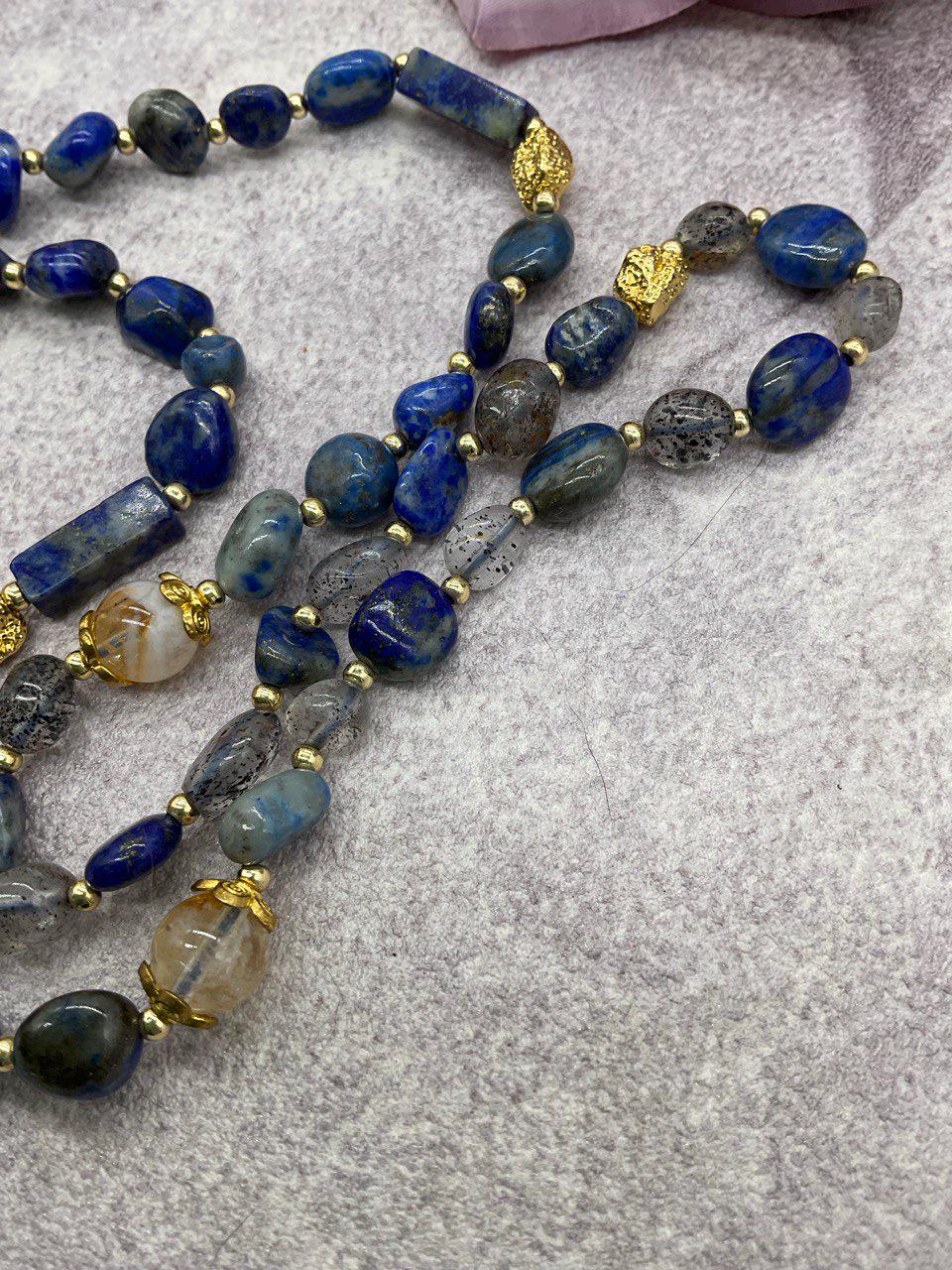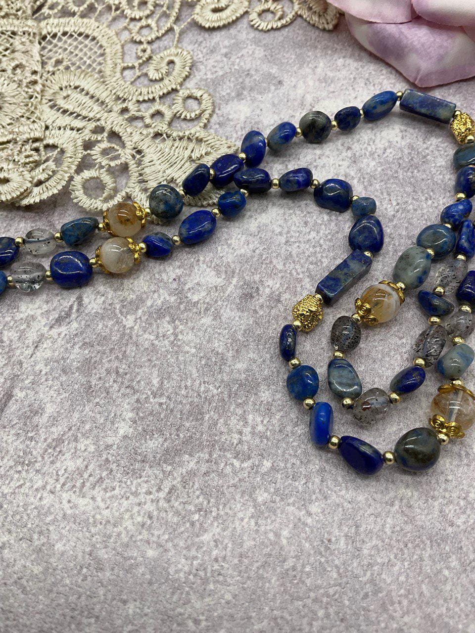 Each bead is carefully selected and strung by hand, creating a rich, textured look with deep blue and silver-gray tones.
