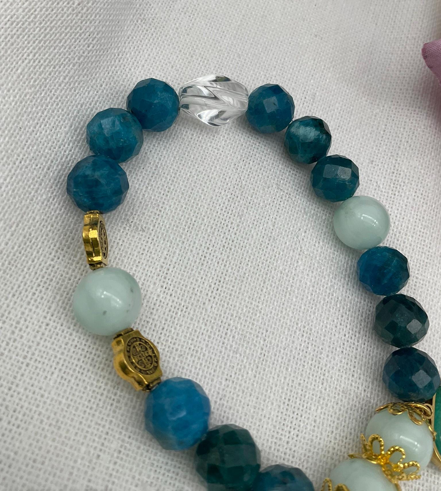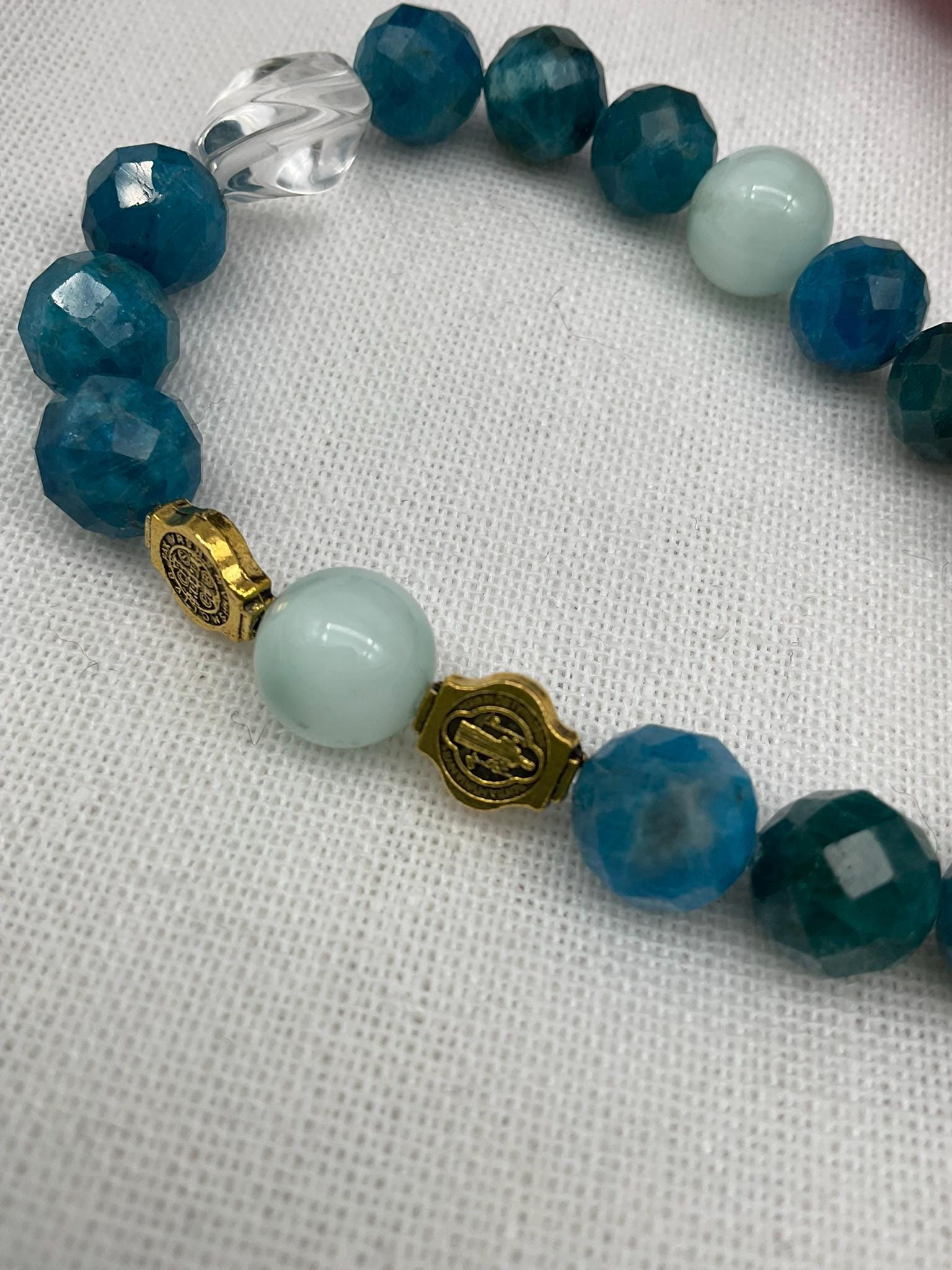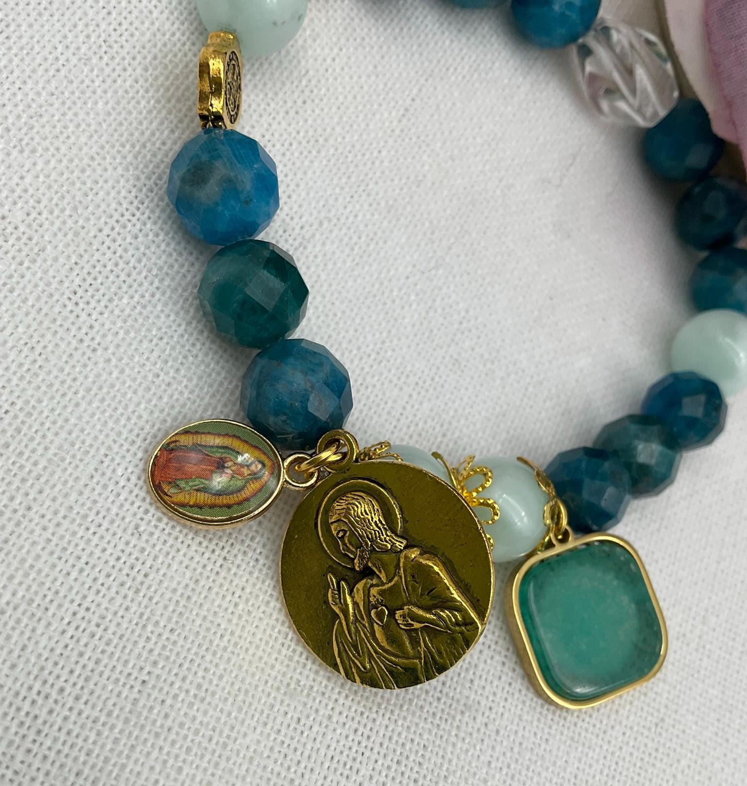 The bracelet is 7.5'' in length. Feel free to message me if you need a different size. * Double sided charm with Our Lady of Mount Carmel and Jesus Sacred Heart * Charm size: 18mm (0.7 inches). * 10mm Apatite and Green Angelite beads * White Clear Quartz * Stainless steel charm and small charm Our Lady of Guadalupe The bracelet will come packaged in a jewelry bag, ready for gift-giving. ** Note: Stretch bracelets should not be pulled or stretched wide to fit over your hand. Instead, gently roll the bracelet over your hand and slide it onto your wrist. This helps prevent overstretching or breakage, ensuring longer-lasting wear.