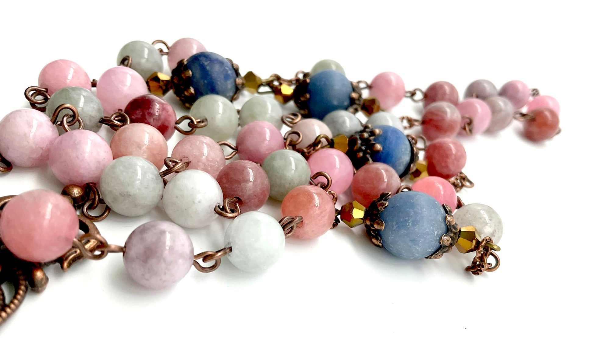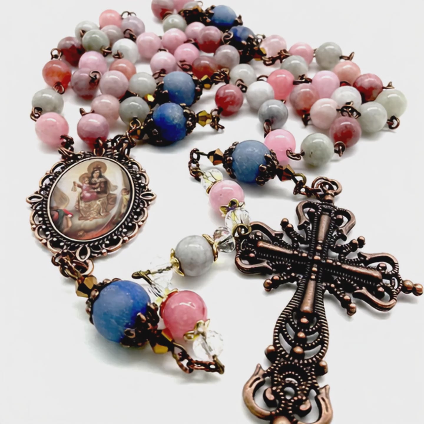 This Our Lady of Mount Carmel rosary blends rainbow jade and matte lapis lazuli beads for a calming, uplifting prayer experience. Handmade with care, it carries peaceful energy and meaningful symbolism. A beautiful choice for daily devotion or as a heartfelt gift for someone who seeks Mary’s guidance and protection.