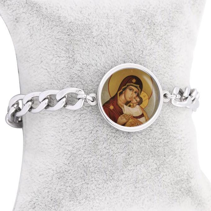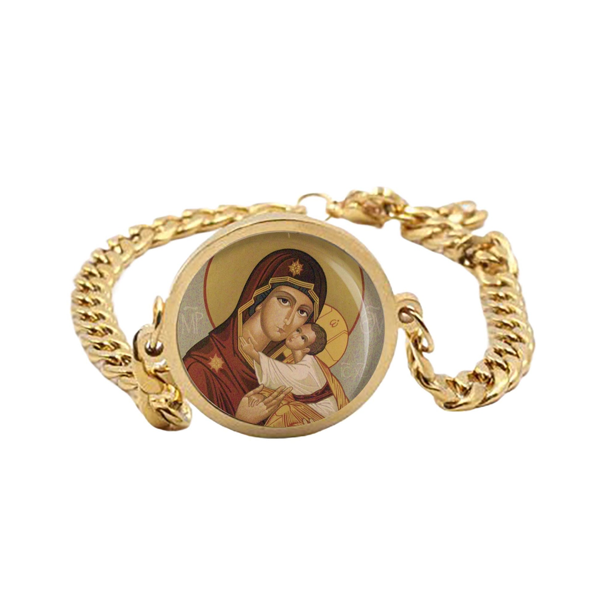 Our Lady Theotokos Mother Of God Orthodox Icon Curb Bracelet Gold or Silver tone Religious Jewelry Simple Chain