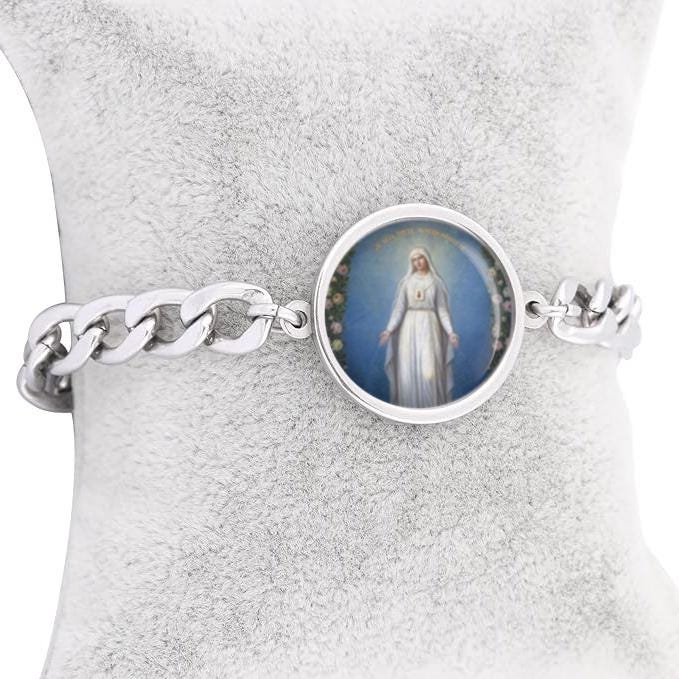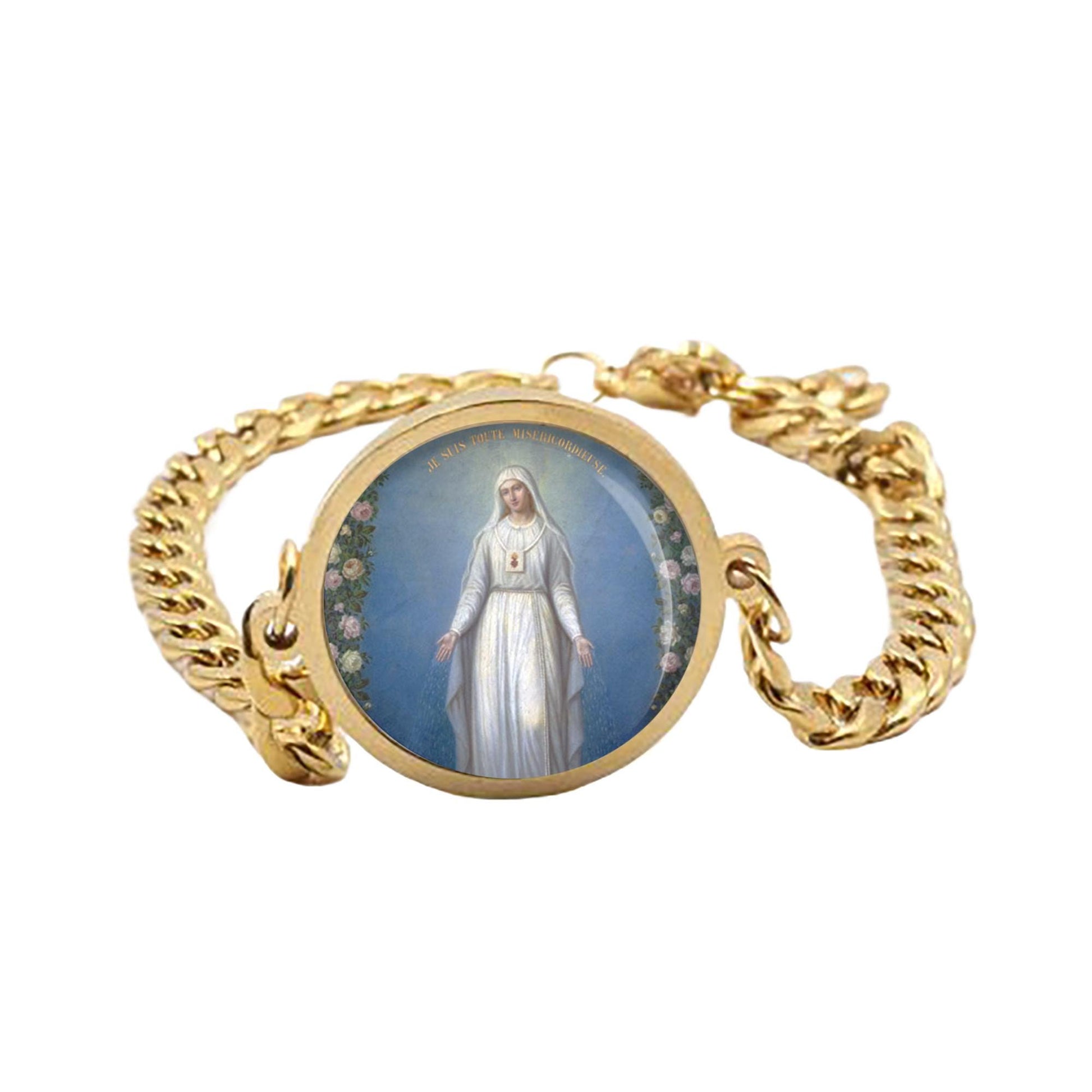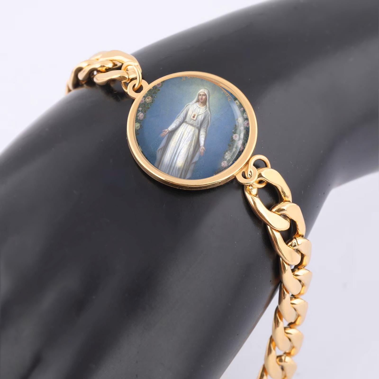 Our Lady with Wreath Of Roses Curb Bracelet Gold or Silver tone Religious Jewelry Simple Chain
