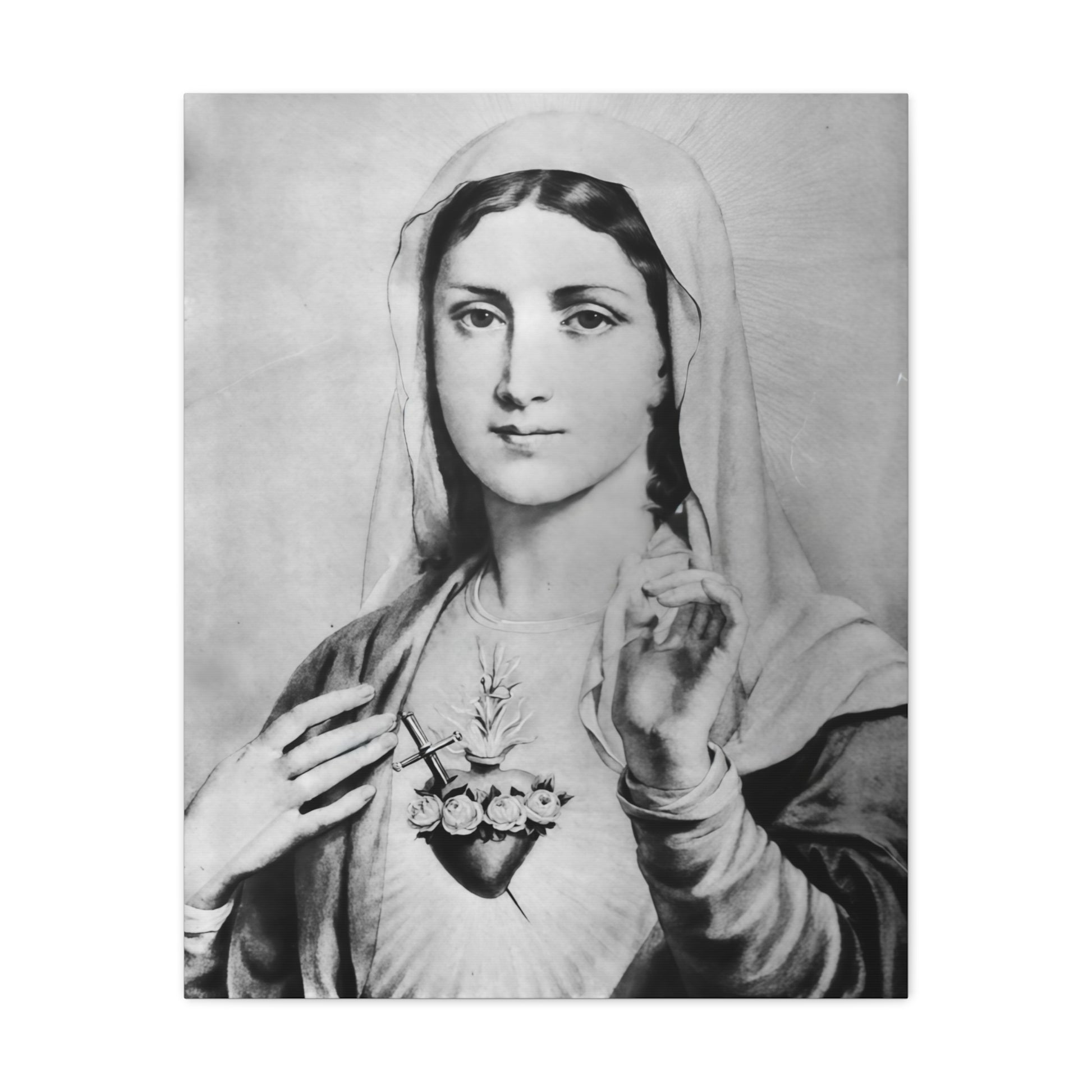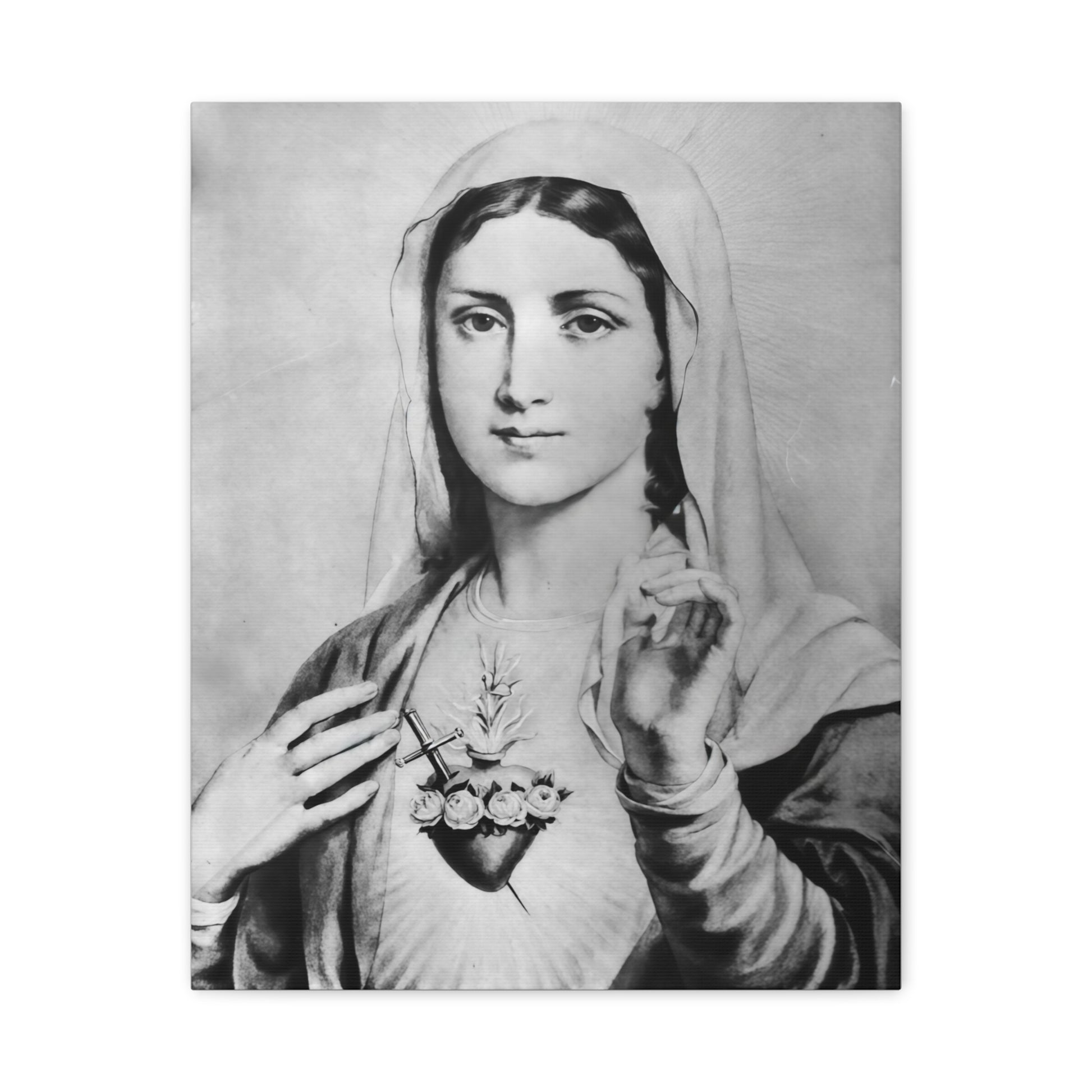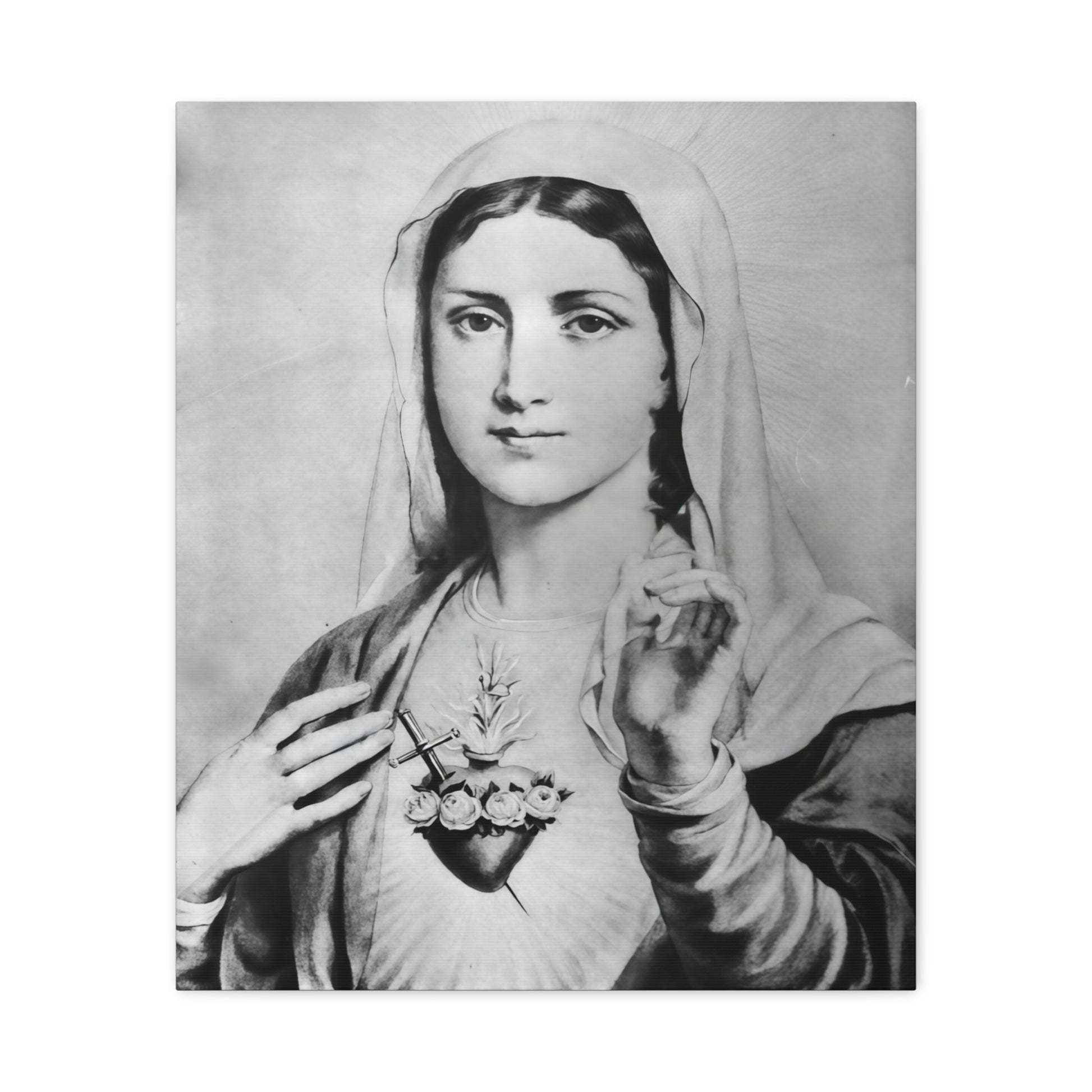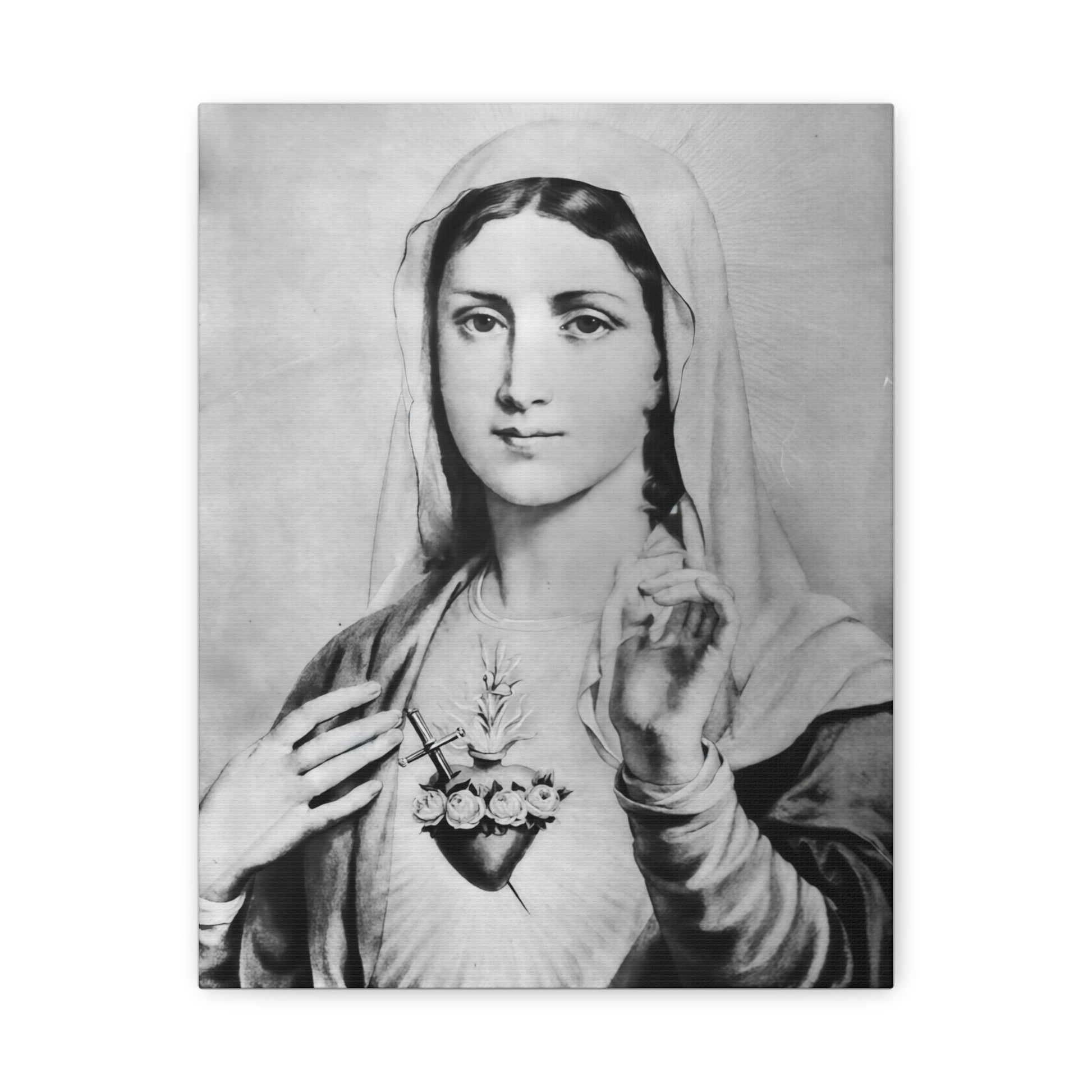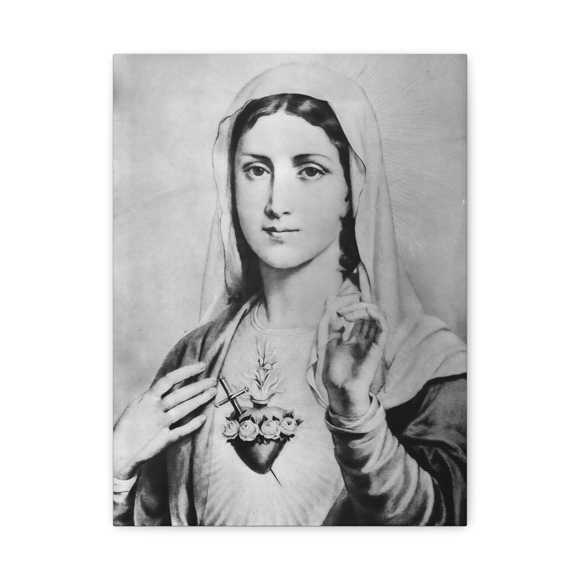 Ready To Hang - Black and White Mother Mary Immaculate Heart Catholic Canvas Wall Art, Christian Decor