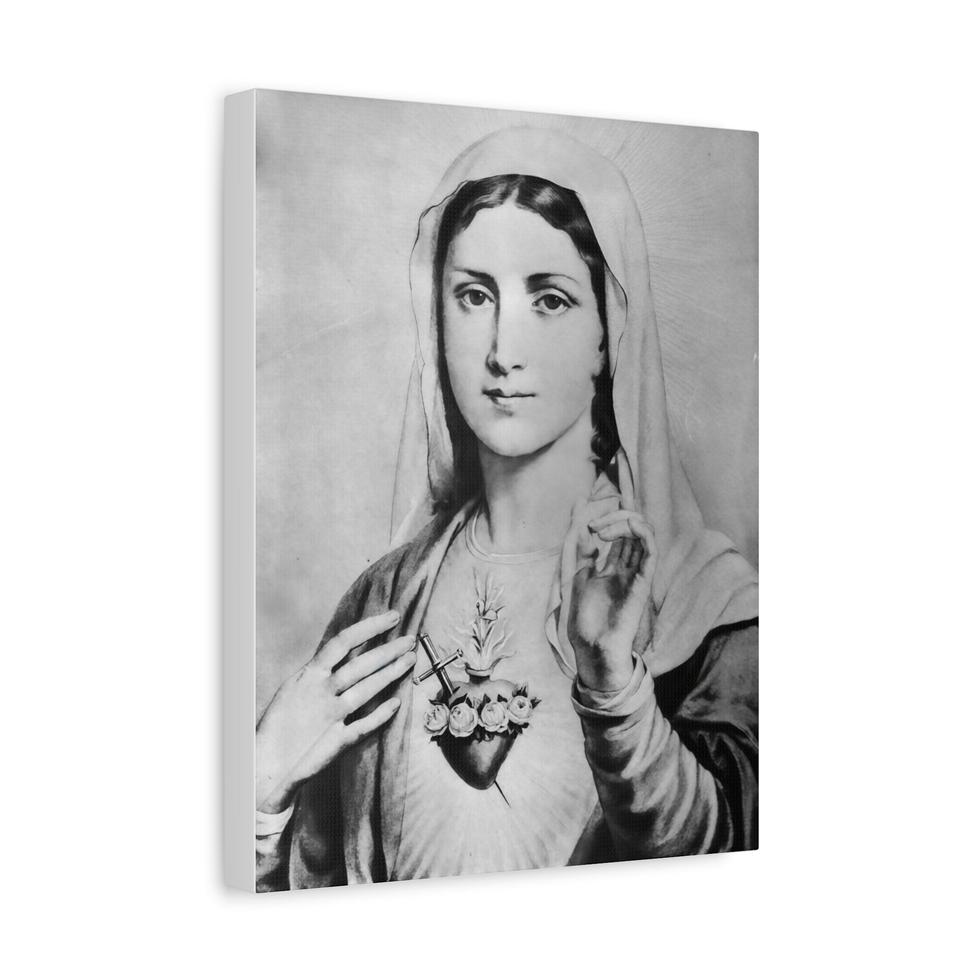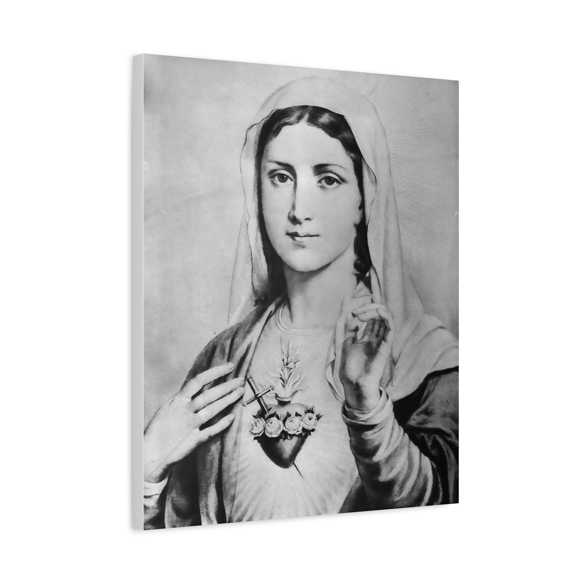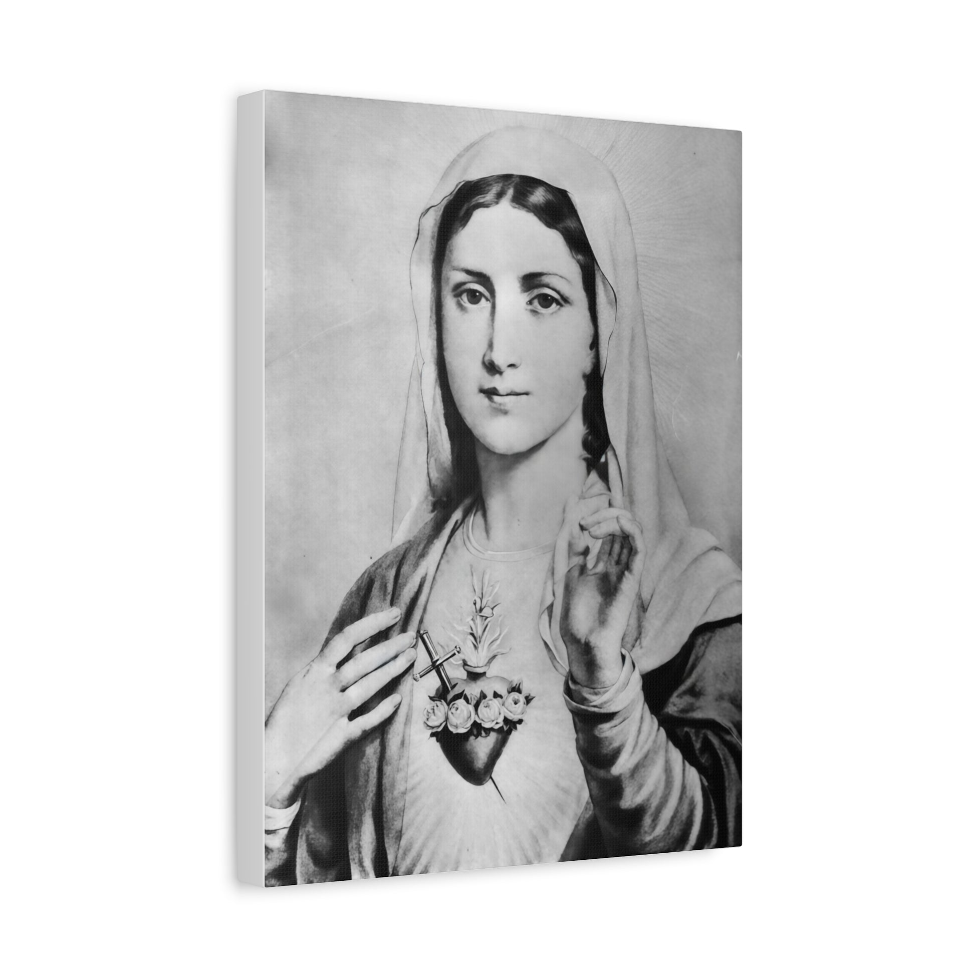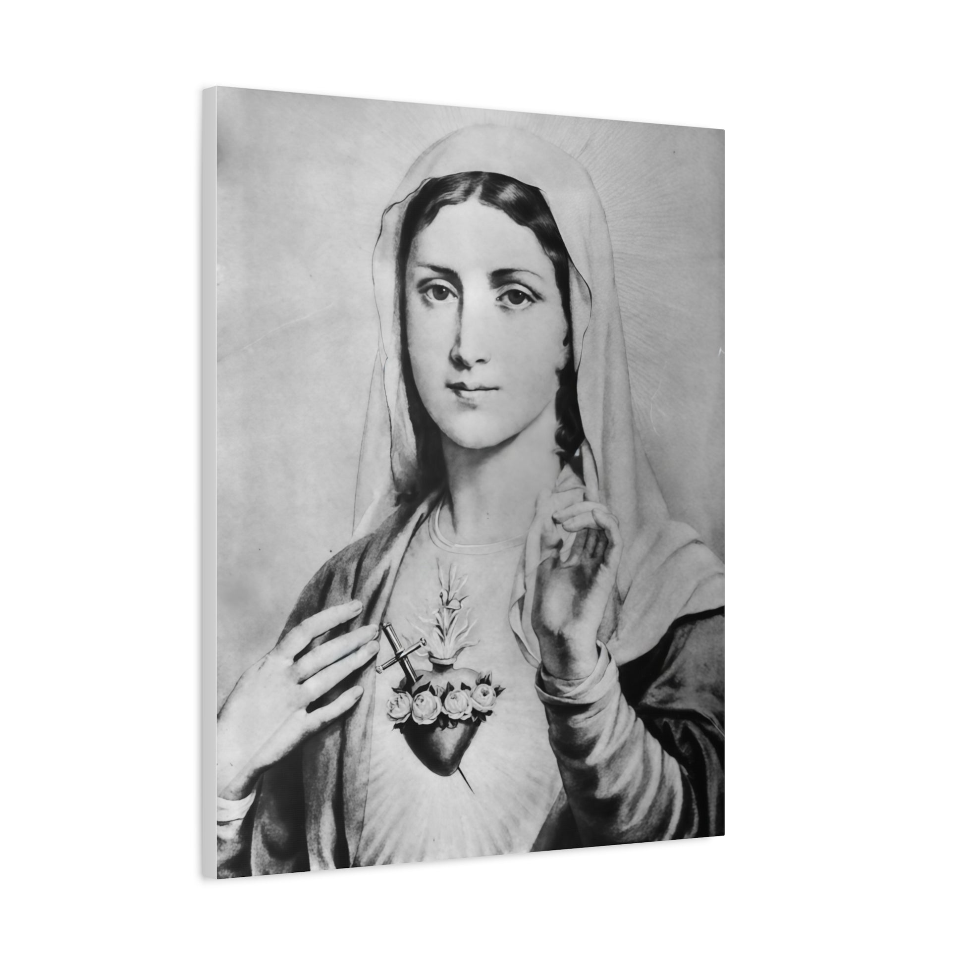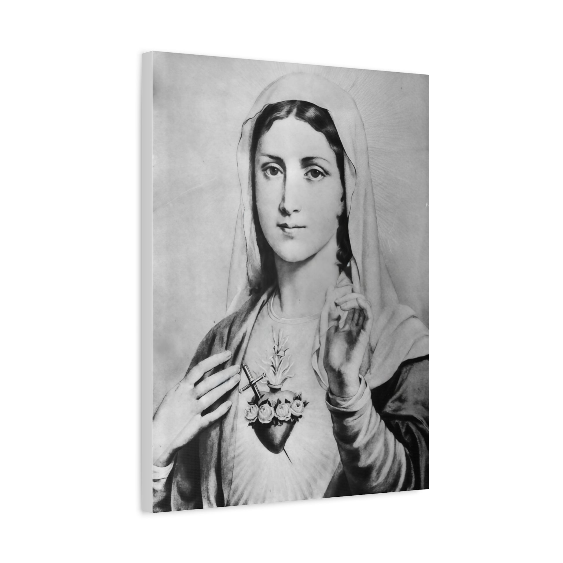 Ready To Hang - Black and White Mother Mary Immaculate Heart Catholic Canvas Wall Art, Christian Decor