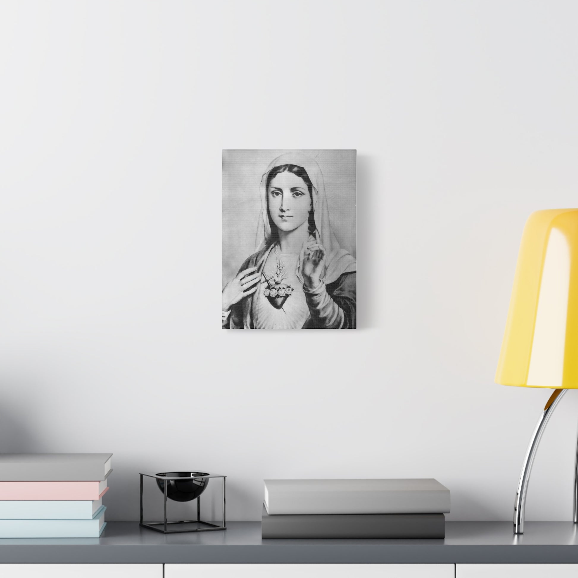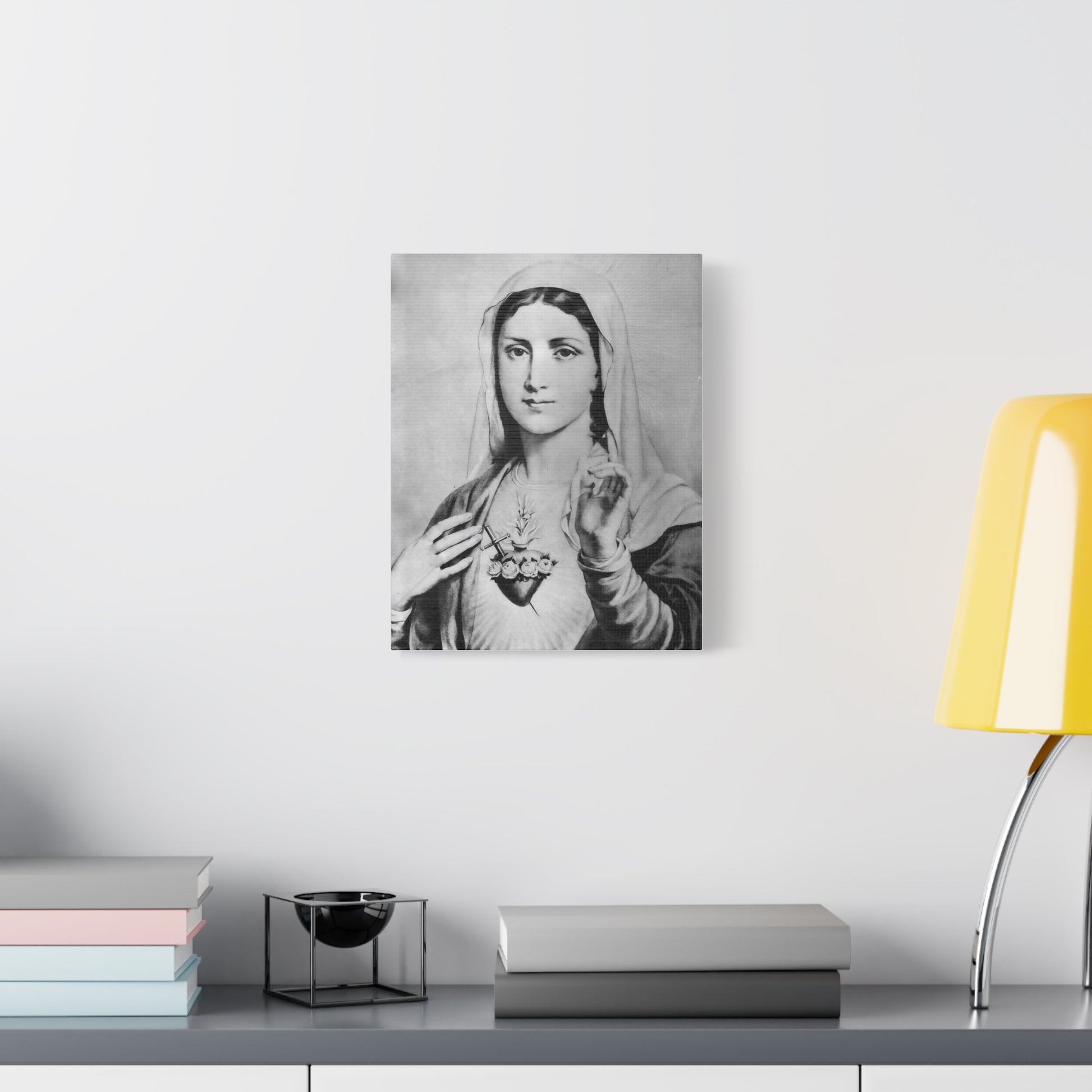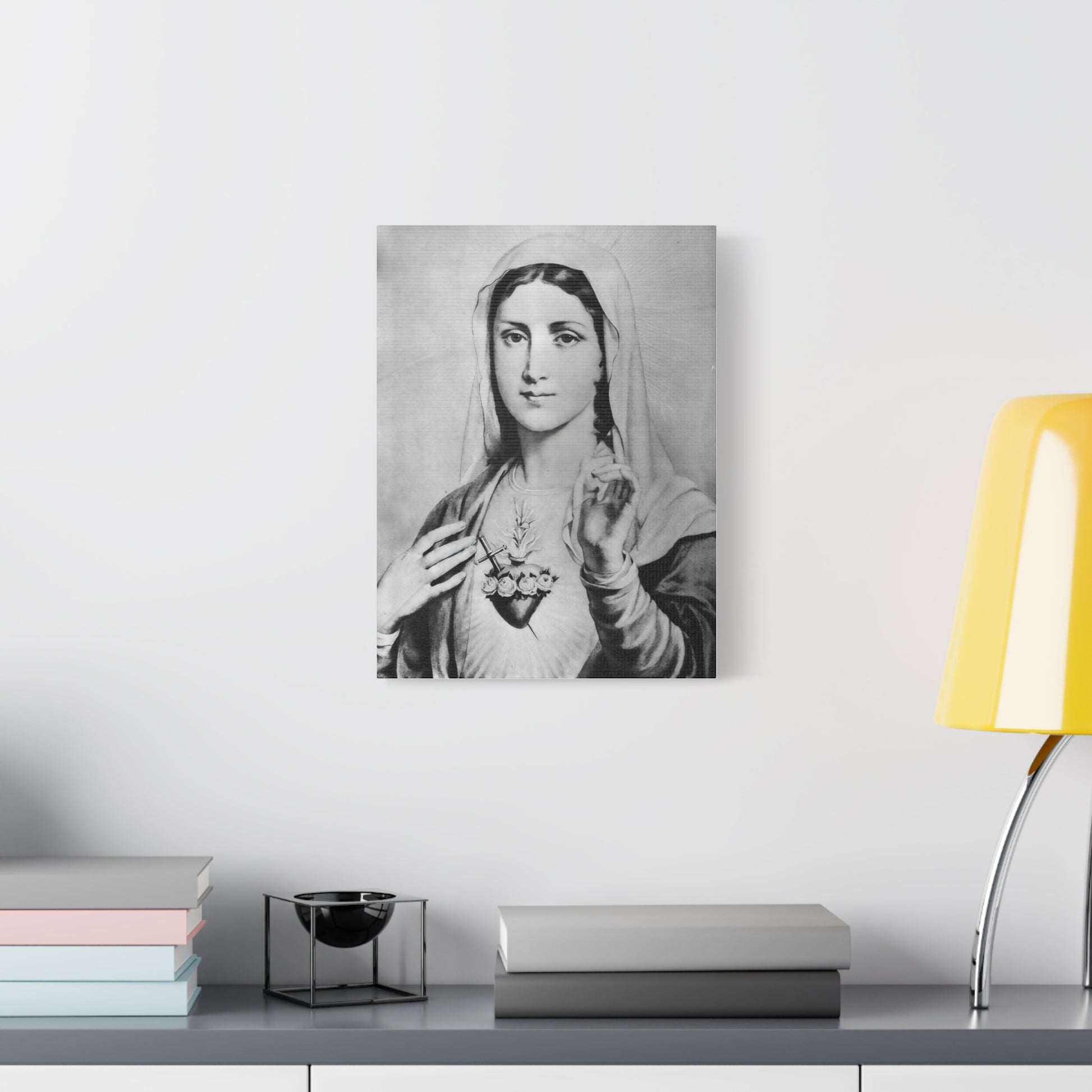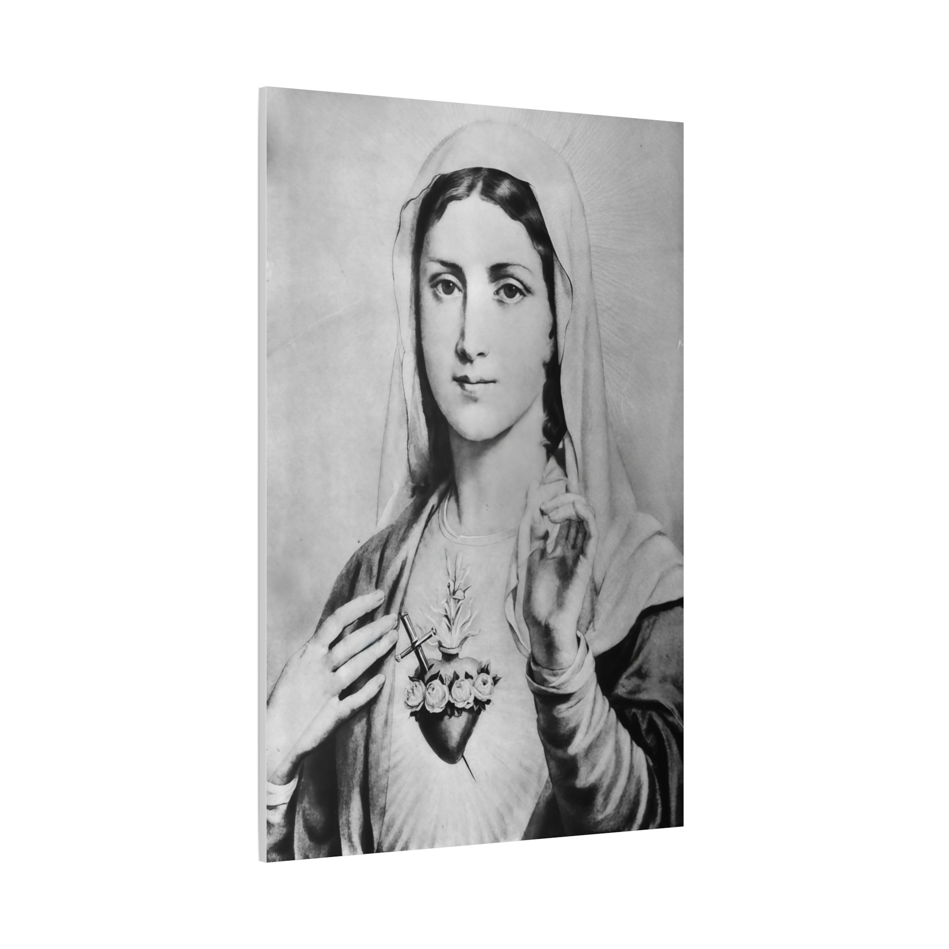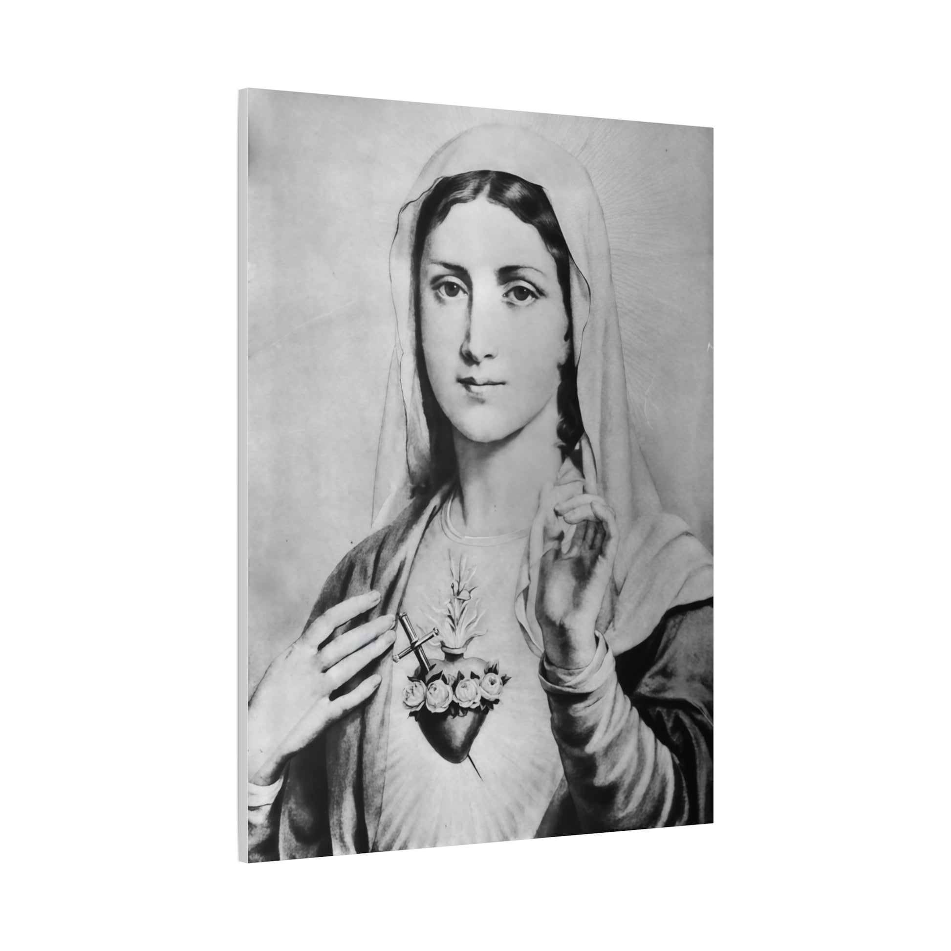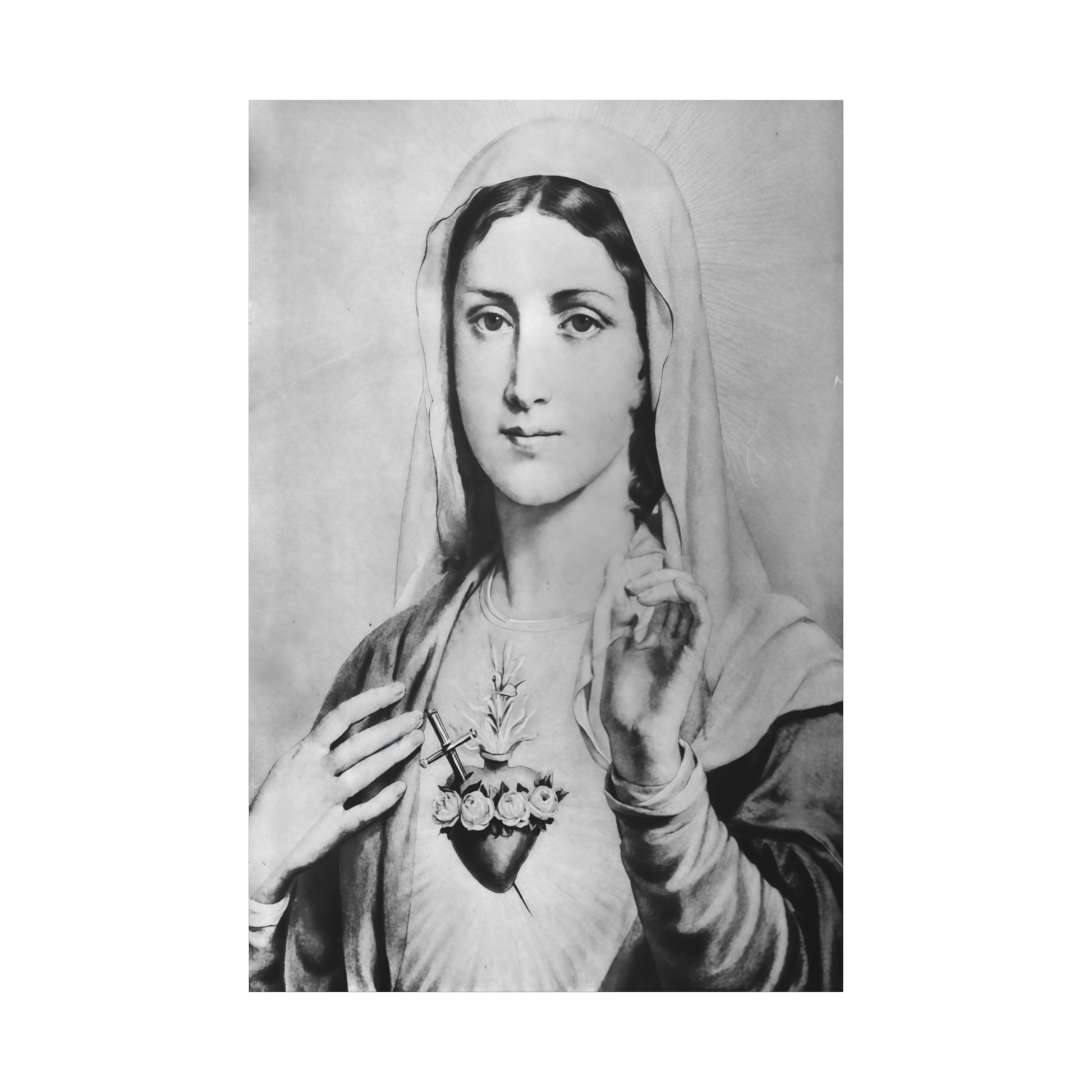 Ready To Hang - Black and White Mother Mary Immaculate Heart Catholic Canvas Wall Art, Christian Decor