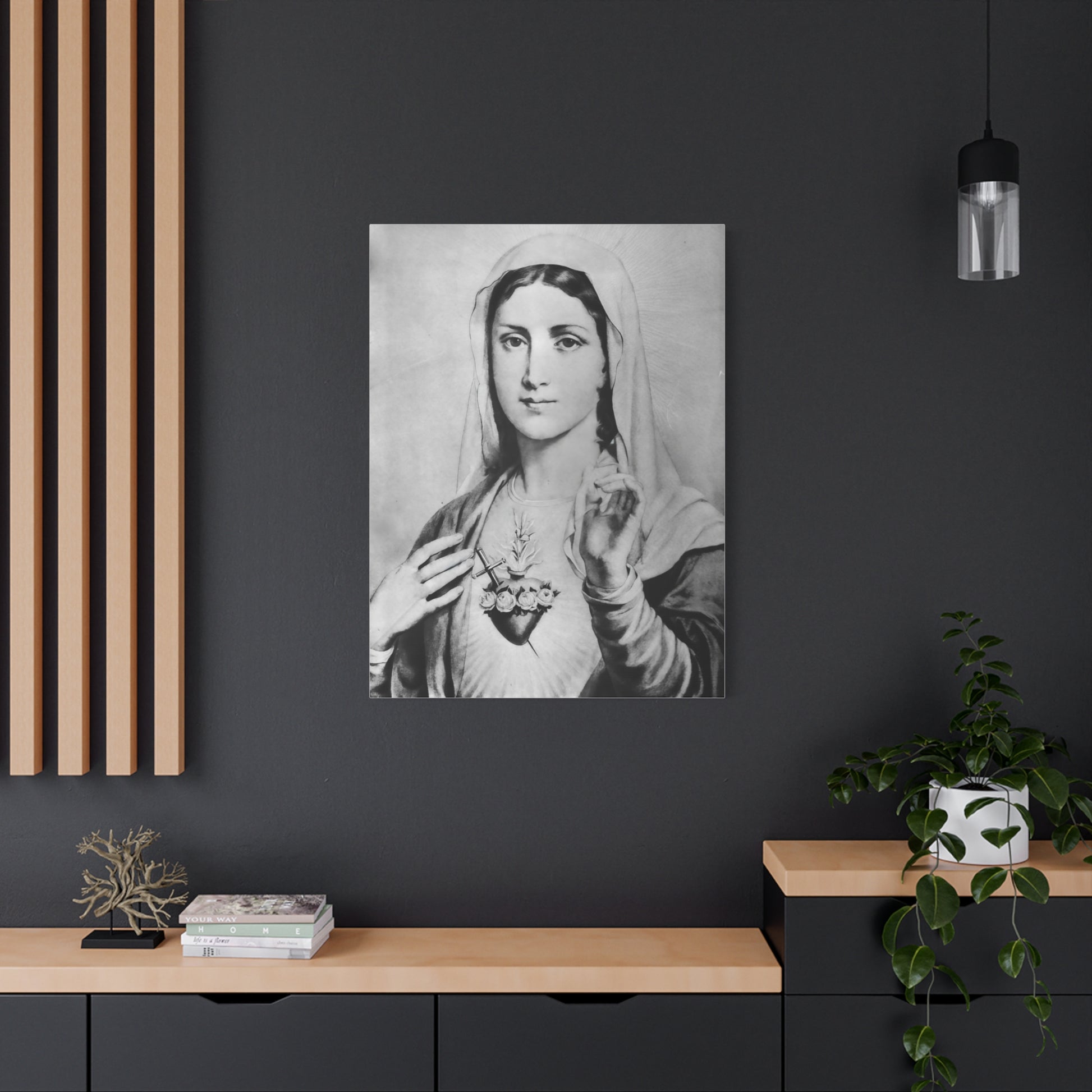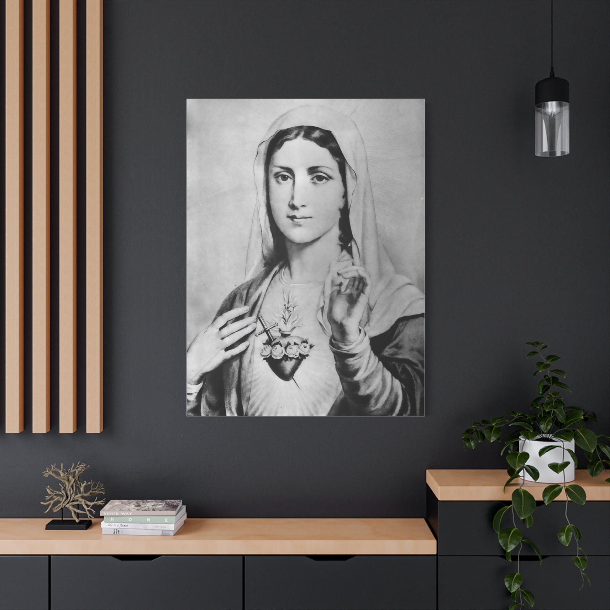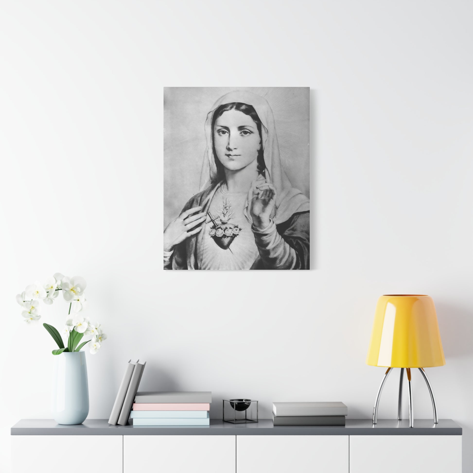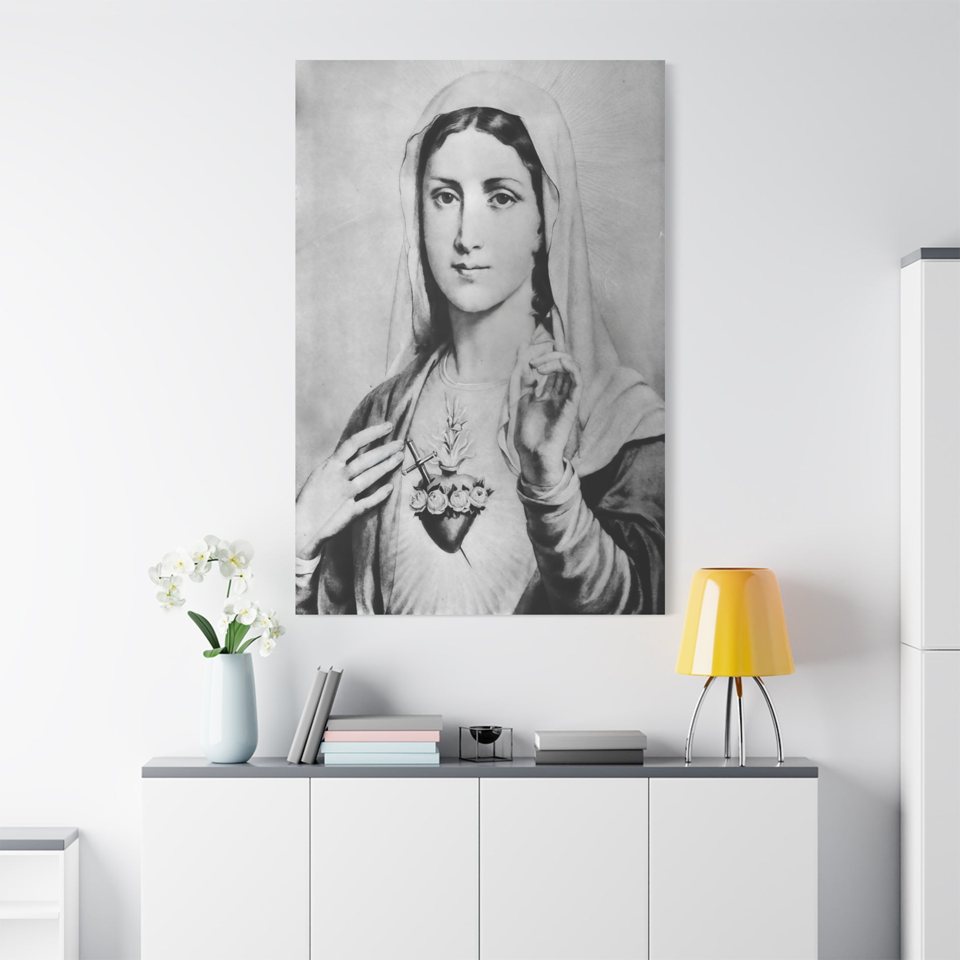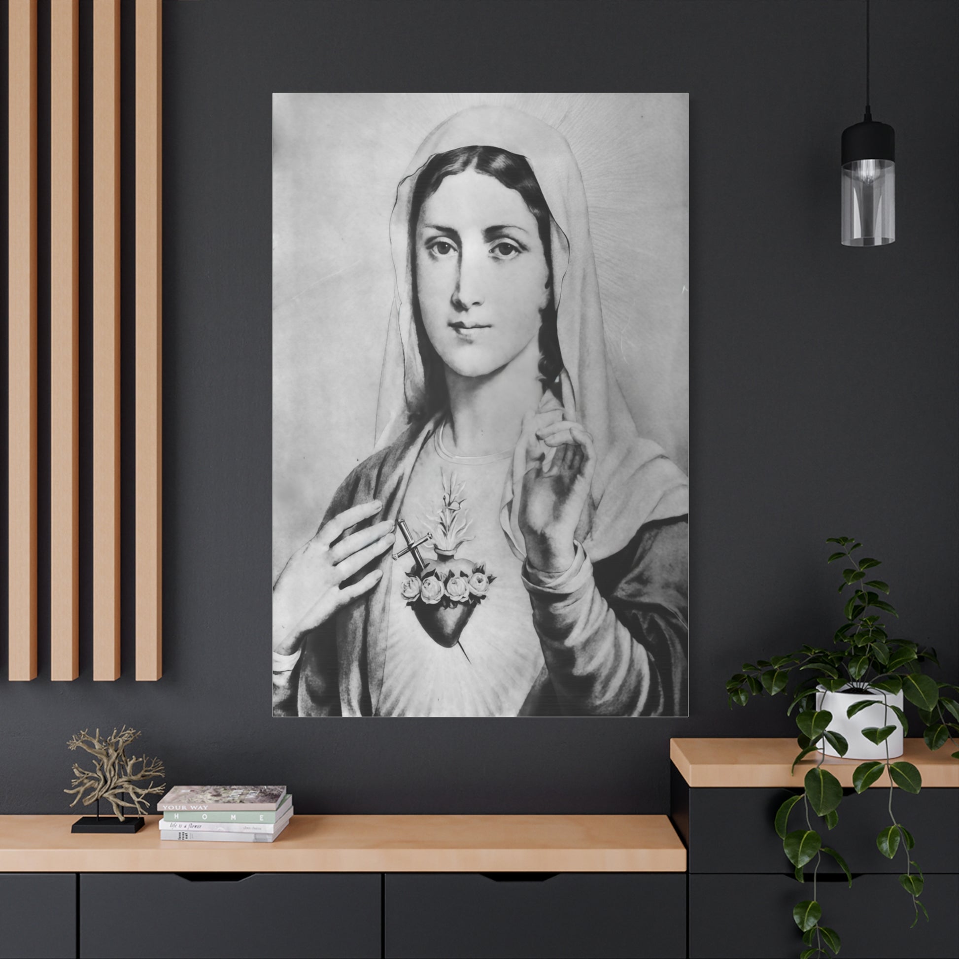 Ready To Hang - Black and White Mother Mary Immaculate Heart Catholic Canvas Wall Art, Christian Decor