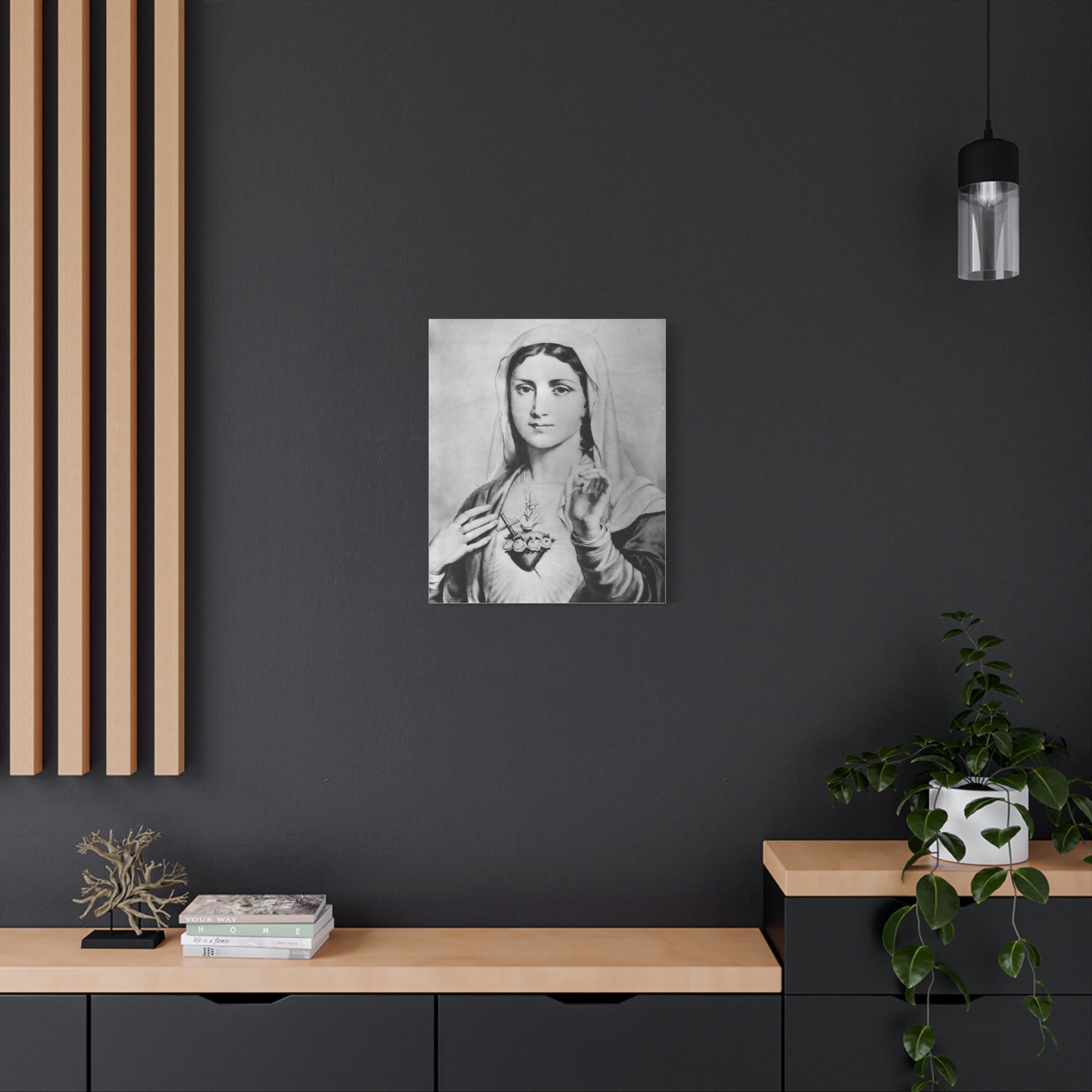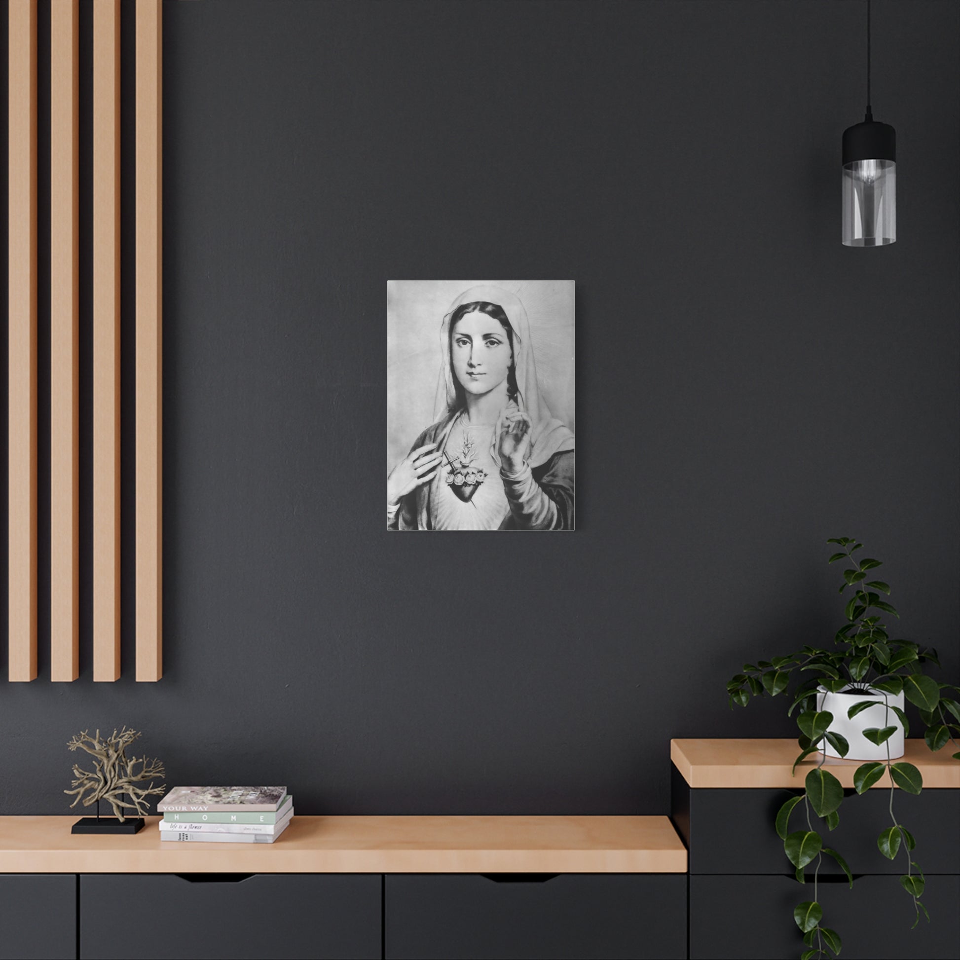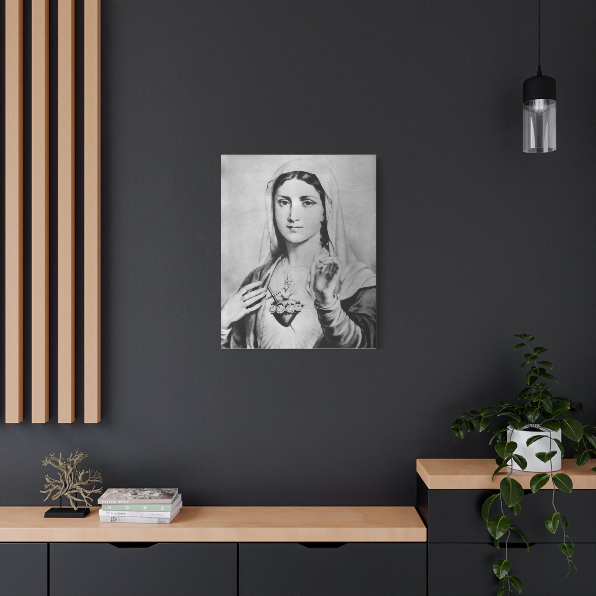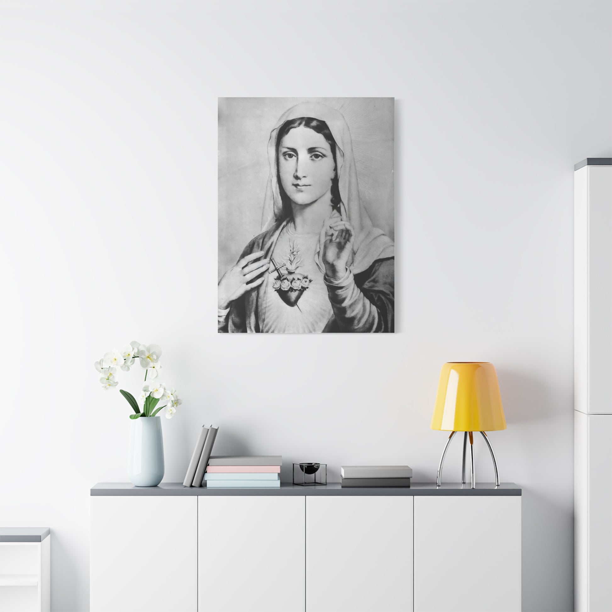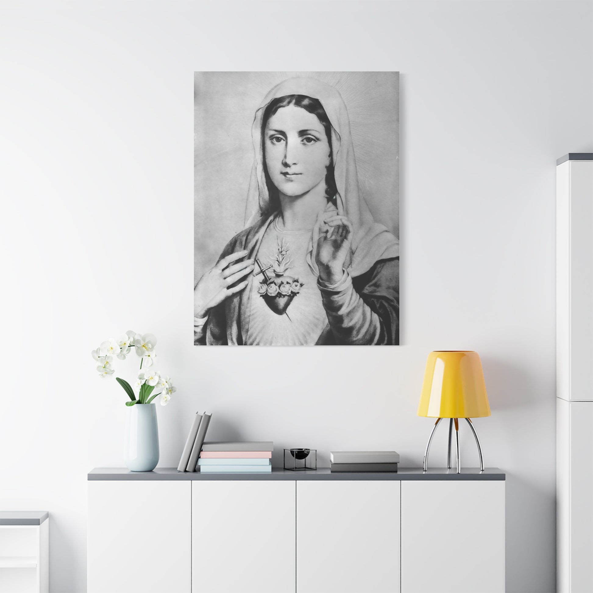 Ready To Hang - Black and White Mother Mary Immaculate Heart Catholic Canvas Wall Art, Christian Decor