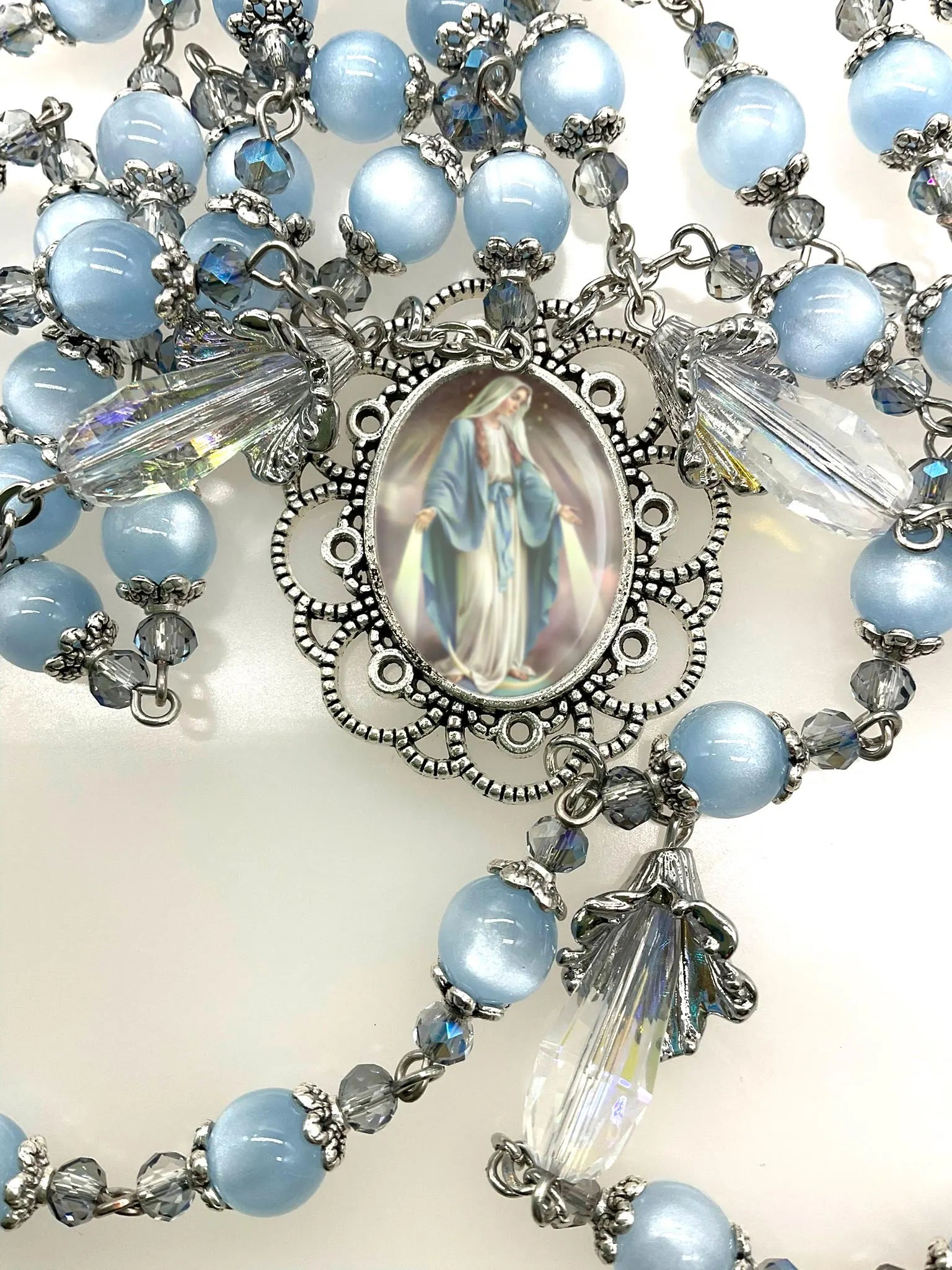• Our Father beads: 10 × 12 mm clear glass drop-shaped beads, artist-designed and inspired by the divine light flowing from Our Lady’s hands