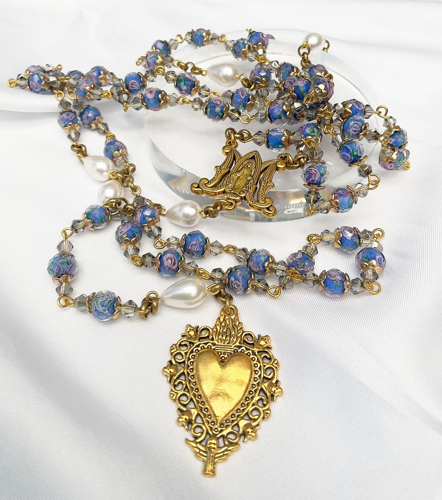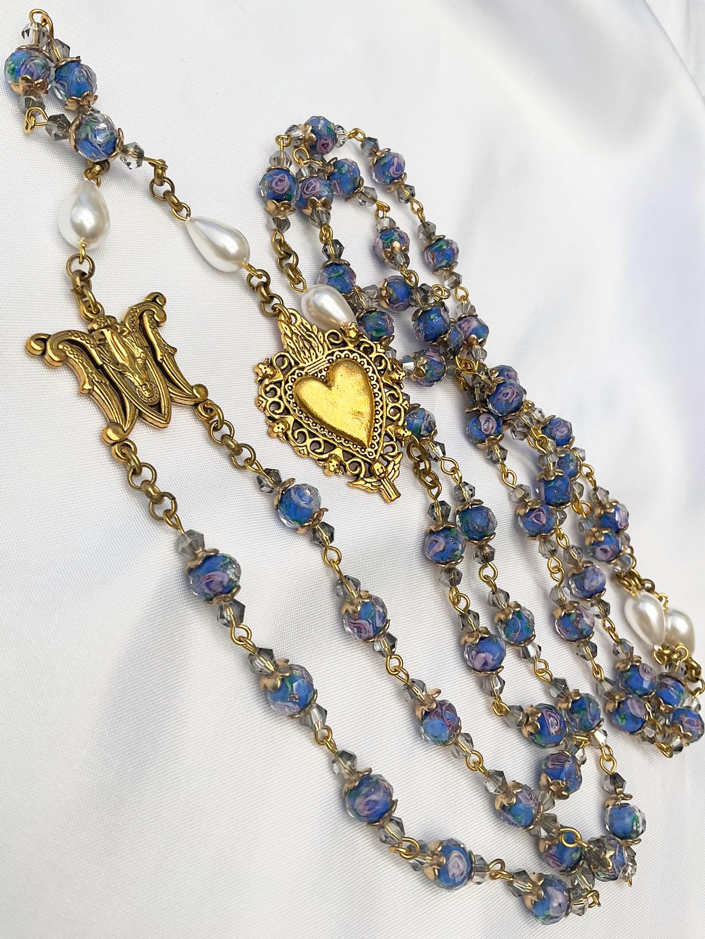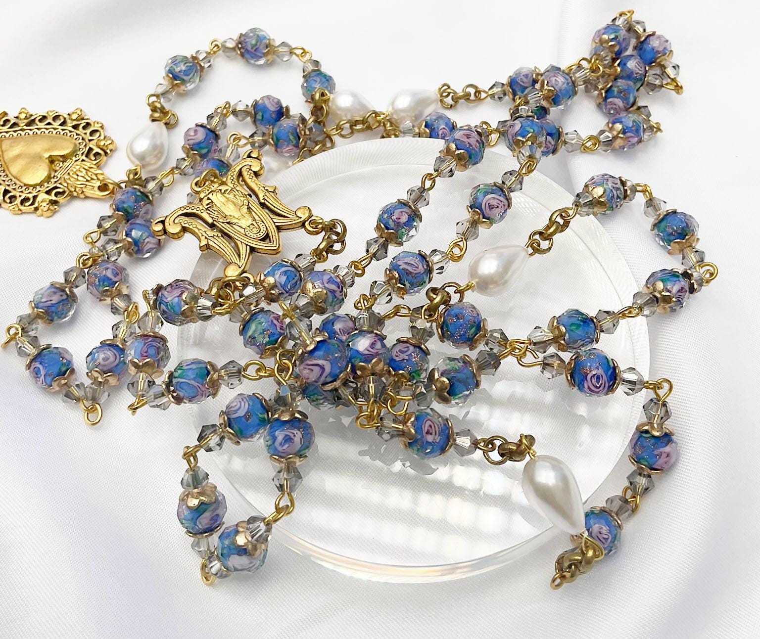 Rosary Immaculate Mary Blue Lampwork Beads Gold Tone Sacred Heart with Pearls Drops