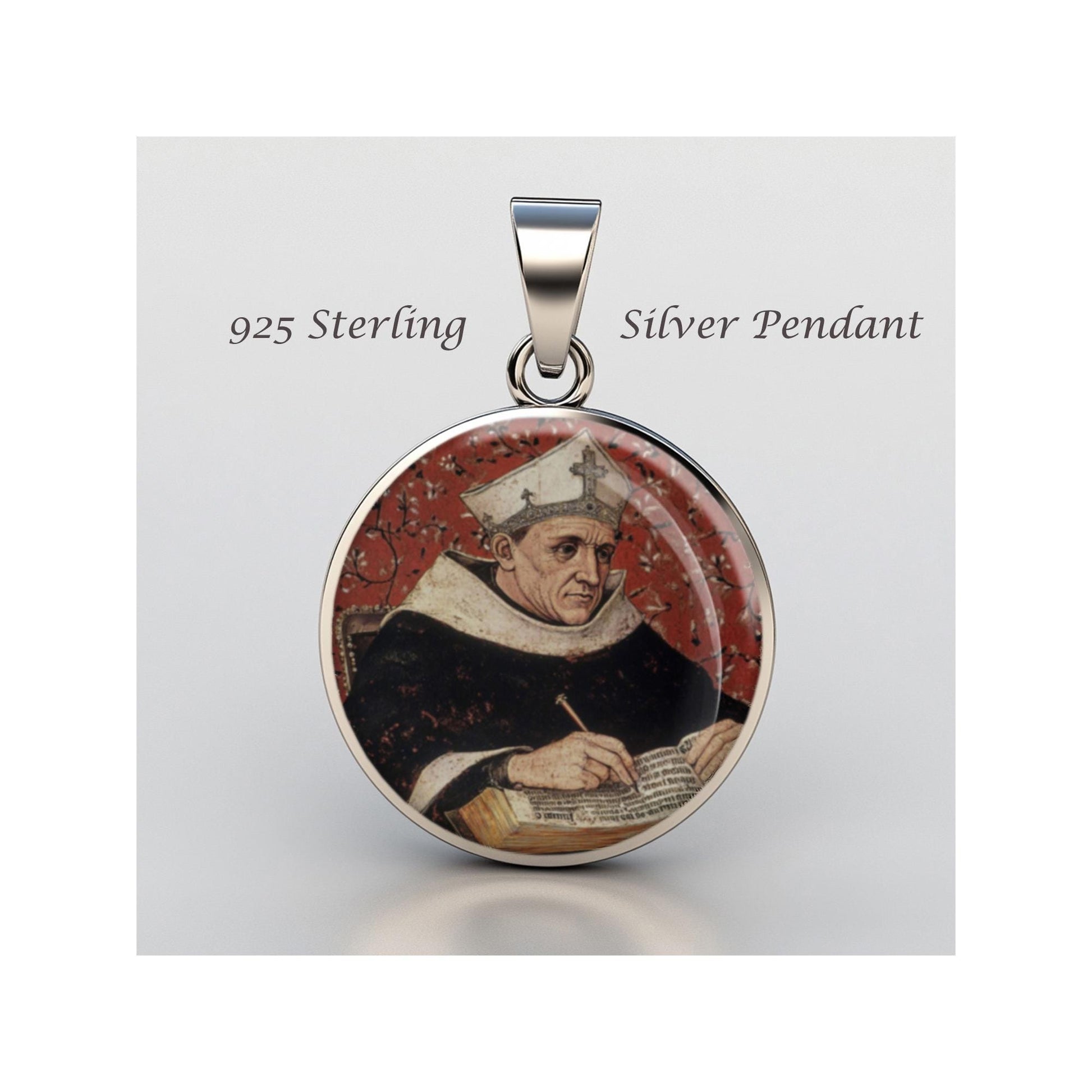 Dedicated to Saint Albertus Magnus, this 20mm sterling silver pendant features a delicate design under a clear glass dome, crafted with high-quality paper. The pendant comes in a beautiful jewelry box, ready for gifting—perfect for birthdays, anniversaries, Christmas, Easter, Baptism, First Communion, Confirmation, Mother's Day, or as a thoughtful gift for a loved one.