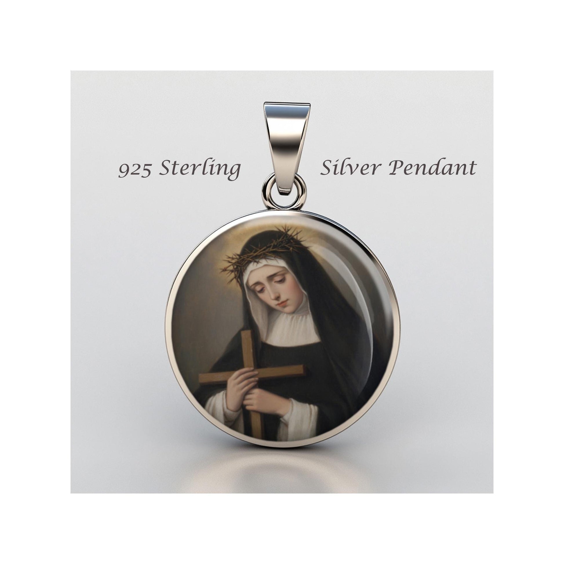 Dedicated to Saint Angela Of Foligno, this 20mm sterling silver pendant features a delicate design under a clear glass dome, crafted with high-quality paper. The pendant comes in a beautiful jewelry box, ready for gifting—perfect for birthdays, anniversaries, Christmas, Easter, Baptism, First Communion, Confirmation, Mother's Day, or as a thoughtful gift for a loved one.