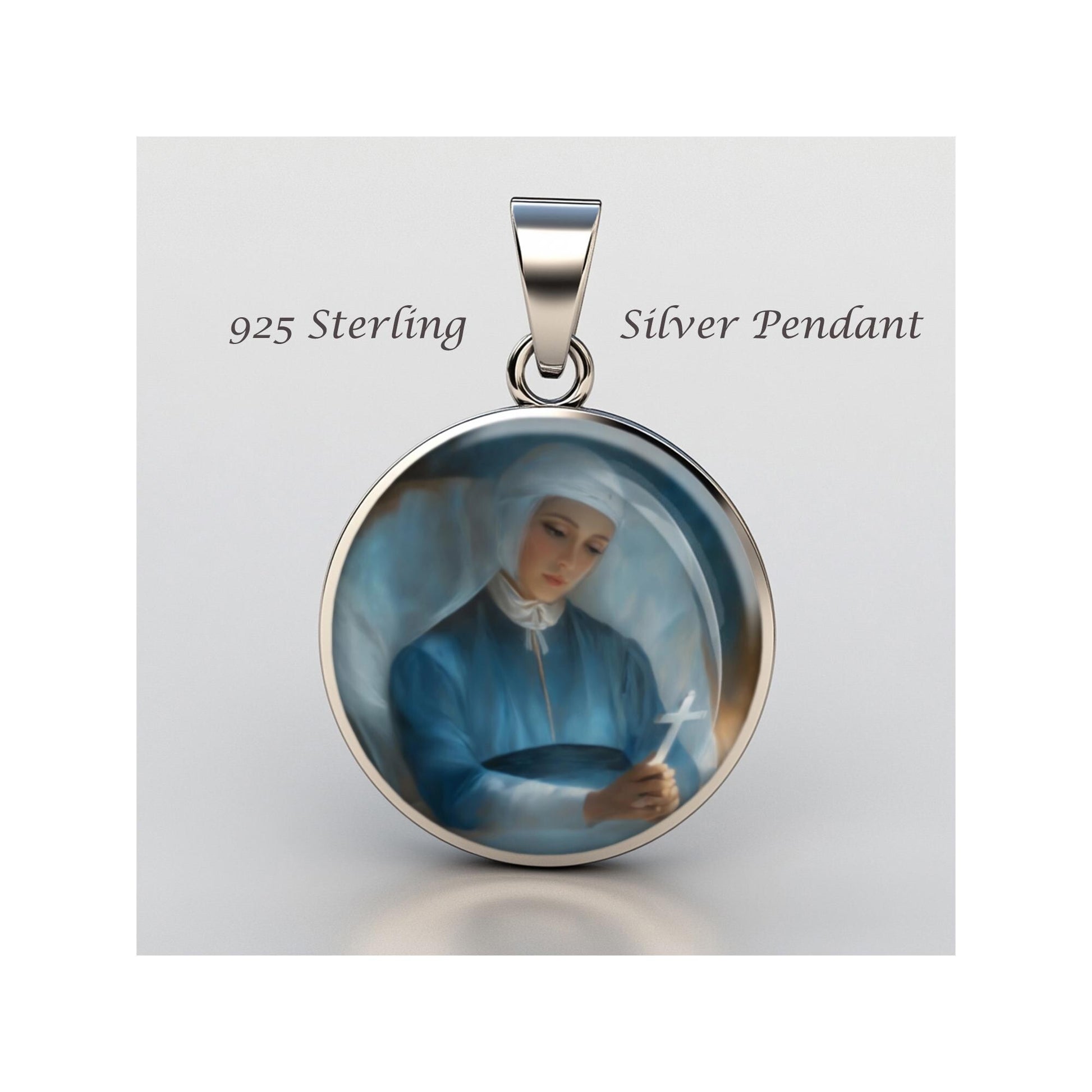 Dedicated to Saint Anne Catherine Emmerich, this 20mm sterling silver pendant features a delicate design under a clear glass dome, crafted with high-quality paper. The pendant comes in a beautiful jewelry box, ready for gifting—perfect for birthdays, anniversaries, Christmas, Easter, Baptism, First Communion, Confirmation, Mother's Day, or as a thoughtful gift for a loved one.