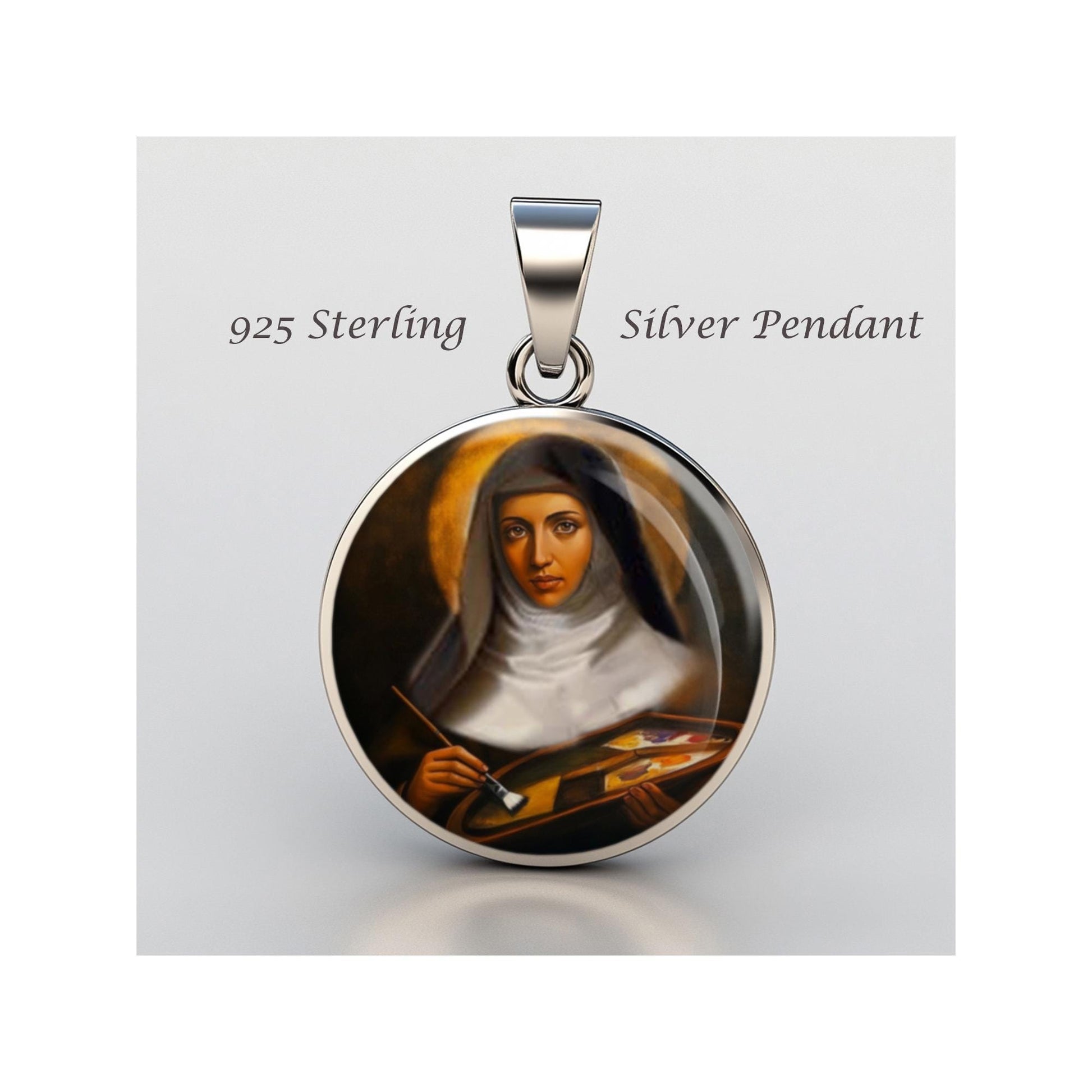 Dedicated to Saint Catherine Of Bologna, this 20mm sterling silver pendant features a delicate design under a clear glass dome, crafted with high-quality paper. The pendant comes in a beautiful jewelry box, ready for gifting—perfect for birthdays, anniversaries, Christmas, Easter, Baptism, First Communion, Confirmation, Mother's Day, or as a thoughtful gift for a loved one.