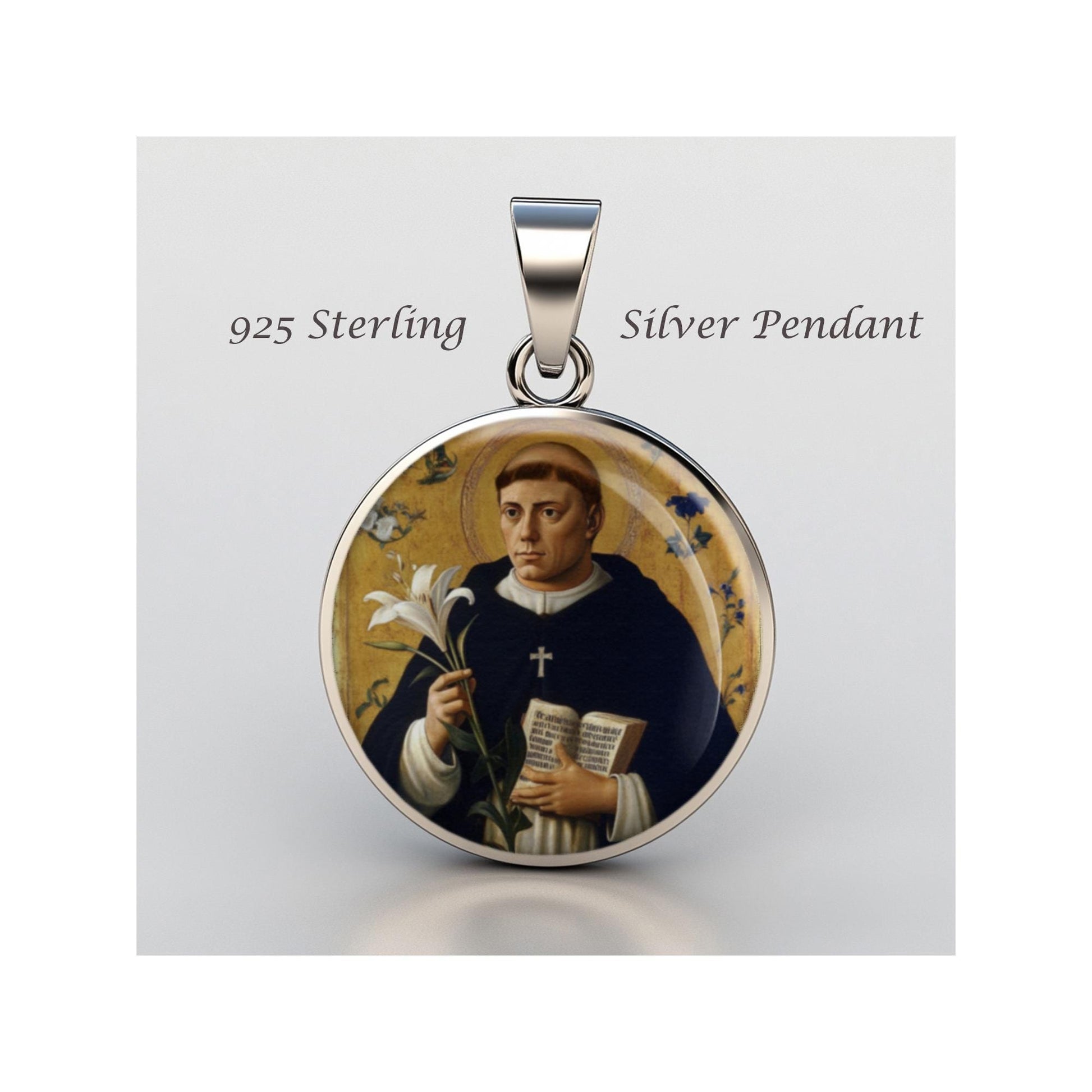 Dedicated to Saint Dominic Dominique, this 20mm sterling silver pendant features a delicate design under a clear glass dome, crafted with high-quality paper. The pendant comes in a beautiful jewelry box, ready for gifting—perfect for birthdays, anniversaries, Christmas, Easter, Baptism, First Communion, Confirmation, Mother's Day, or as a thoughtful gift for a loved one.