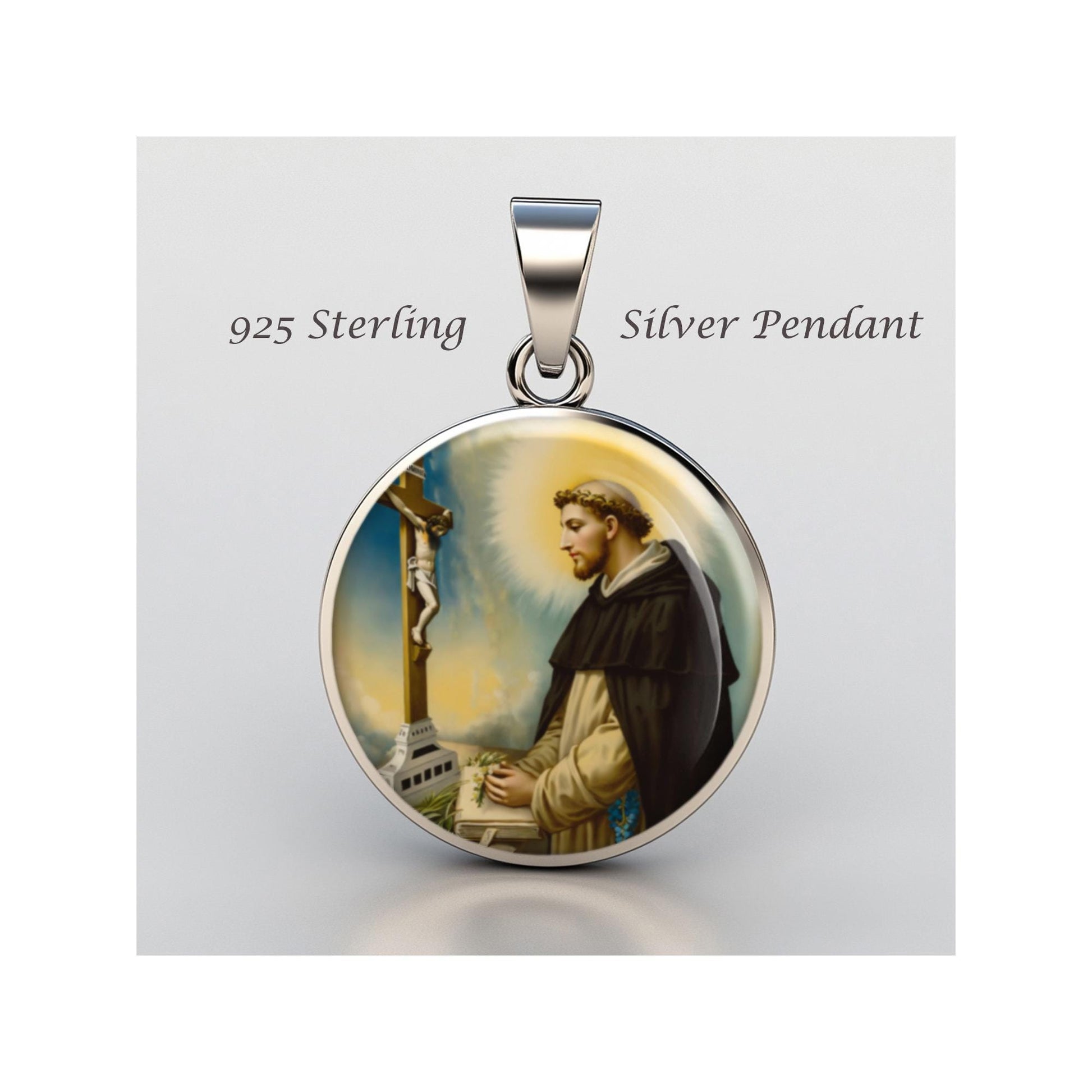 Dedicated to Saint Dominic, this 20mm sterling silver pendant features a delicate design under a clear glass dome, crafted with high-quality paper. The pendant comes in a beautiful jewelry box, ready for gifting—perfect for birthdays, anniversaries, Christmas, Easter, Baptism, First Communion, Confirmation, Mother's Day, or as a thoughtful gift for a loved one.
