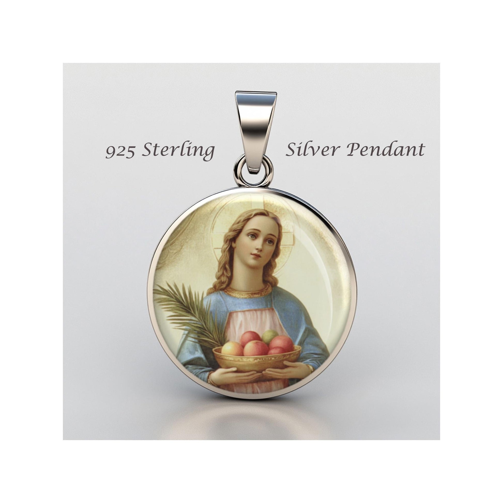 Dedicated to Saint Dorothy Dorothea, this 20mm sterling silver pendant features a delicate design under a clear glass dome, crafted with high-quality paper. The pendant comes in a beautiful jewelry box, ready for gifting—perfect for birthdays, anniversaries, Christmas, Easter, Baptism, First Communion, Confirmation, Mother's Day, or as a thoughtful gift for a loved one.