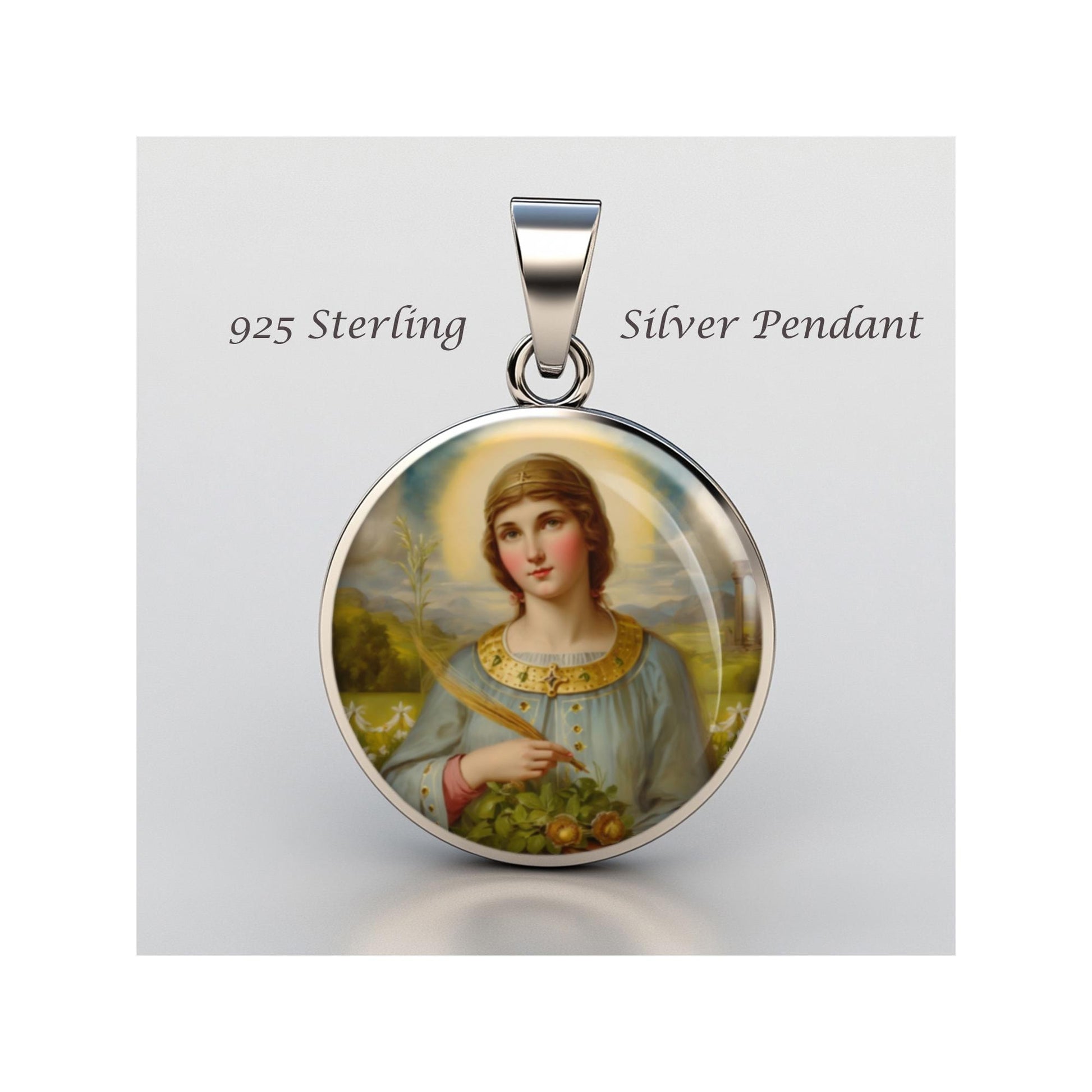 Dedicated to Saint Dorothy, this 20mm sterling silver pendant features a delicate design under a clear glass dome, crafted with high-quality paper. The pendant comes in a beautiful jewelry box, ready for gifting—perfect for birthdays, anniversaries, Christmas, Easter, Baptism, First Communion, Confirmation, Mother's Day, or as a thoughtful gift for a loved one.