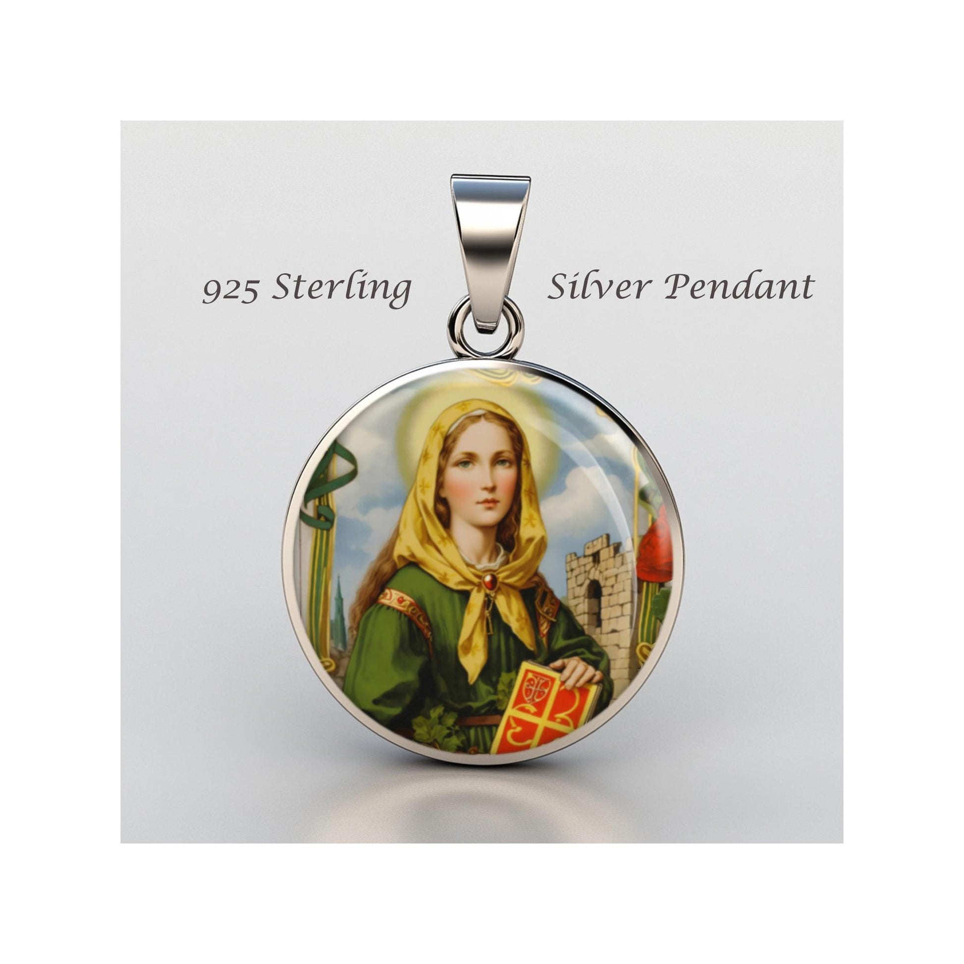 Dedicated to Saint Dymphna, this 20mm sterling silver pendant features a delicate design under a clear glass dome, crafted with high-quality paper. The pendant comes in a beautiful jewelry box, ready for gifting—perfect for birthdays, anniversaries, Christmas, Easter, Baptism, First Communion, Confirmation, Mother's Day, or as a thoughtful gift for a loved one.